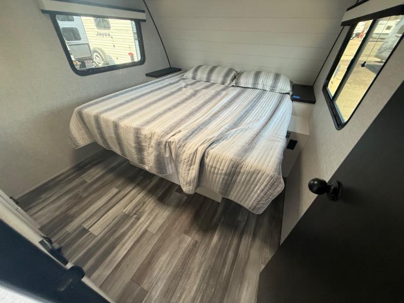 With any Jay Feather travel trailer by Jayco, you will enjoy lightweight towing, convenient exterior amenities, and at-home comforts inside! The Overlander 1 Solar Package included within the Jay Sport Package comes with a 200W solar panel and a 30-amp digital controller so you can enjoy some off-grid camping. There is also a modern graphics package with a dual-colored sidewall, LCI Solid Step fold-down aluminum tread steps on the main entry door, and Climate Shield 0 -100° F tested weather insulation package that will allow you to camp in all sorts of climates. The Customer Value Package will make time outdoors easier than ever with a power tongue jack and a Rock Solid stabilizer system, plus American-made nitro-filled Goodyear tires with self-adjusting electric brakes. More exterior features include a Keyed-Alike locking system, marine grade exterior speakers, a Magnum Truss roof system, and the list goes on! And we haven't even touched on the interior comforts, like the residential style seamless countertops and vinyl flooring throughout, decorative backsplash, handcrafted hardwood door/drawer fronts, and multiple USB charging ports to keep you going!
