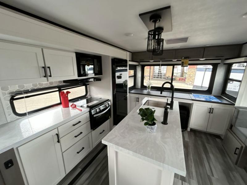 Perfect for weekend trips or extended stays, this travel trailer is the one! You will find a rear desk with an ottoman plus overhead storage if you plan to work while you're away from home. The dual opposing slides in the combined kitchen and living area will create an open floorplan, and the kitchen island will provide the chef of your group with more counter space. There is a tri-fold sofa and booth dinette that double as seating and sleeping space, and the full bath onboard will keep everyone clean. Don't overlook the front private bedroom with a queen bed and plenty of storage space for your belongings!