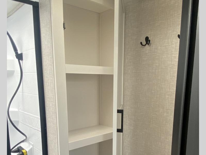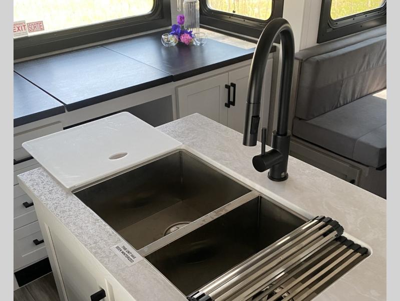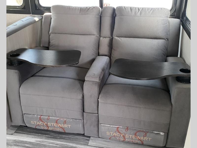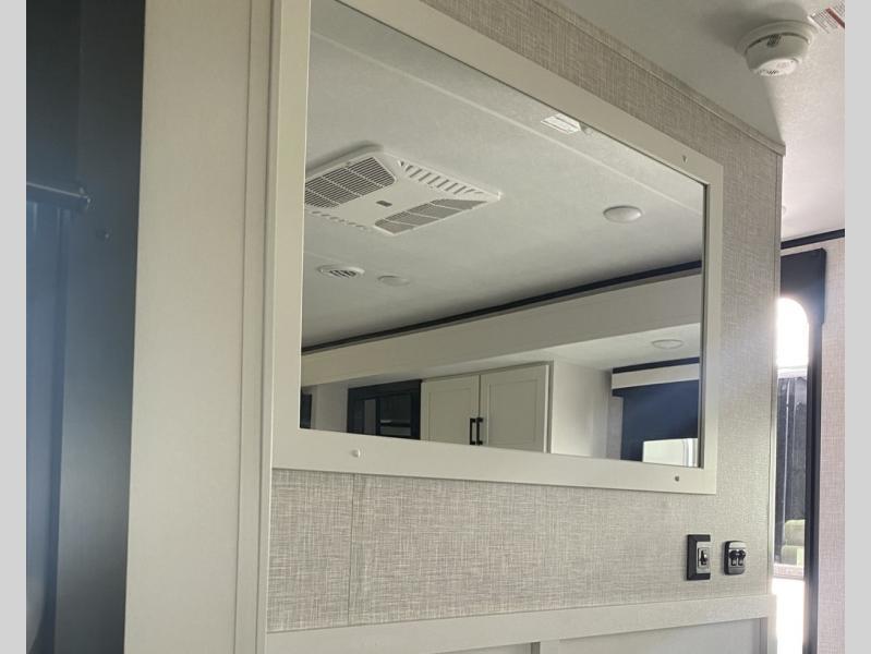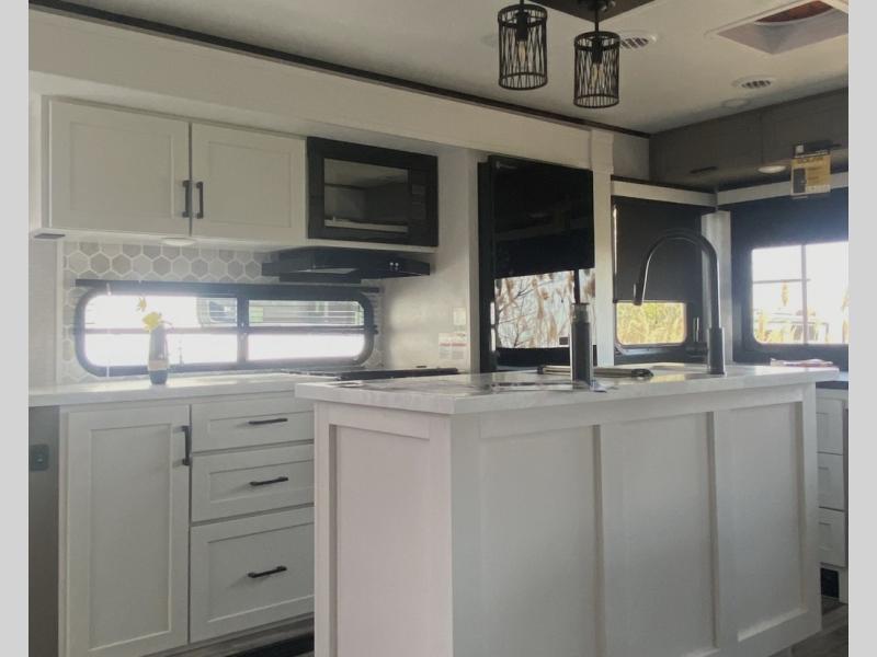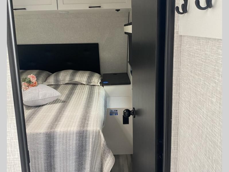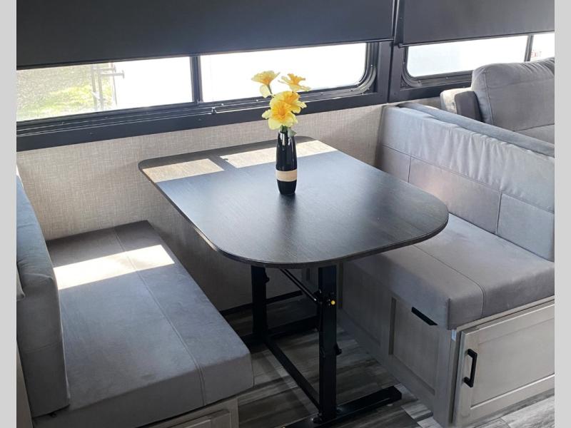 Perfect for weekend trips or extended stays, this travel trailer is the one! You will find a rear desk with an ottoman plus overhead storage if you plan to work while you're away from home. The dual opposing slides in the combined kitchen and living area will create an open floorplan, and the kitchen island will provide the chef of your group with more counter space. There is a tri-fold sofa and booth dinette that double as seating and sleeping space, and the full bath onboard will keep everyone clean. Don't overlook the front private bedroom with a queen bed and plenty of storage space for your belongings!