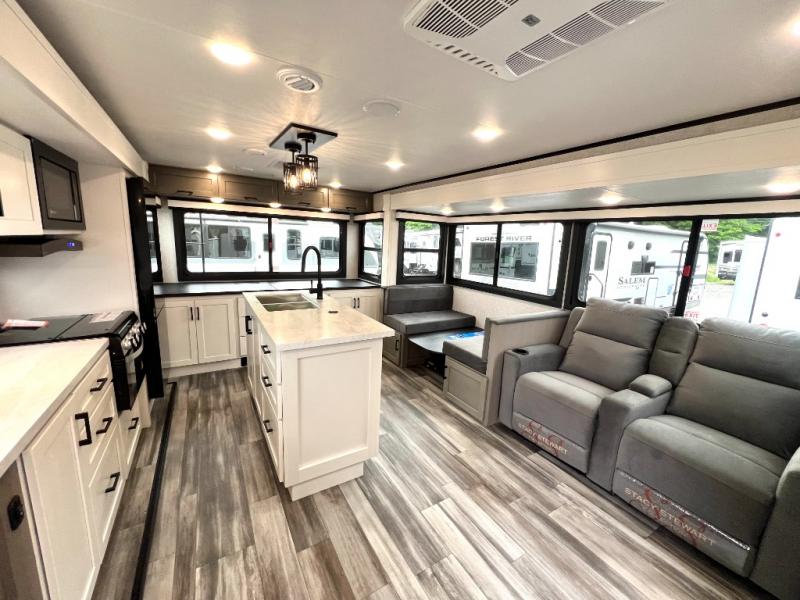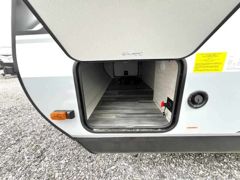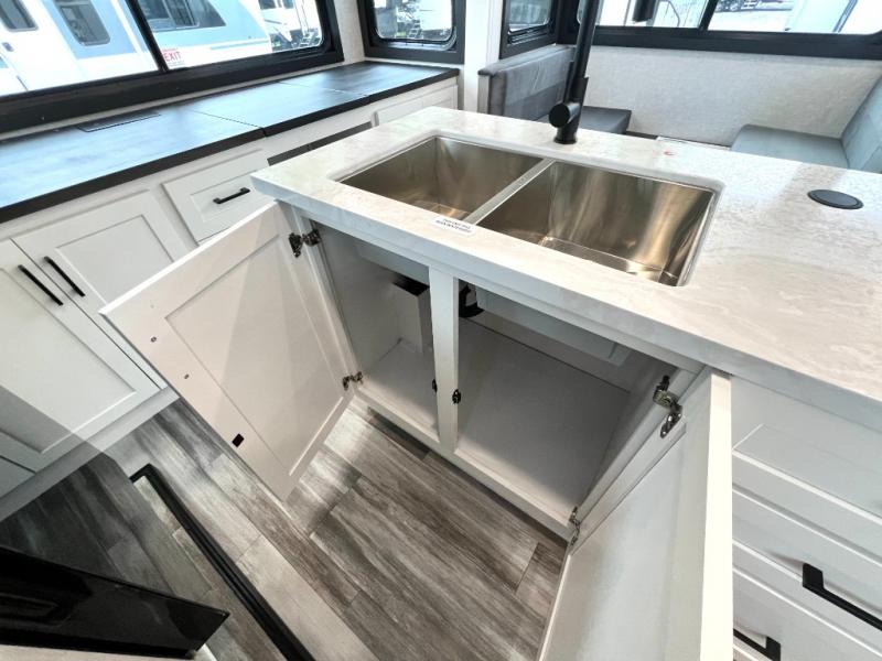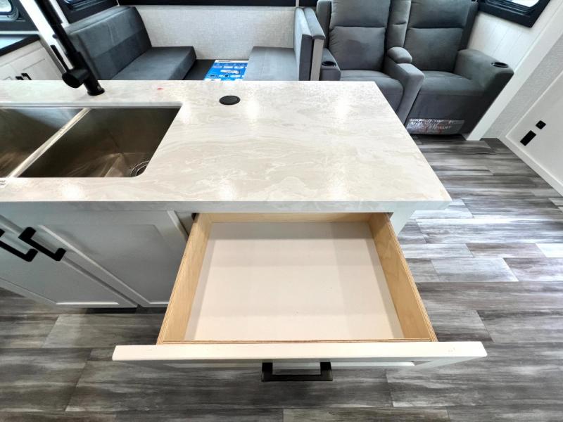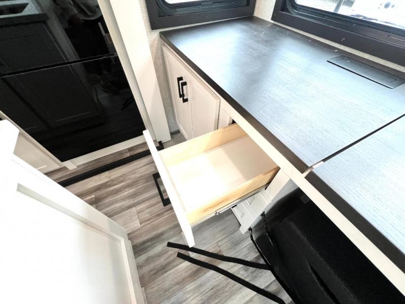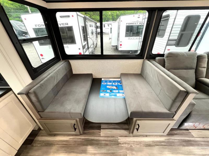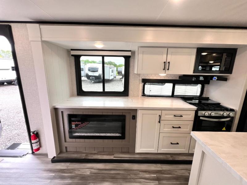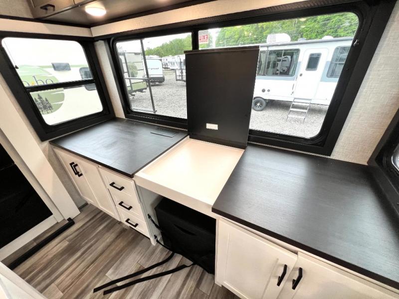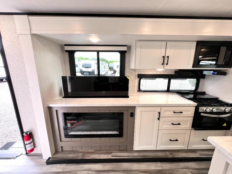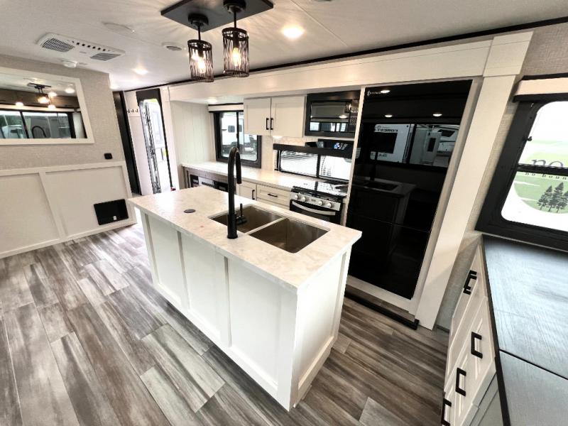 Perfect for weekend trips or extended stays, this travel trailer is the one! You will find a rear desk with an ottoman plus overhead storage if you plan to work while you're away from home. The dual opposing slides in the combined kitchen and living area will create an open floorplan, and the kitchen island will provide the chef of your group with more counter space. There is a tri-fold sofa and booth dinette that double as seating and sleeping space, and the full bath onboard will keep everyone clean. Don't overlook the front private bedroom with a queen bed and plenty of storage space for your belongings!