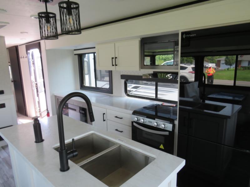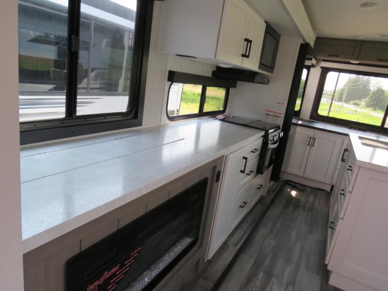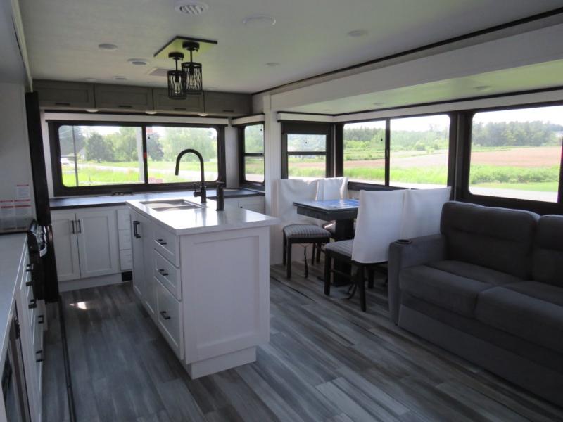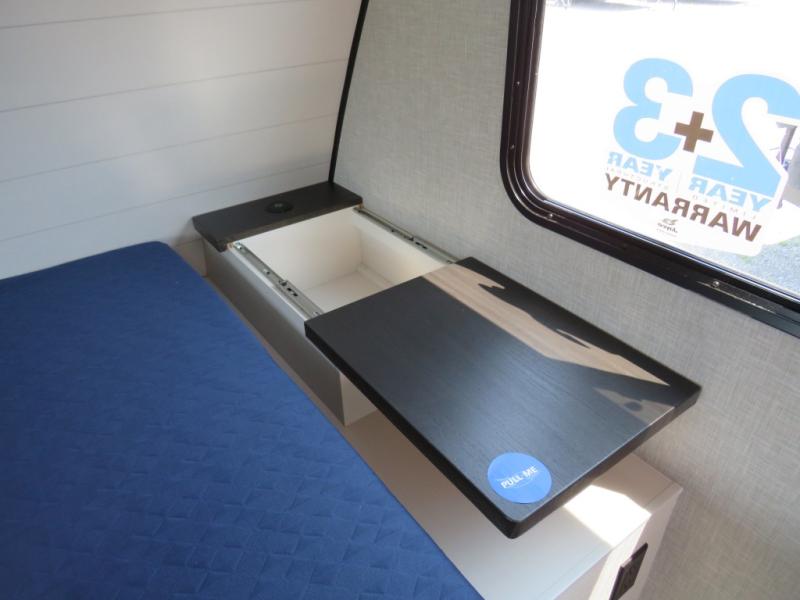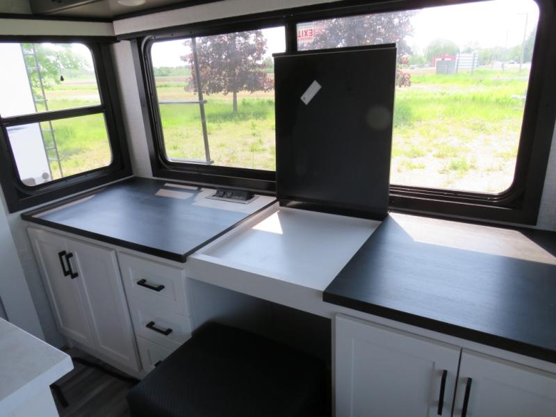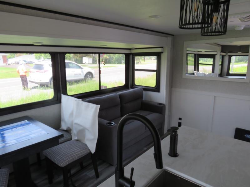 Perfect for weekend trips or extended stays, this travel trailer is the one! You will find a rear desk with an ottoman plus overhead storage if you plan to work while you're away from home. The dual opposing slides in the combined kitchen and living area will create an open floorplan, and the kitchen island will provide the chef of your group with more counter space. There is a tri-fold sofa and booth dinette that double as seating and sleeping space, and the full bath onboard will keep everyone clean. Don't overlook the front private bedroom with a queen bed and plenty of storage space for your belongings!