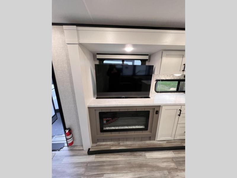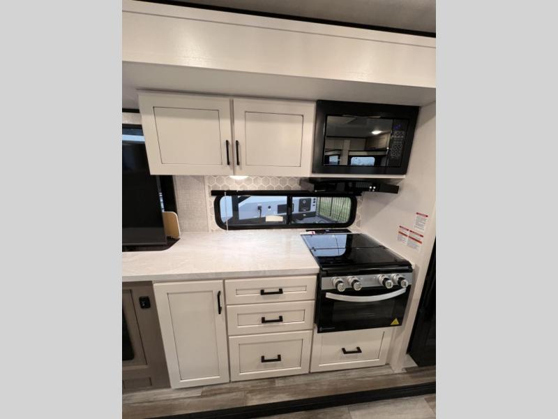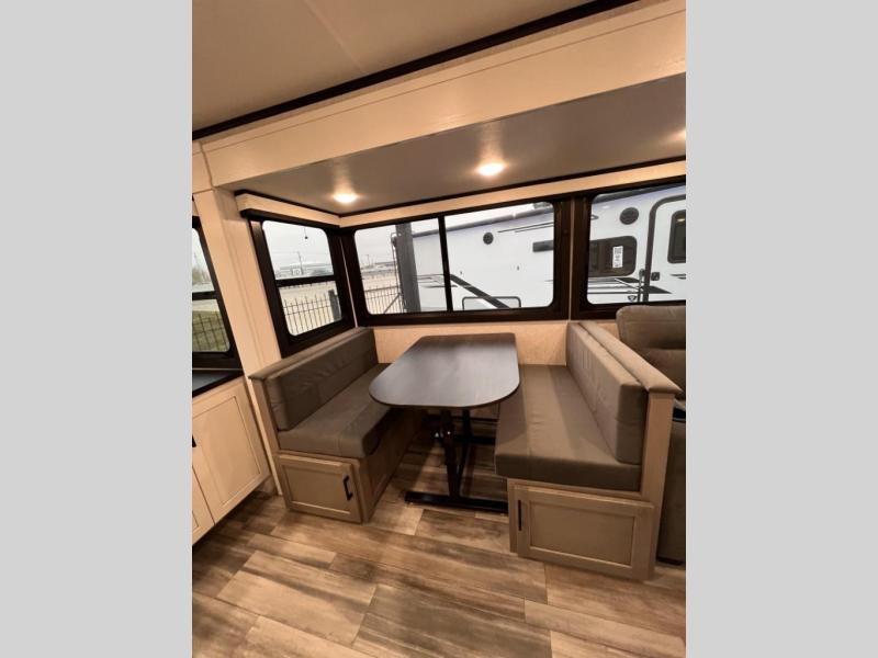 Perfect for weekend trips or extended stays, this travel trailer is the one! You will find a rear desk with an ottoman plus overhead storage if you plan to work while you're away from home. The dual opposing slides in the combined kitchen and living area will create an open floorplan, and the kitchen island will provide the chef of your group with more counter space. There is a tri-fold sofa and booth dinette that double as seating and sleeping space, and the full bath onboard will keep everyone clean. Don't overlook the front private bedroom with a queen bed and plenty of storage space for your belongings!