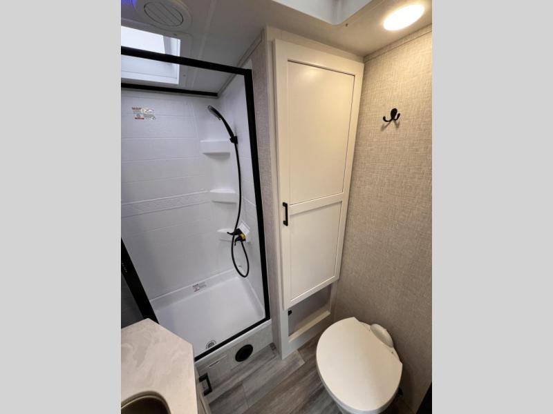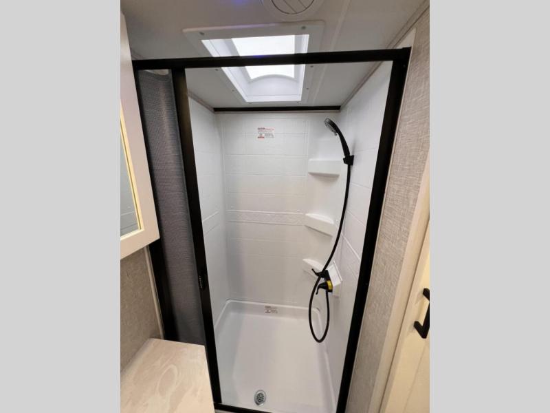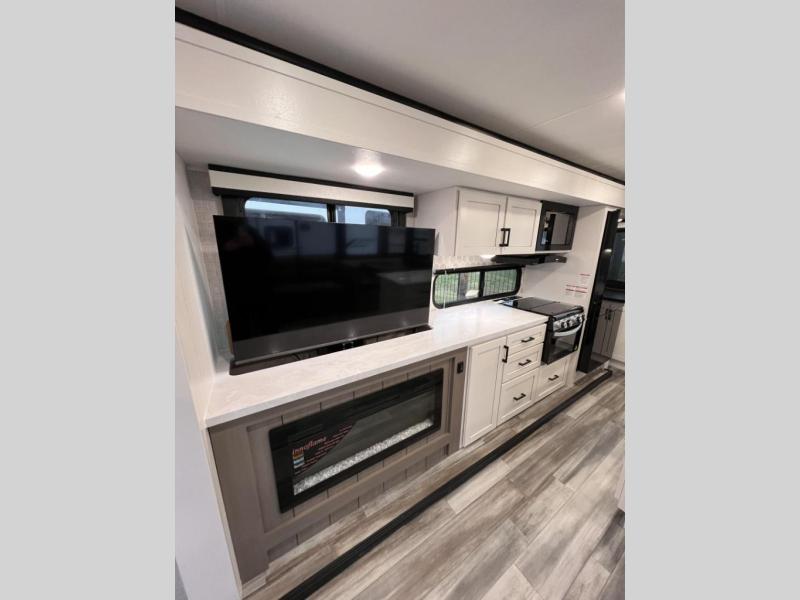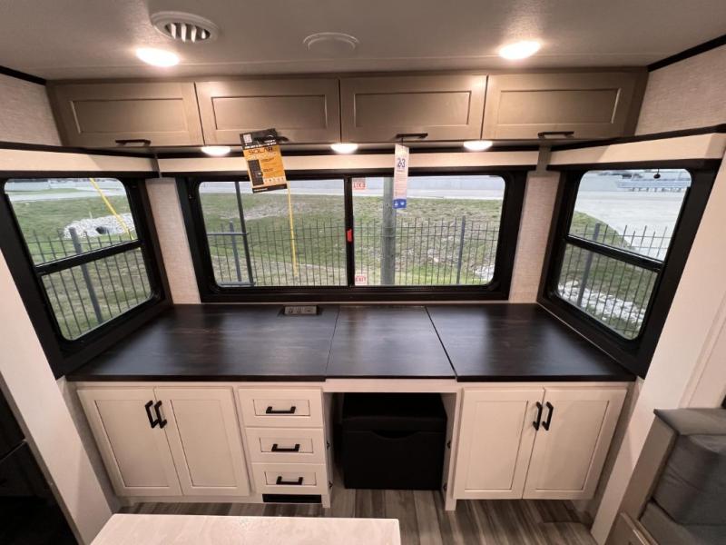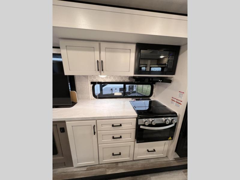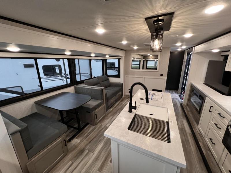 The amenities for 2025 don’t stop there! In the kitchen area, you'll find seamless countertops throughout, a stainless-steel sink with a high-rise faucet and pull-out sprayer. You'll also be blown away by the all-new InVision Suite appliance package with an 11 cubic foot 12V fridge, standard in all Jay Feather models. This fridge has a shiny, black glass front with a two-door fridge over the freezer. Store more on the go with oversized cabinet doors and drawers. The cabinet doors are attached with hidden hinges to give each Jay Feather that sought-after residential look and feel.
