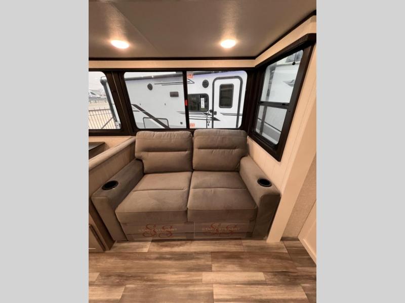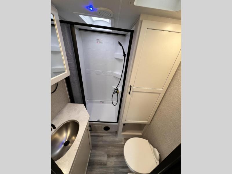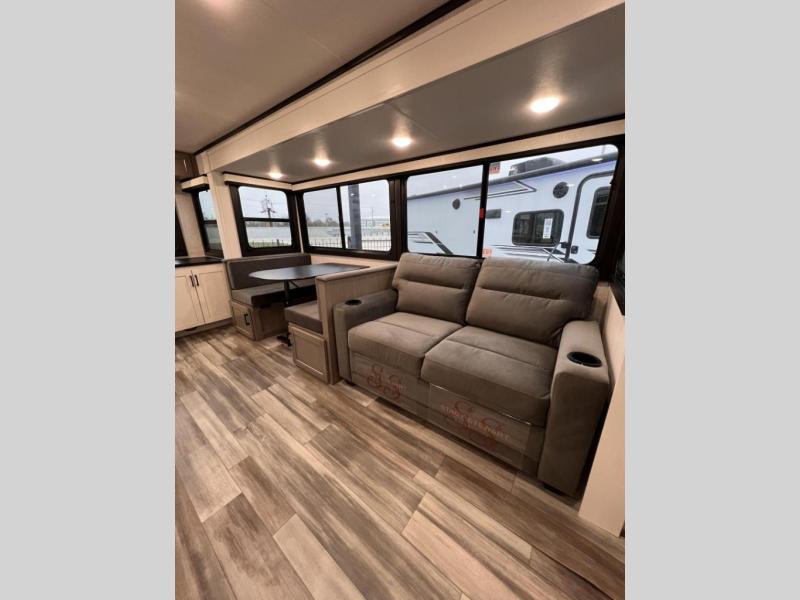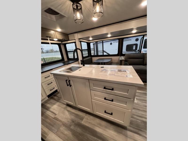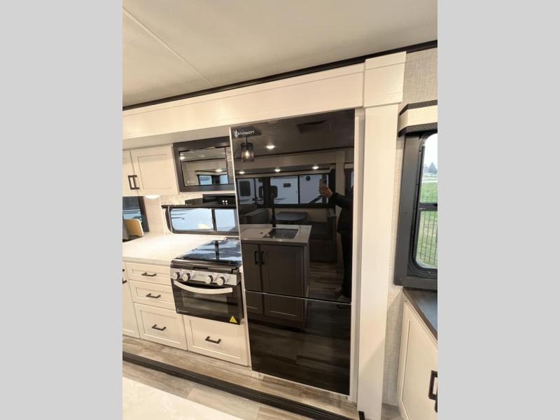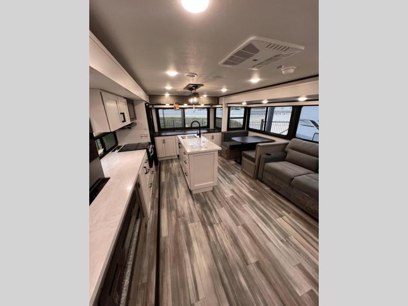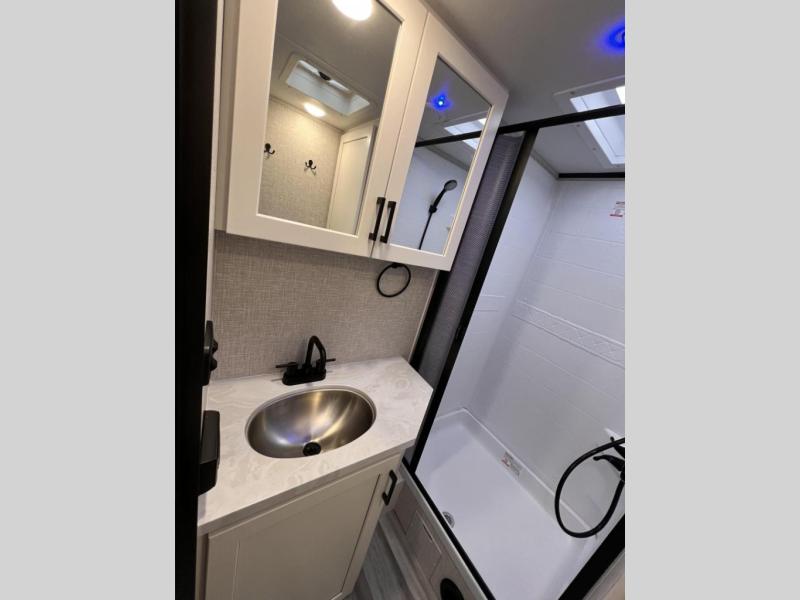 The amenities for 2025 don’t stop there! In the kitchen area, you'll find seamless countertops throughout, a stainless-steel sink with a high-rise faucet and pull-out sprayer. You'll also be blown away by the all-new InVision Suite appliance package with an 11 cubic foot 12V fridge, standard in all Jay Feather models. This fridge has a shiny, black glass front with a two-door fridge over the freezer. Store more on the go with oversized cabinet doors and drawers. The cabinet doors are attached with hidden hinges to give each Jay Feather that sought-after residential look and feel.