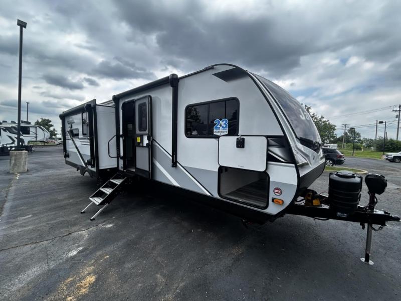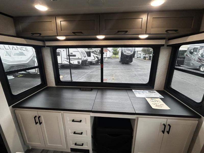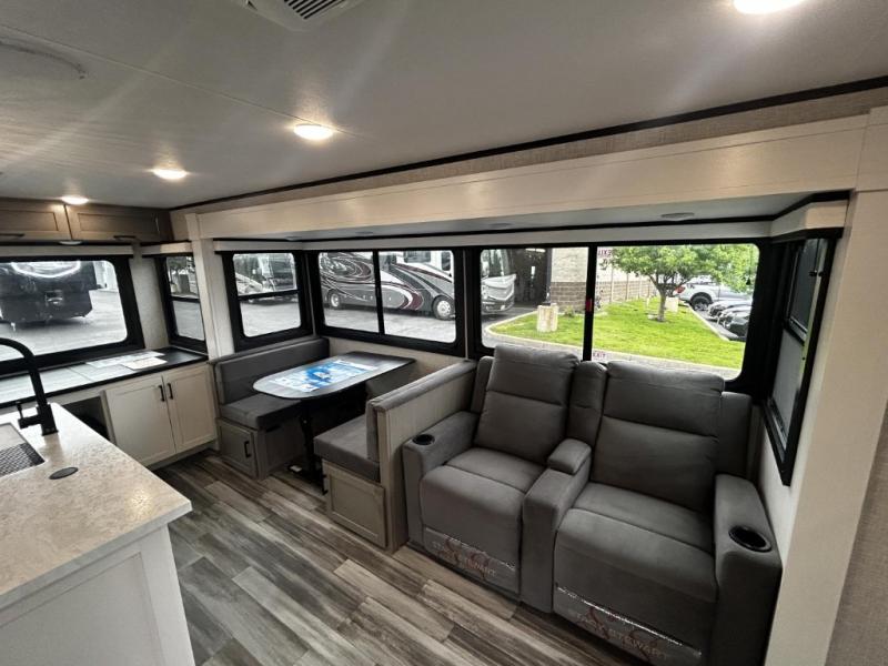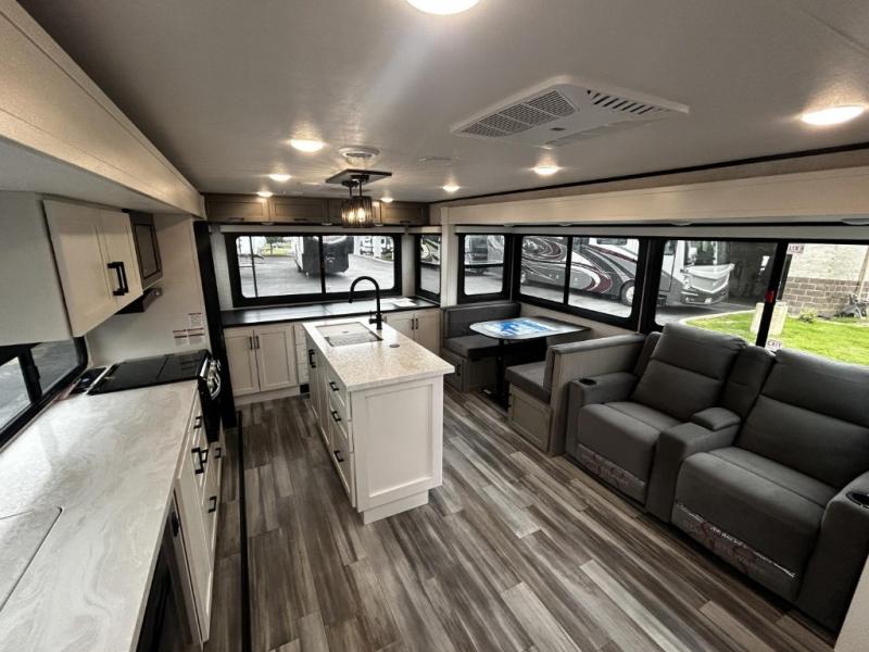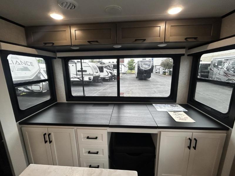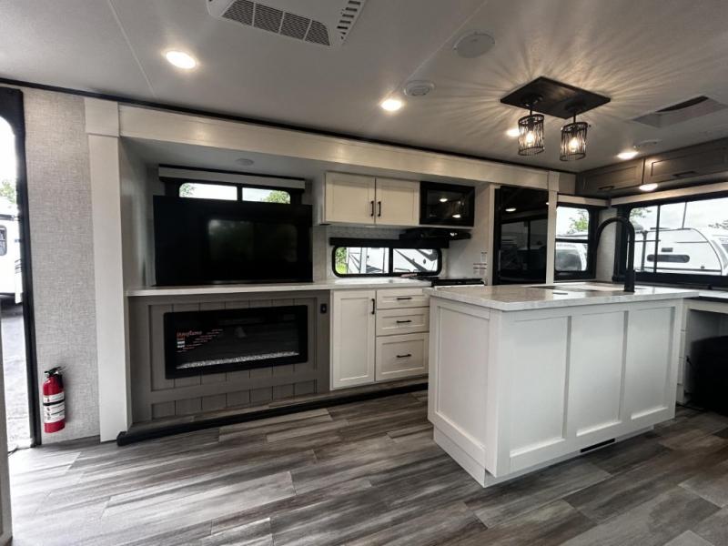 Perfect for weekend trips or extended stays, this travel trailer is the one! You will find a rear desk with an ottoman plus overhead storage if you plan to work while you're away from home. The dual opposing slides in the combined kitchen and living area will create an open floorplan, and the kitchen island will provide the chef of your group with more counter space. There is a tri-fold sofa and booth dinette that double as seating and sleeping space, and the full bath onboard will keep everyone clean. Don't overlook the front private bedroom with a queen bed and plenty of storage space for your belongings!