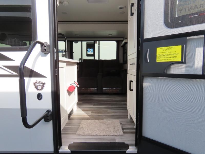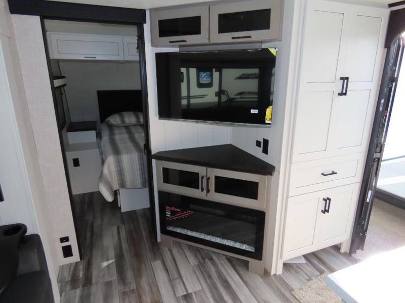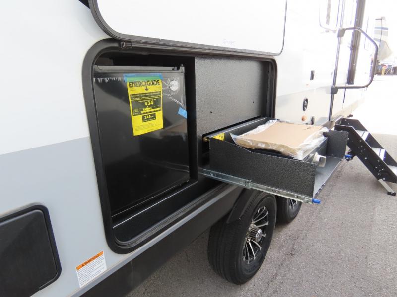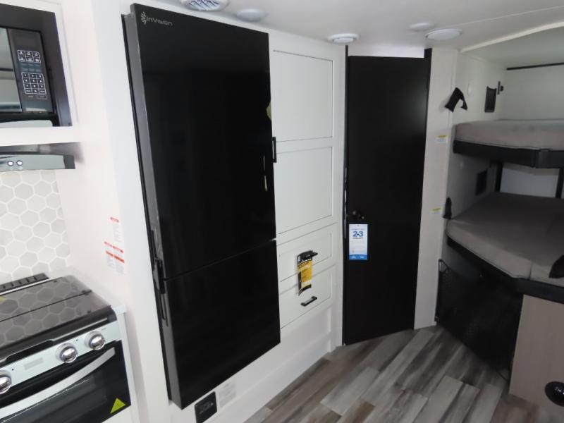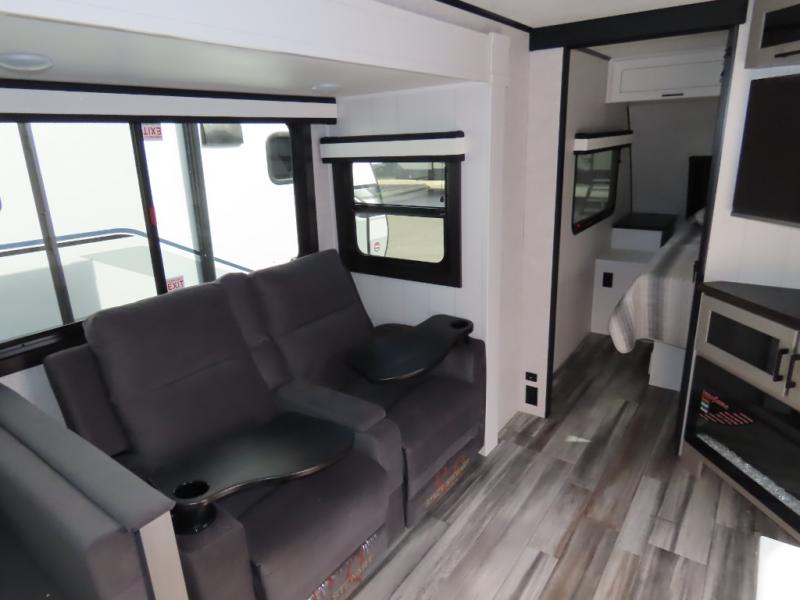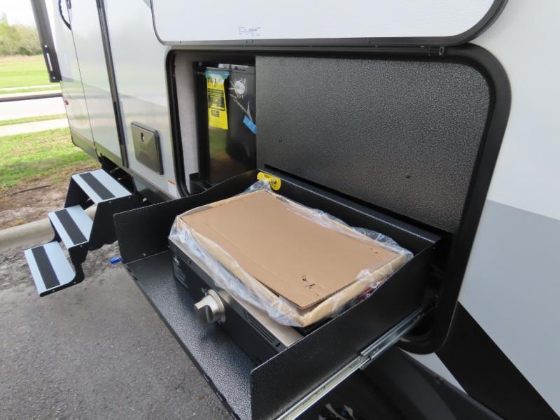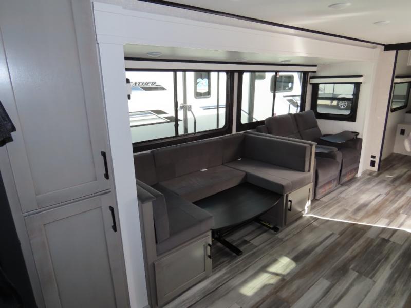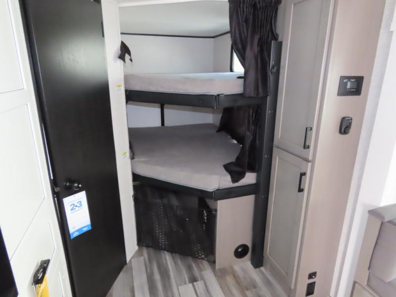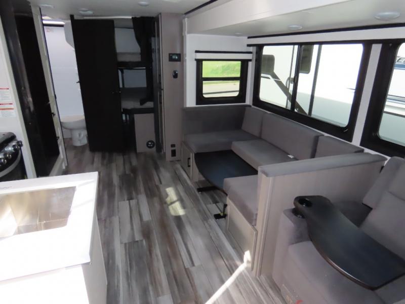 Your whole crew can join along on camping trips with this travel trailer that can sleep ten each night! Not only are there double-size bunks, but also a U-shaped dinette, tri-fold sofa, plus a queen bed in the front bedroom! There is also pass-thru storage under the bed so luggage, board games, and blankets can be kept out of the way. The chef of your group can cook indoors on the three burner cooktop or at the outside kitchen on the pull-out griddle. This model also includes a full bath with one of the dual entry doors for added convenience!