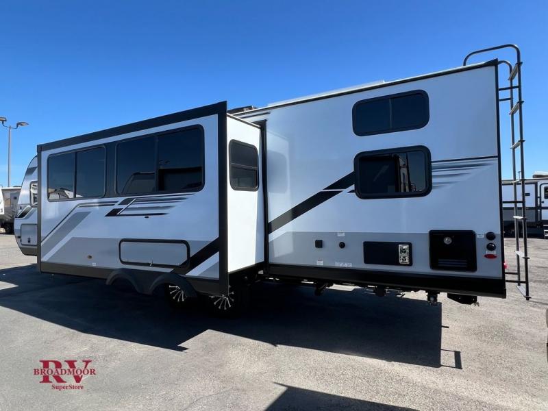 Your whole crew can join along on camping trips with this travel trailer that can sleep ten each night! Not only are there double-size bunks, but also a U-shaped dinette, tri-fold sofa, plus a queen bed in the front bedroom! There is also pass-thru storage under the bed so luggage, board games, and blankets can be kept out of the way. The chef of your group can cook indoors on the three burner cooktop or at the outside kitchen on the pull-out griddle. This model also includes a full bath with one of the dual entry doors for added convenience!