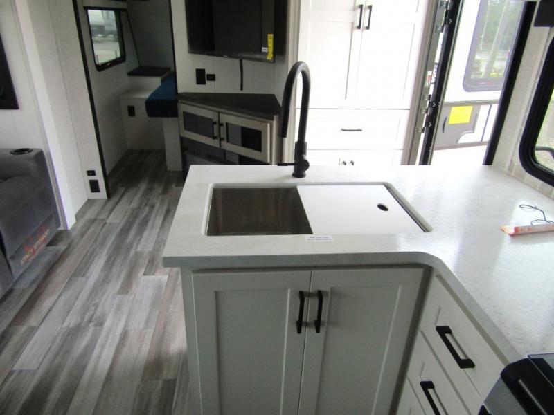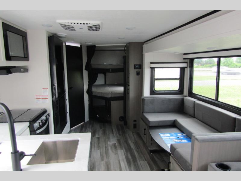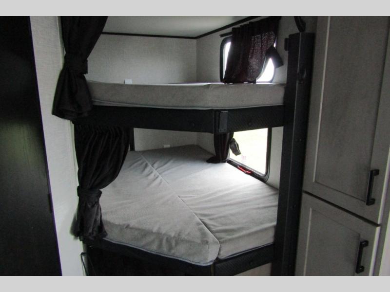 Your whole crew can join along on camping trips with this travel trailer that can sleep ten each night! Not only are there double-size bunks, but also a U-shaped dinette, tri-fold sofa, plus a queen bed in the front bedroom! There is also pass-thru storage under the bed so luggage, board games, and blankets can be kept out of the way. The chef of your group can cook indoors on the three burner cooktop or at the outside kitchen on the pull-out griddle. This model also includes a full bath with one of the dual entry doors for added convenience!