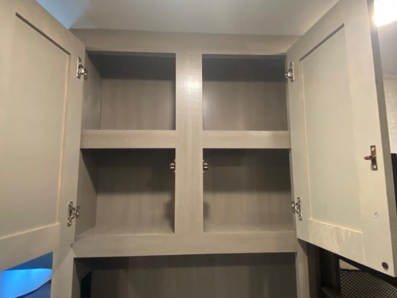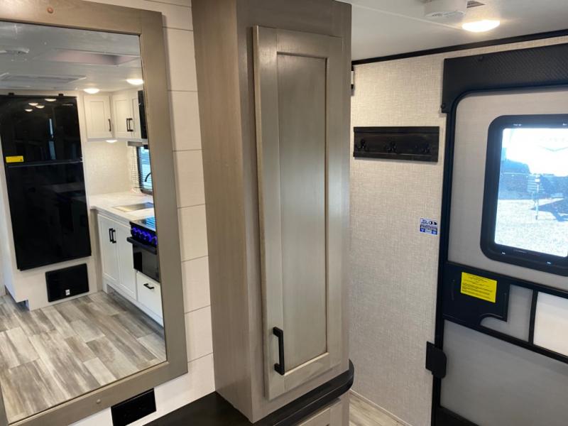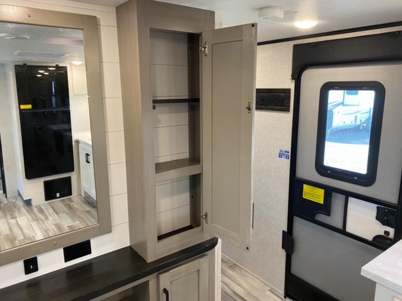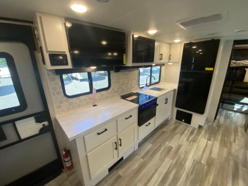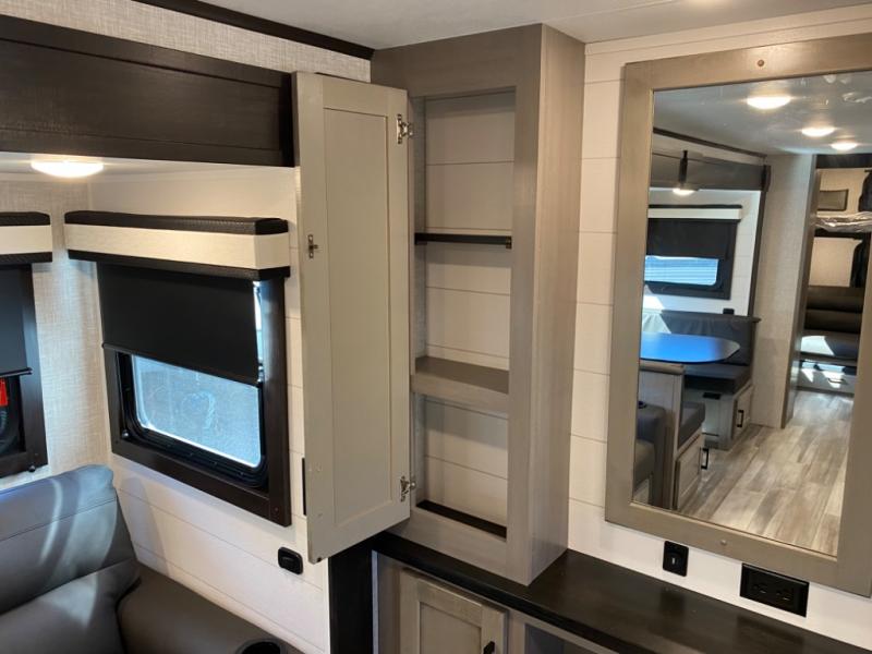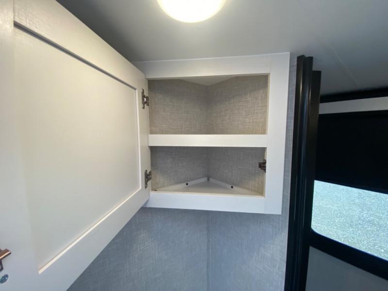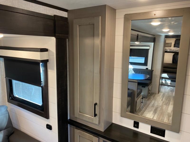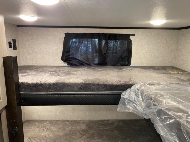 This trailer offers a cargo door that allows you to place larger items into the interior bunkhouse from the exterior for safe travels. You will also find plenty of storage for your clothing in wardrobes, your snacks in the entry walk-in pantry, and your linens in the full bathroom. There are two entries, one into the main area and one into the bedroom allowing you to sneak out for a walk in the morning while others are still sleeping on the furniture or in the private rear bunkhouse with triple bunks and a jackknife sofa. The cook will have full amenities inside, and an outside kitchen to make meals as well. And the two 13' awnings offer lots of covered outdoor living space. There is so much more to enjoy, and there are options to choose from to customize your trailer to your needs.