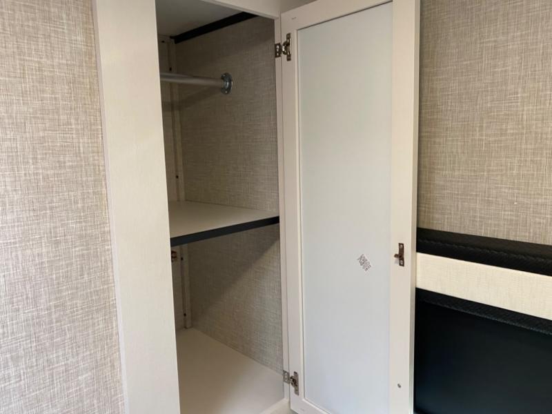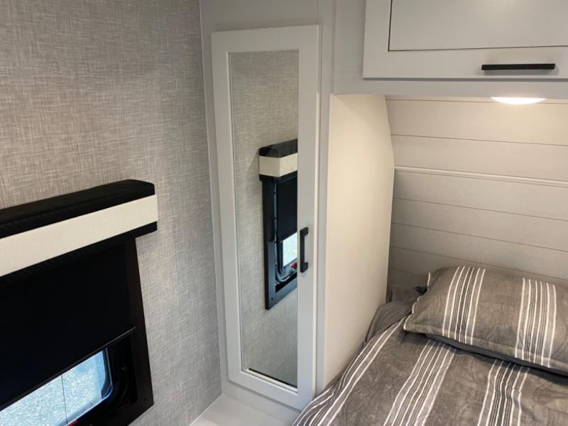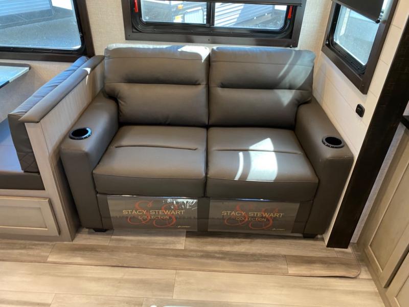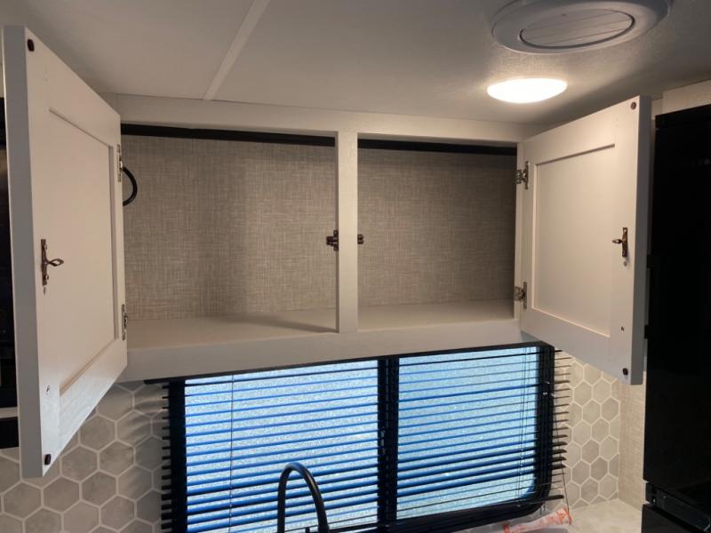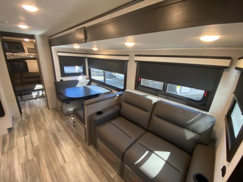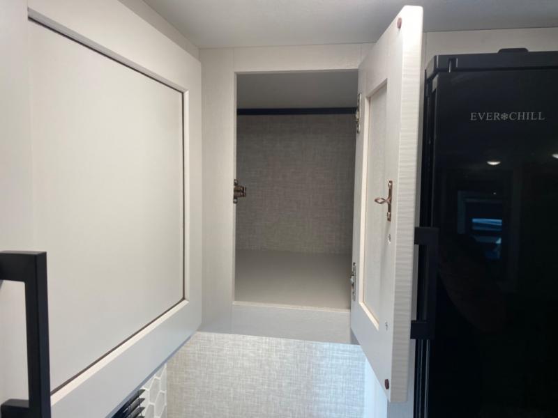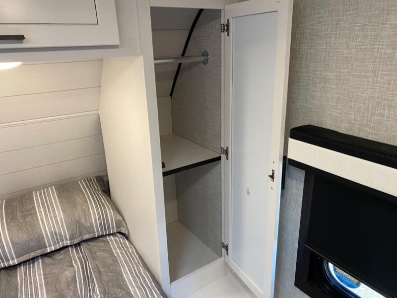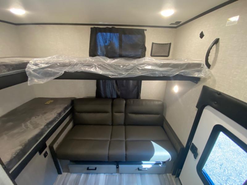 This trailer offers a cargo door that allows you to place larger items into the interior bunkhouse from the exterior for safe travels. You will also find plenty of storage for your clothing in wardrobes, your snacks in the entry walk-in pantry, and your linens in the full bathroom. There are two entries, one into the main area and one into the bedroom allowing you to sneak out for a walk in the morning while others are still sleeping on the furniture or in the private rear bunkhouse with triple bunks and a jackknife sofa. The cook will have full amenities inside, and an outside kitchen to make meals as well. And the two 13' awnings offer lots of covered outdoor living space. There is so much more to enjoy, and there are options to choose from to customize your trailer to your needs.