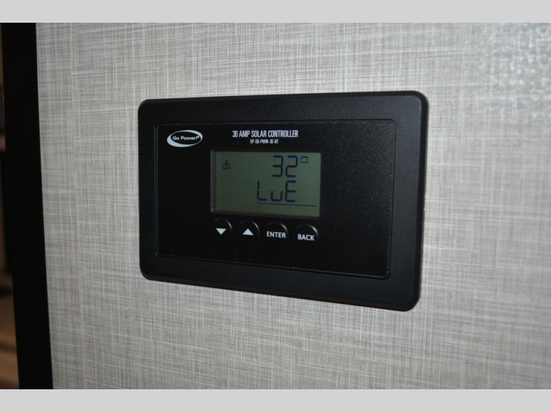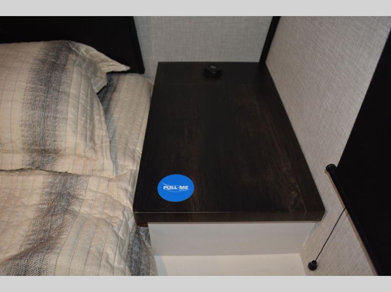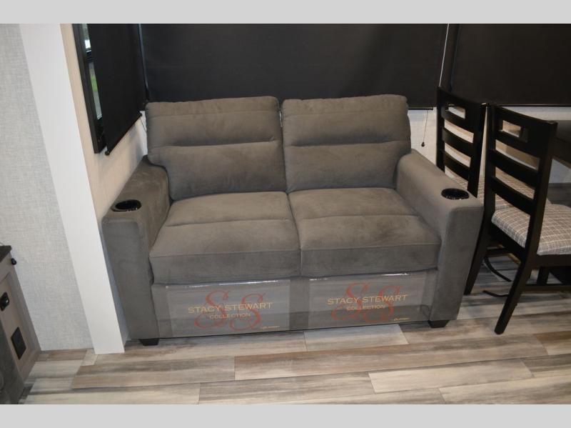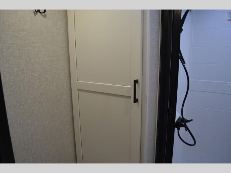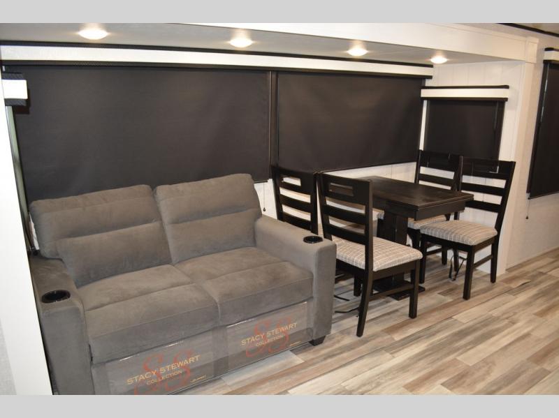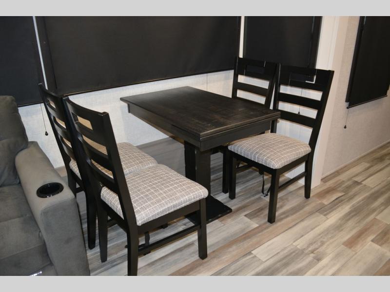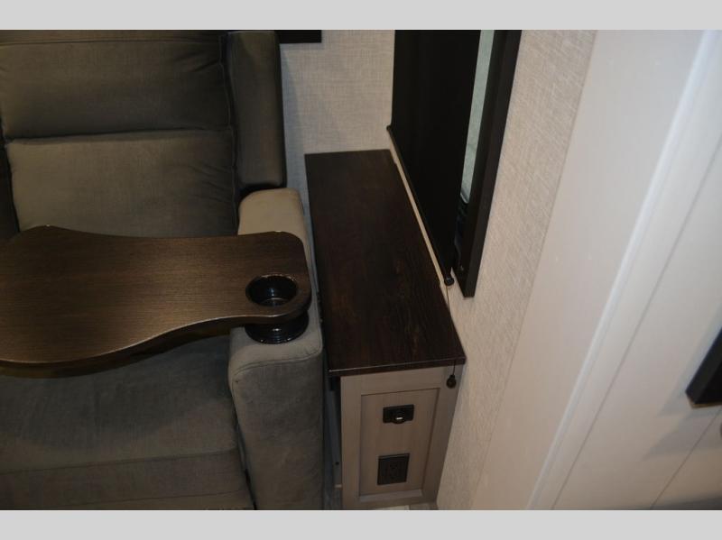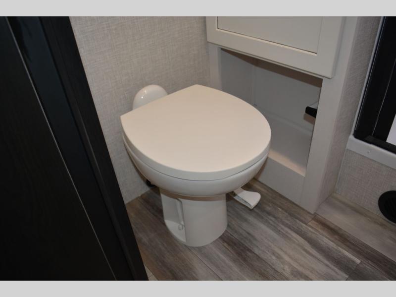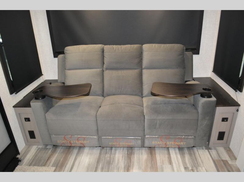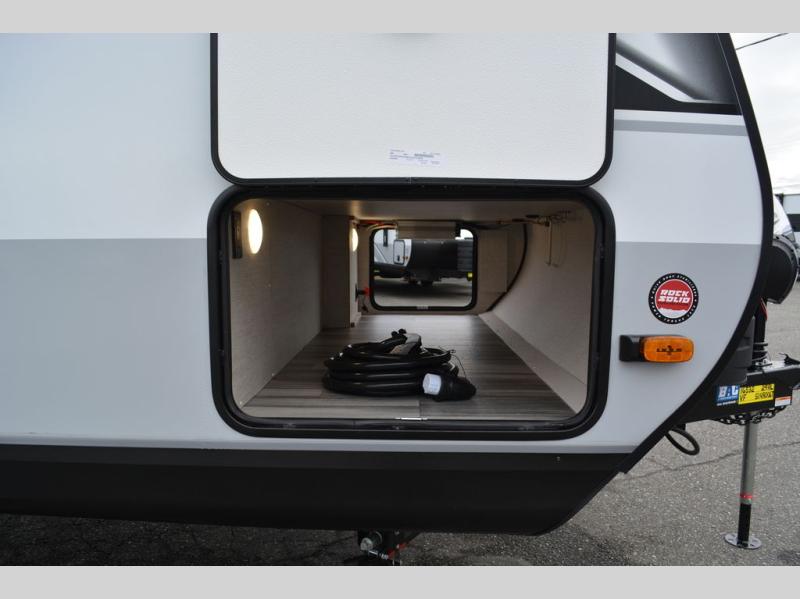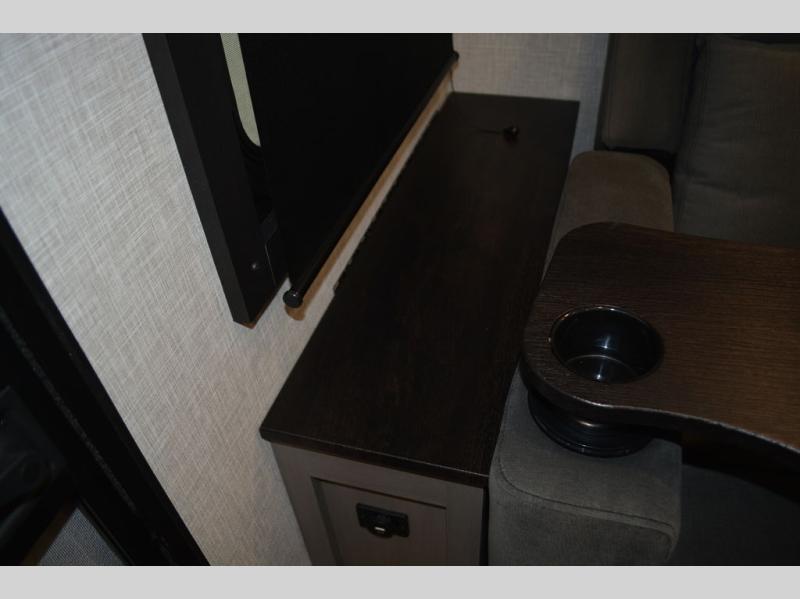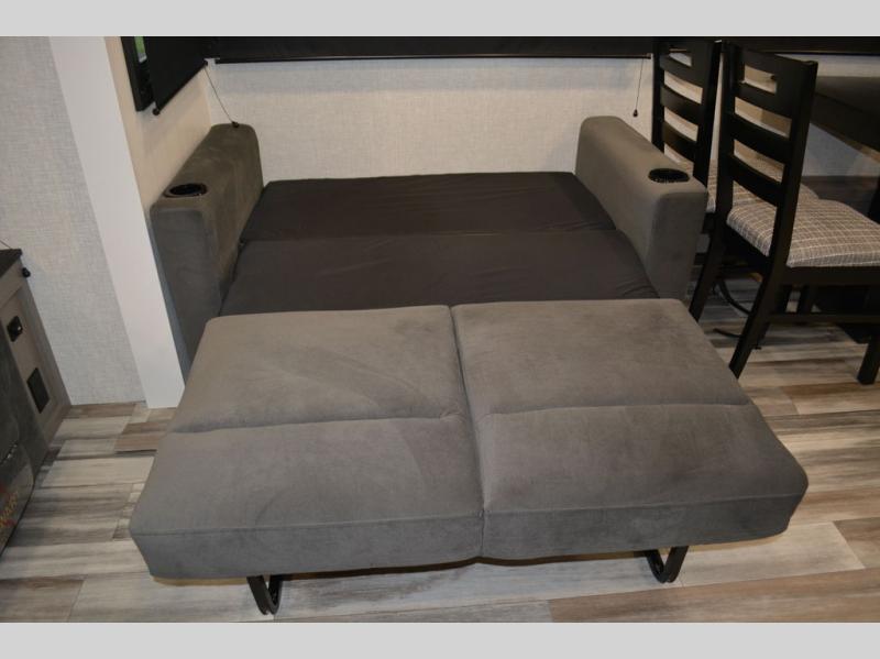 It won't be hard to find comfort in this spacious travel trailer for five to six campers! Once you arrive at the campground, set up the 20' power awning with LED lights, unload the exterior storage, then head inside to make lunch. You'll find an 11 cu. ft. 12V refrigerator and pantry to keep food stocked up, and there is a booth dinette to dine at. Additional seating space is found on the tri-fold sofa and rear theater seat with swivel tables. A full bath will be waiting for you to freshen up each day, and the queen bed in the front bedroom is sure to bring a great night's rest. You'll also find one of the dual entry doors in the bedroom so you can slip out in the morning for an early run!