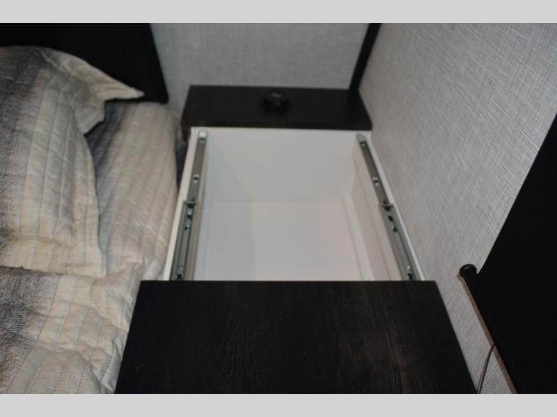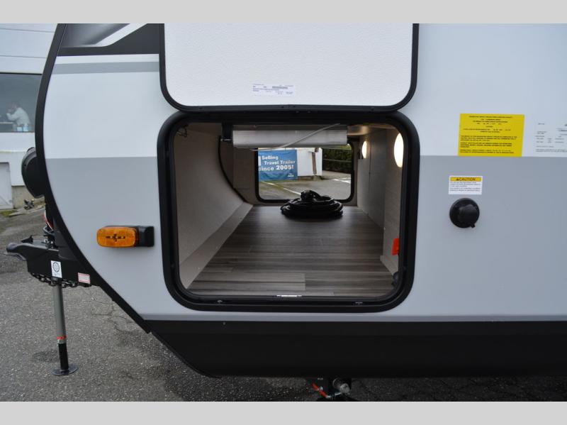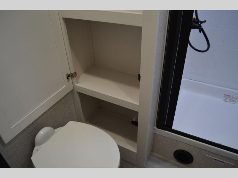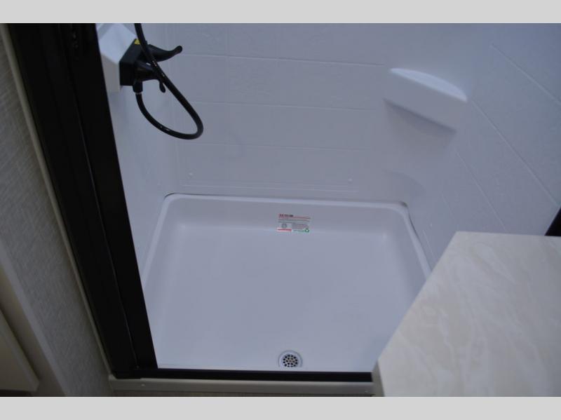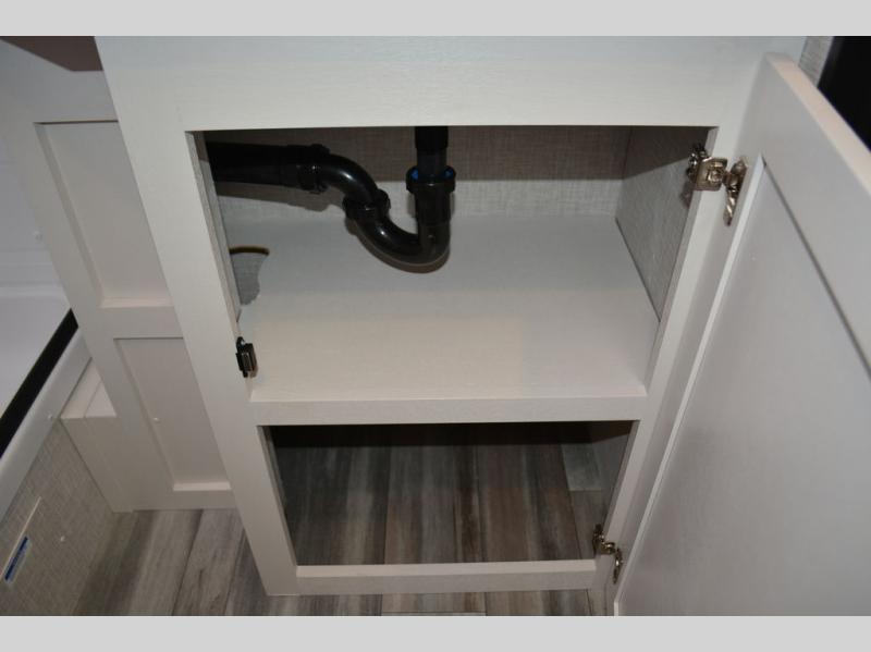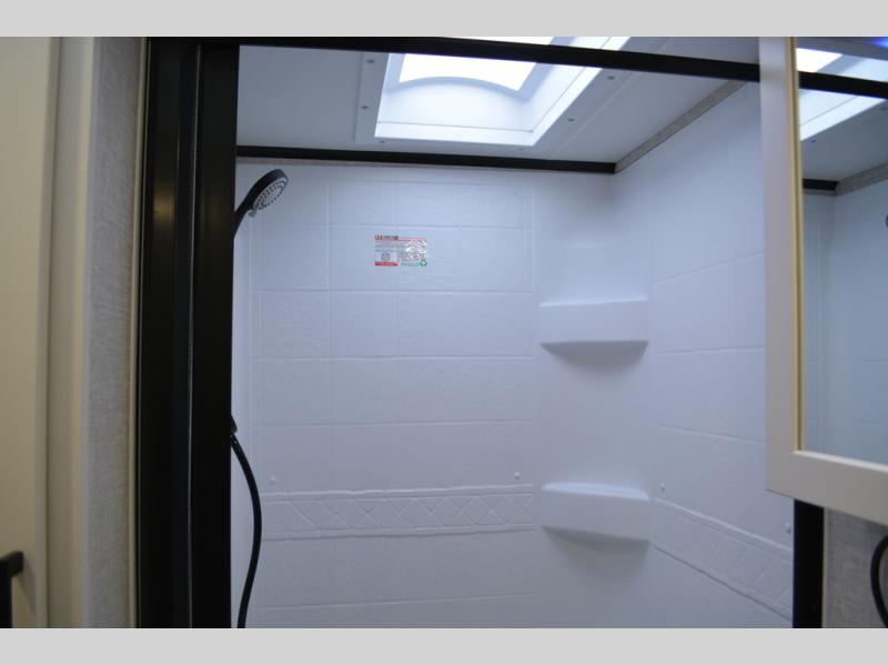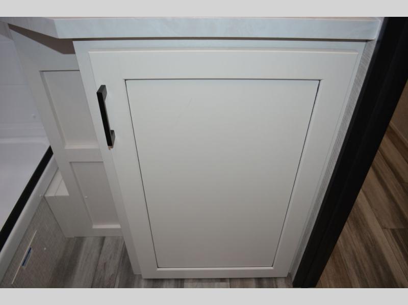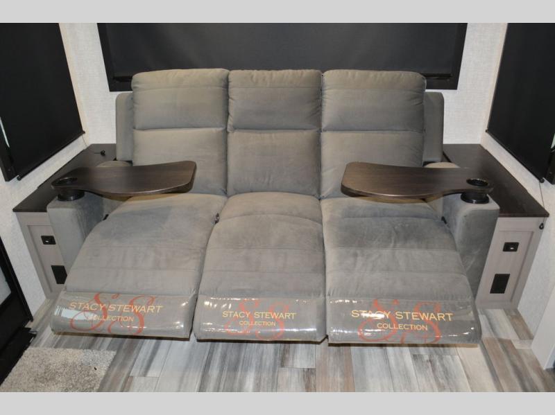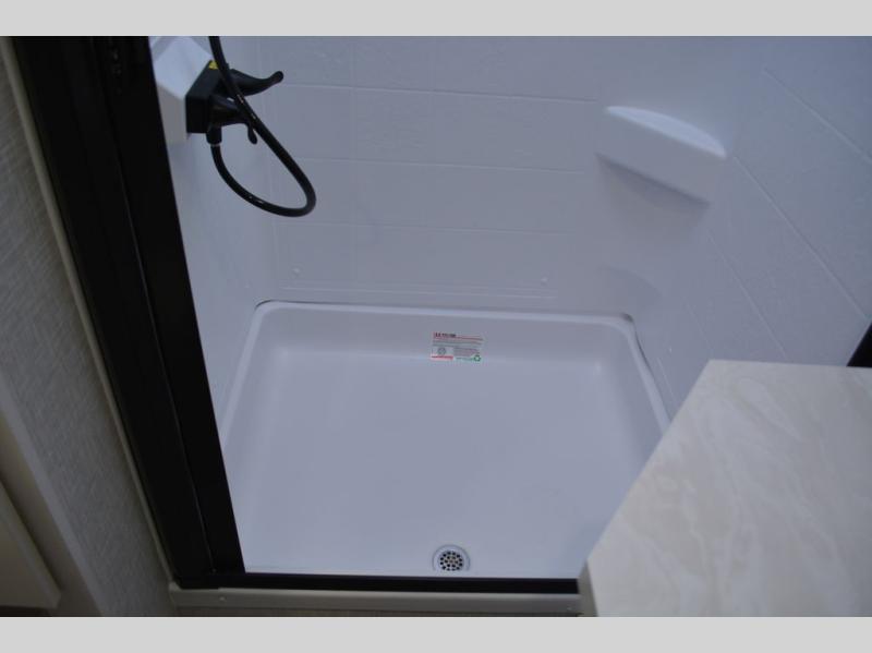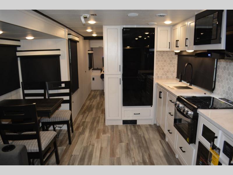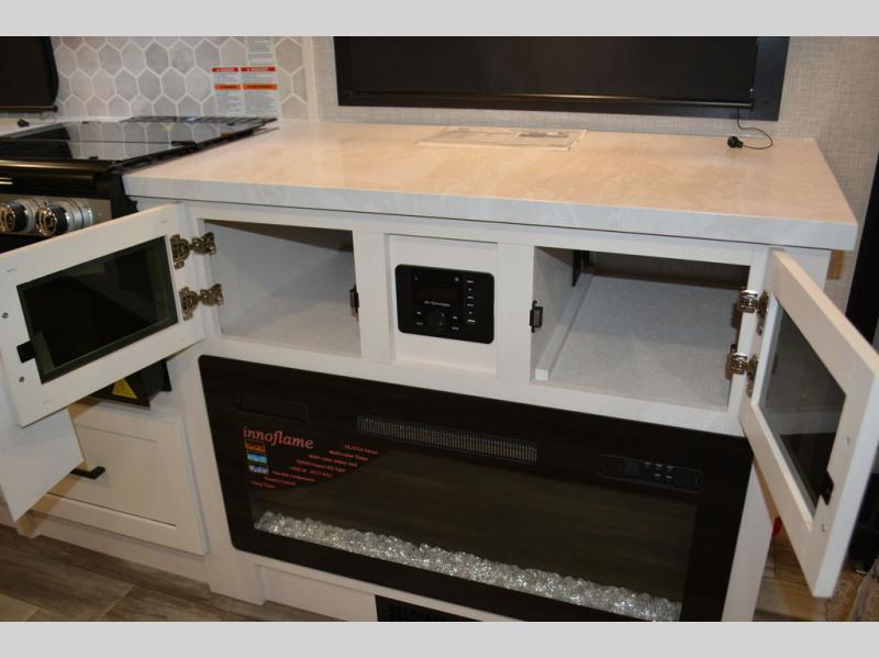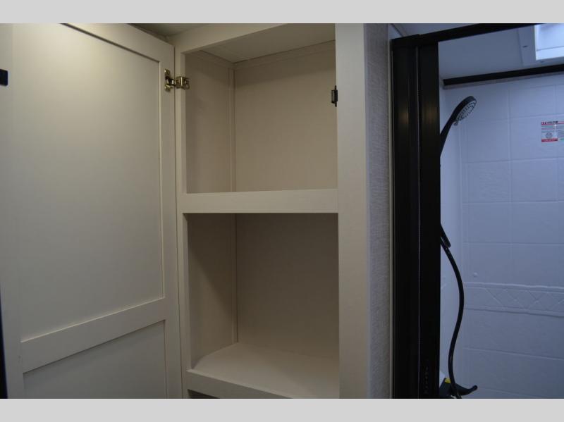 It won't be hard to find comfort in this spacious travel trailer for five to six campers! Once you arrive at the campground, set up the 20' power awning with LED lights, unload the exterior storage, then head inside to make lunch. You'll find an 11 cu. ft. 12V refrigerator and pantry to keep food stocked up, and there is a booth dinette to dine at. Additional seating space is found on the tri-fold sofa and rear theater seat with swivel tables. A full bath will be waiting for you to freshen up each day, and the queen bed in the front bedroom is sure to bring a great night's rest. You'll also find one of the dual entry doors in the bedroom so you can slip out in the morning for an early run!