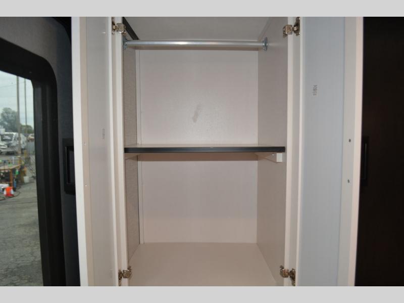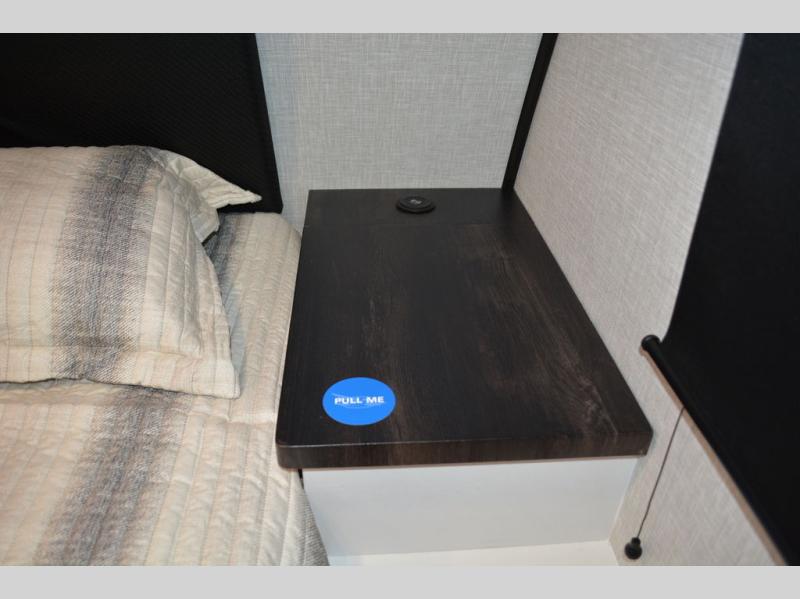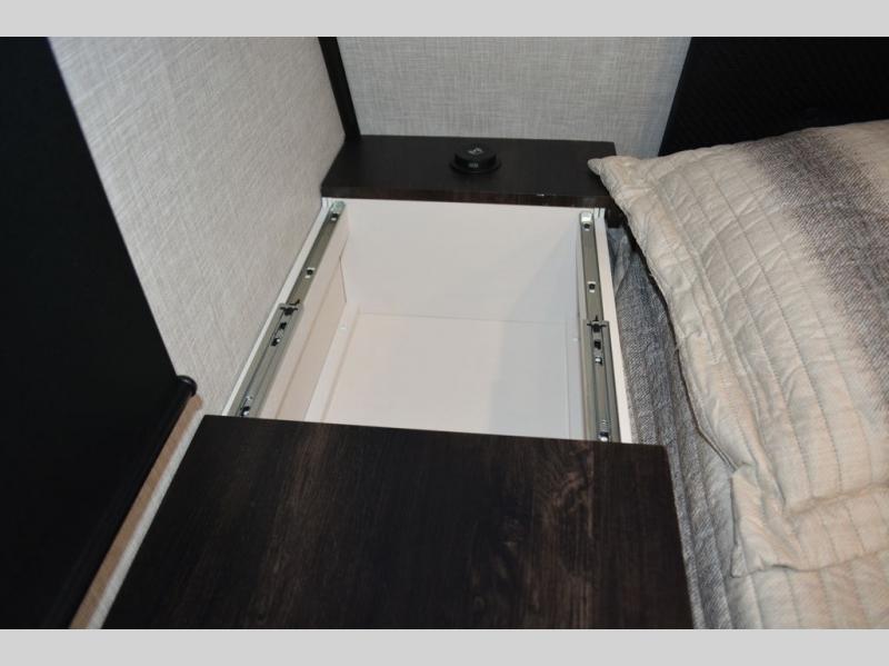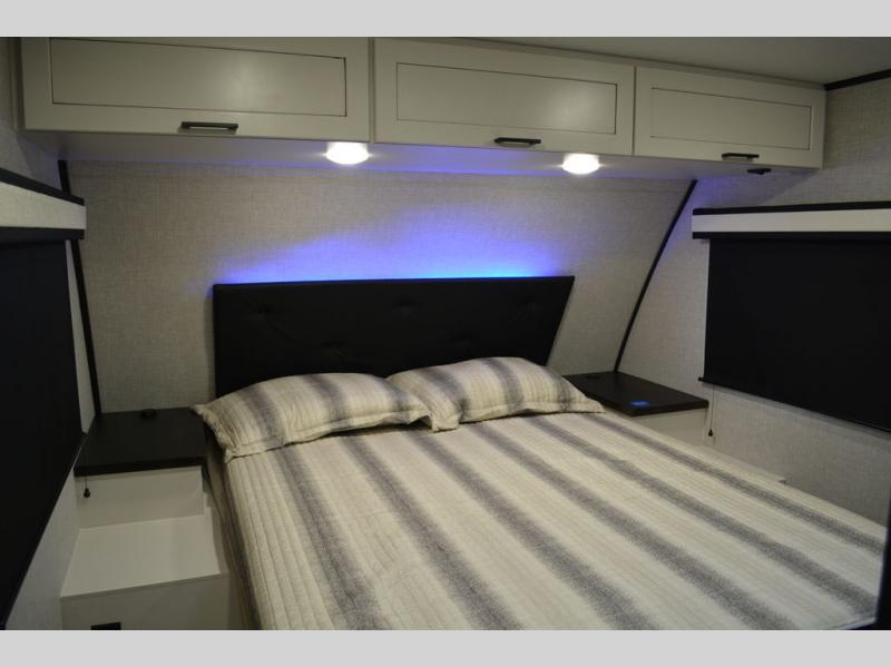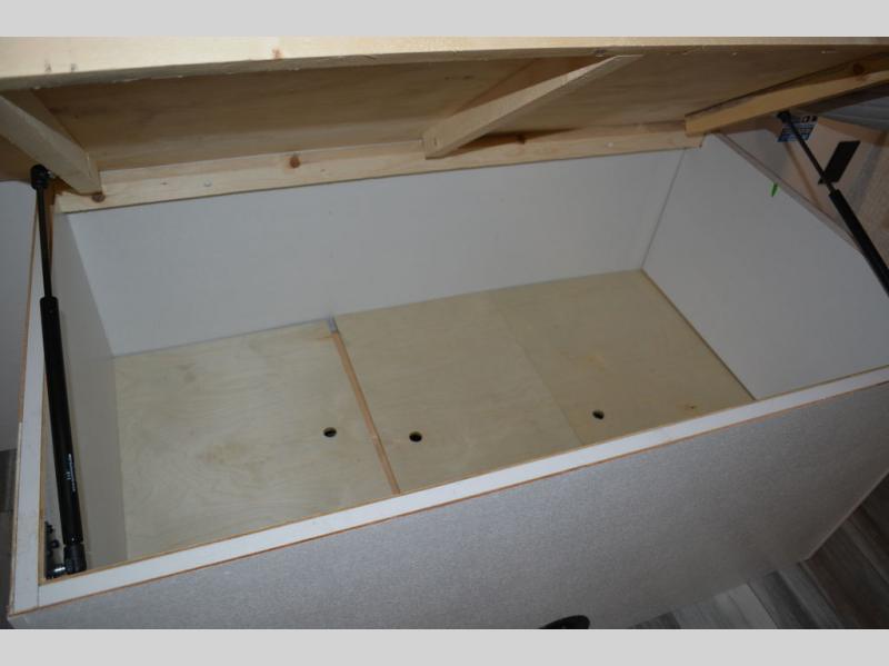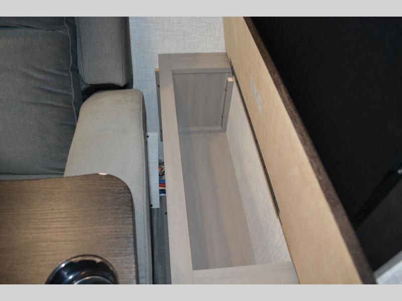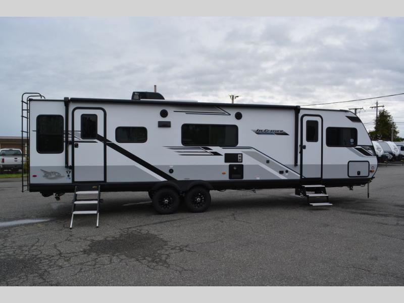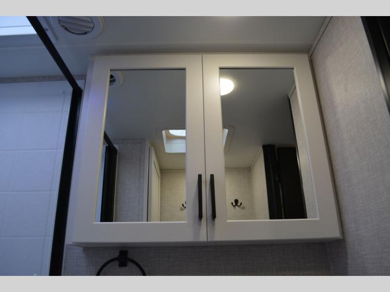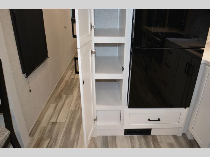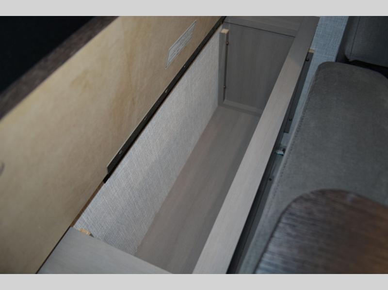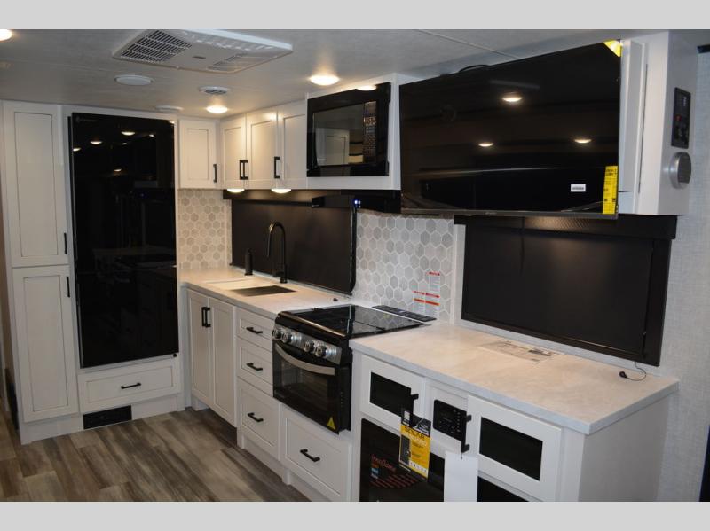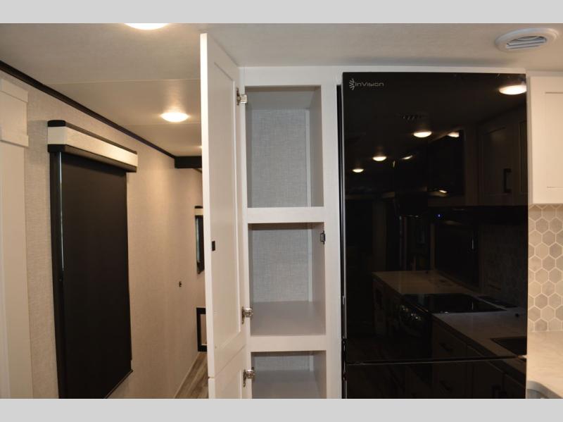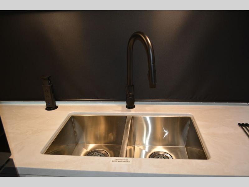 It won't be hard to find comfort in this spacious travel trailer for five to six campers! Once you arrive at the campground, set up the 20' power awning with LED lights, unload the exterior storage, then head inside to make lunch. You'll find an 11 cu. ft. 12V refrigerator and pantry to keep food stocked up, and there is a booth dinette to dine at. Additional seating space is found on the tri-fold sofa and rear theater seat with swivel tables. A full bath will be waiting for you to freshen up each day, and the queen bed in the front bedroom is sure to bring a great night's rest. You'll also find one of the dual entry doors in the bedroom so you can slip out in the morning for an early run!