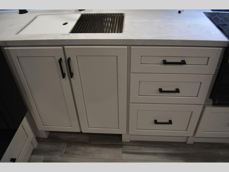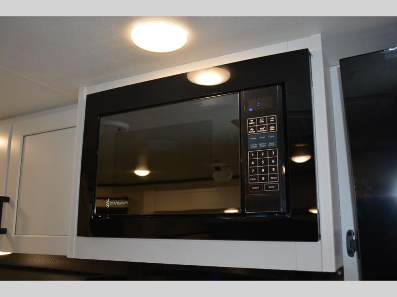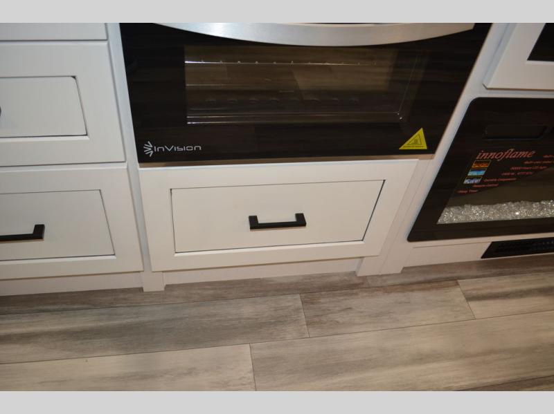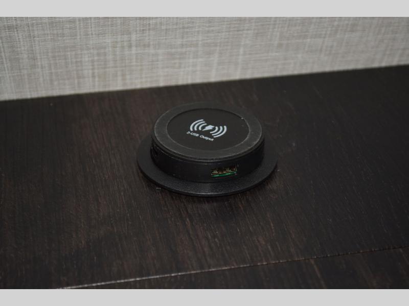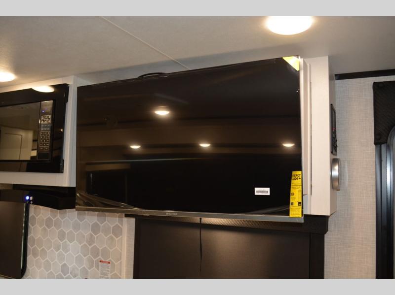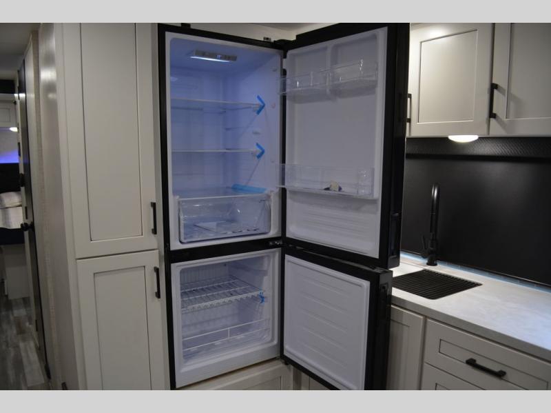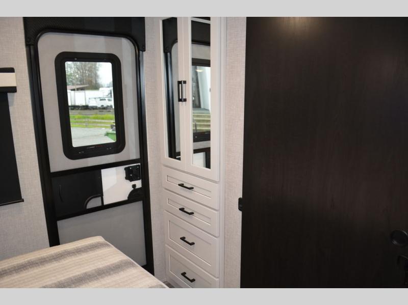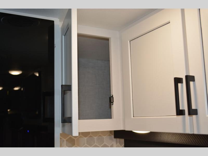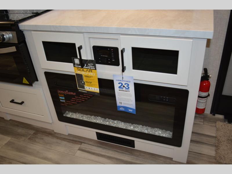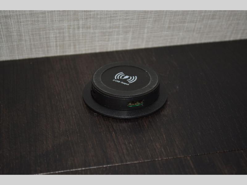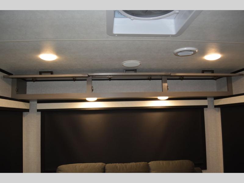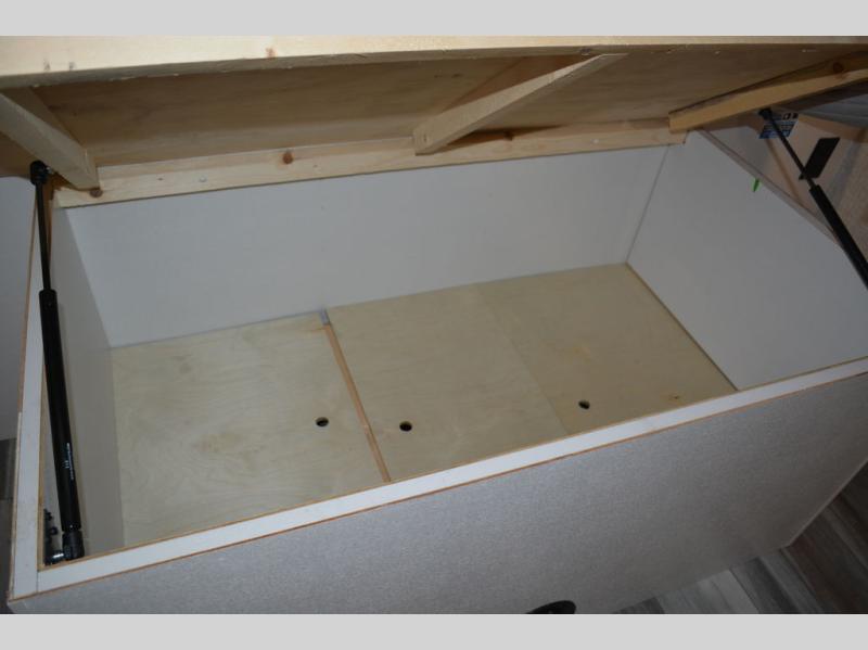 It won't be hard to find comfort in this spacious travel trailer for five to six campers! Once you arrive at the campground, set up the 20' power awning with LED lights, unload the exterior storage, then head inside to make lunch. You'll find an 11 cu. ft. 12V refrigerator and pantry to keep food stocked up, and there is a booth dinette to dine at. Additional seating space is found on the tri-fold sofa and rear theater seat with swivel tables. A full bath will be waiting for you to freshen up each day, and the queen bed in the front bedroom is sure to bring a great night's rest. You'll also find one of the dual entry doors in the bedroom so you can slip out in the morning for an early run!