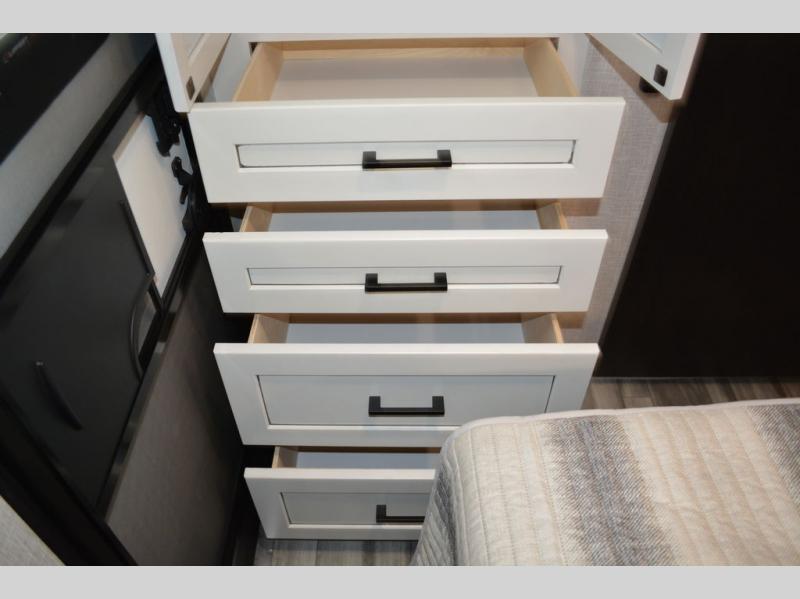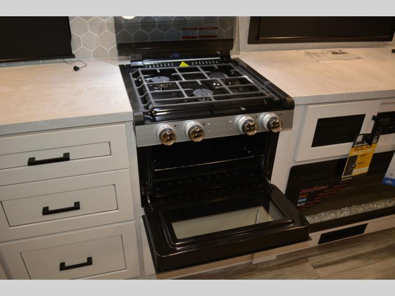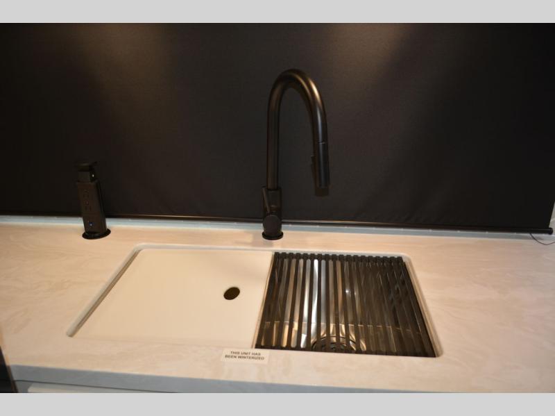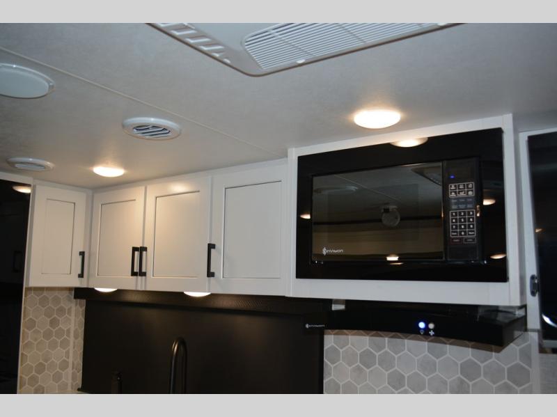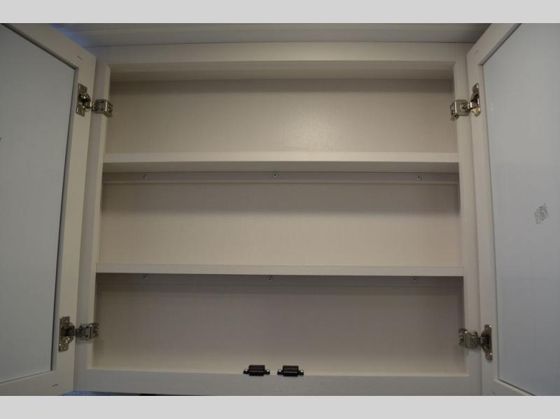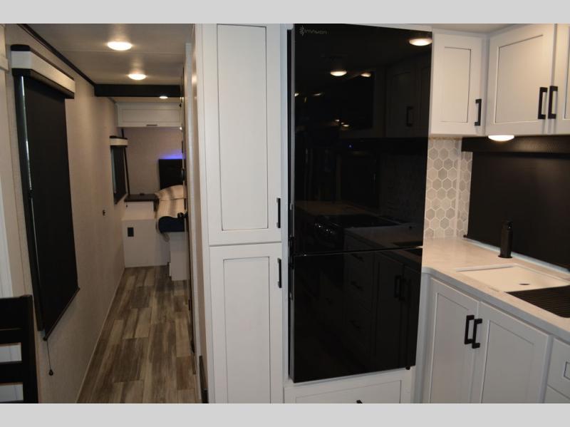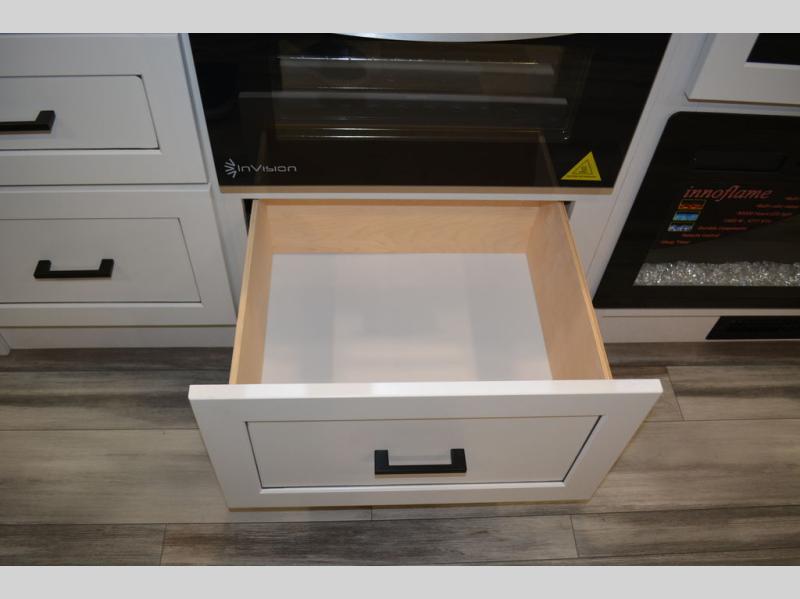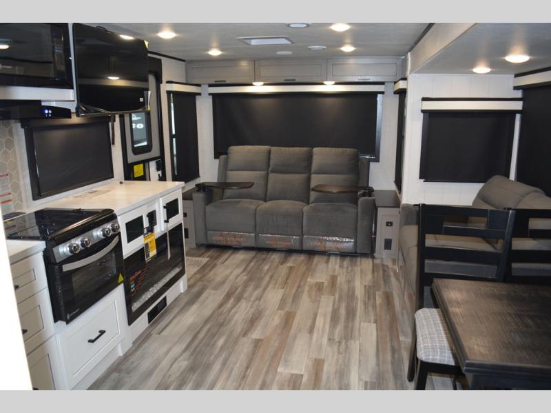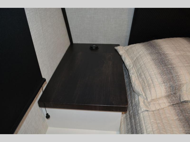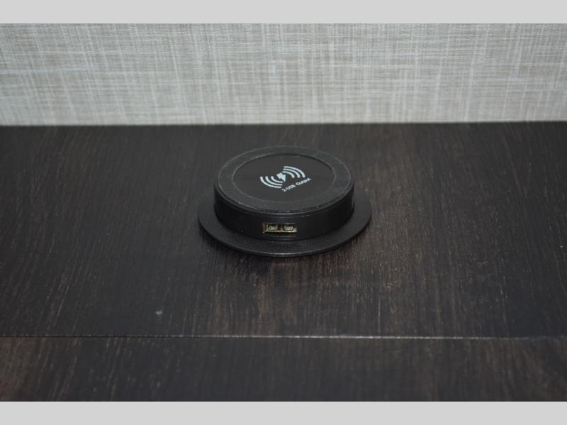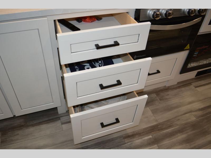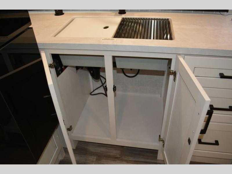 It won't be hard to find comfort in this spacious travel trailer for five to six campers! Once you arrive at the campground, set up the 20' power awning with LED lights, unload the exterior storage, then head inside to make lunch. You'll find an 11 cu. ft. 12V refrigerator and pantry to keep food stocked up, and there is a booth dinette to dine at. Additional seating space is found on the tri-fold sofa and rear theater seat with swivel tables. A full bath will be waiting for you to freshen up each day, and the queen bed in the front bedroom is sure to bring a great night's rest. You'll also find one of the dual entry doors in the bedroom so you can slip out in the morning for an early run!