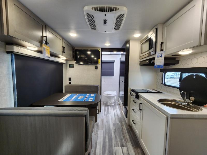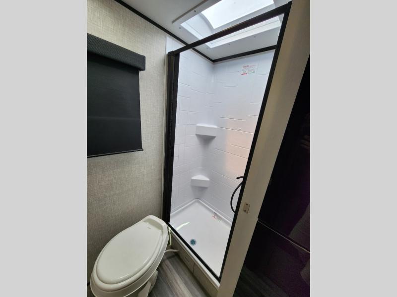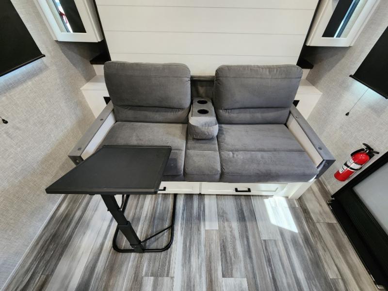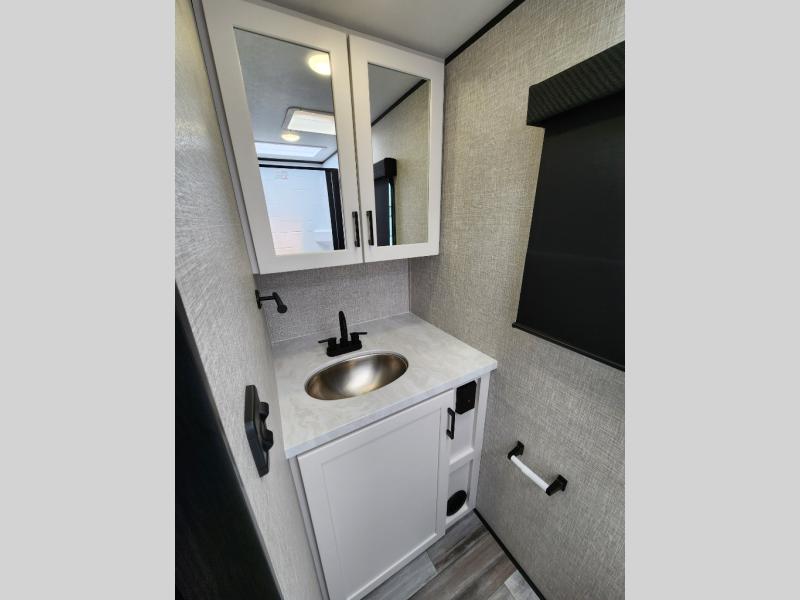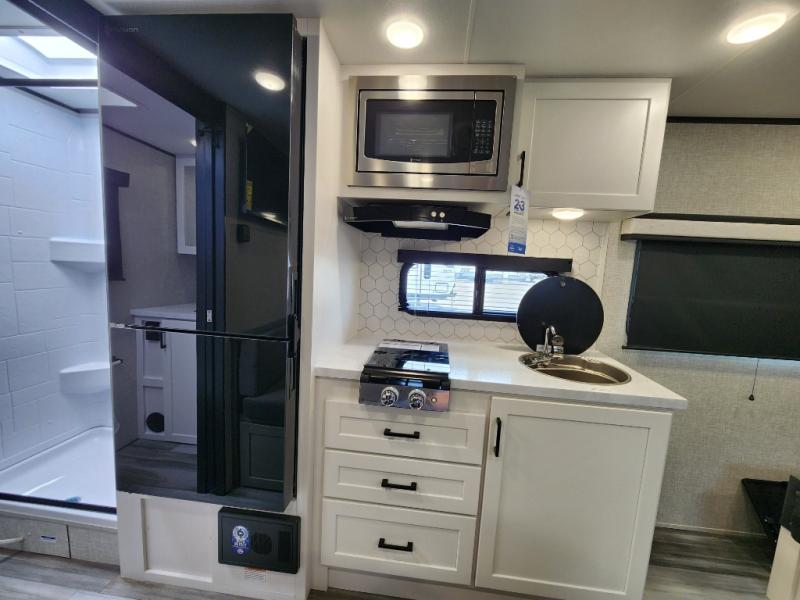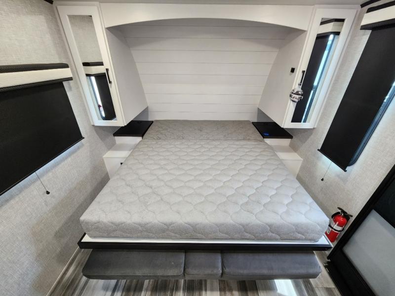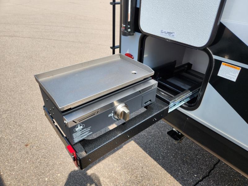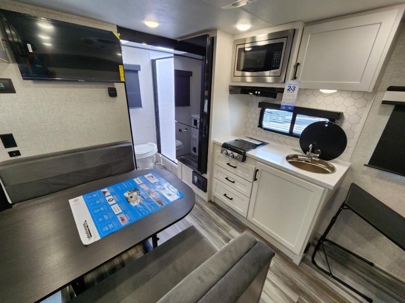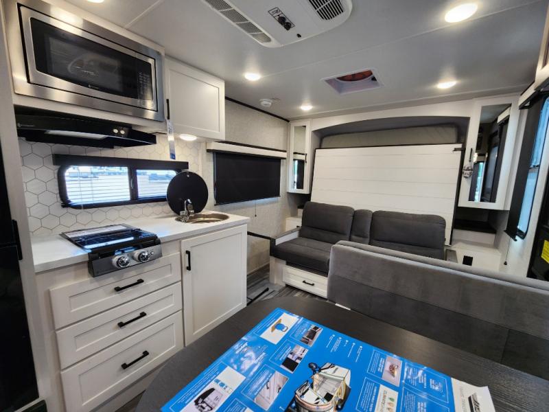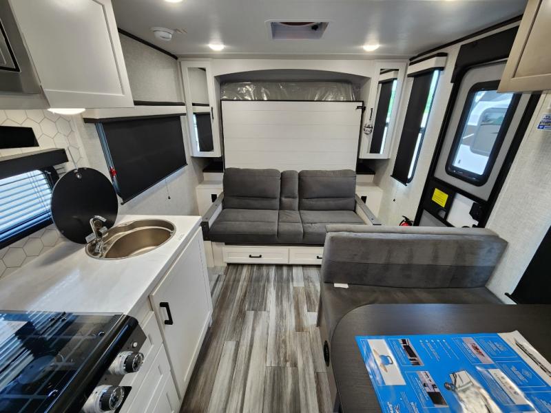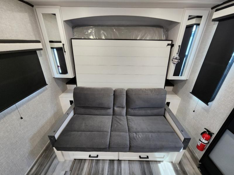 This is the perfect travel trailer for two to three campers! You'll have plenty of space during the day since there is a sofa up front, with a Murphy bed that can be folded down when you're ready for bed. There are also dual bedside wardrobes and nightstands to keep your space tidy. Breakfast can be made on the two burner cooktop or in the convection microwave, and there is a booth dinette where you can dine together. If the weather is nice, you may just find yourselves cooking on the exterior griddle and dining under the 13' awning! The full rear bath is sure to come in handy, and there is plenty of storage throughout to keep all your belongings put away!