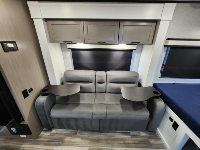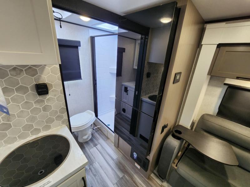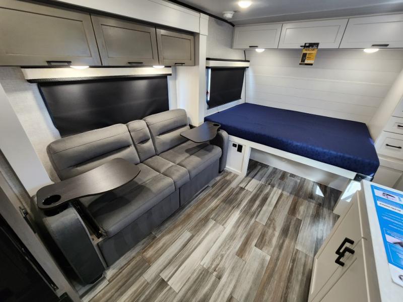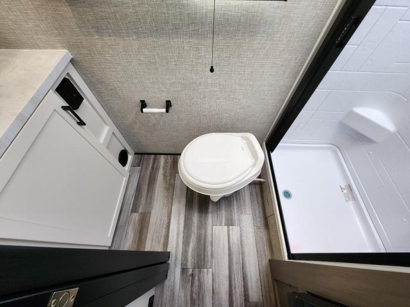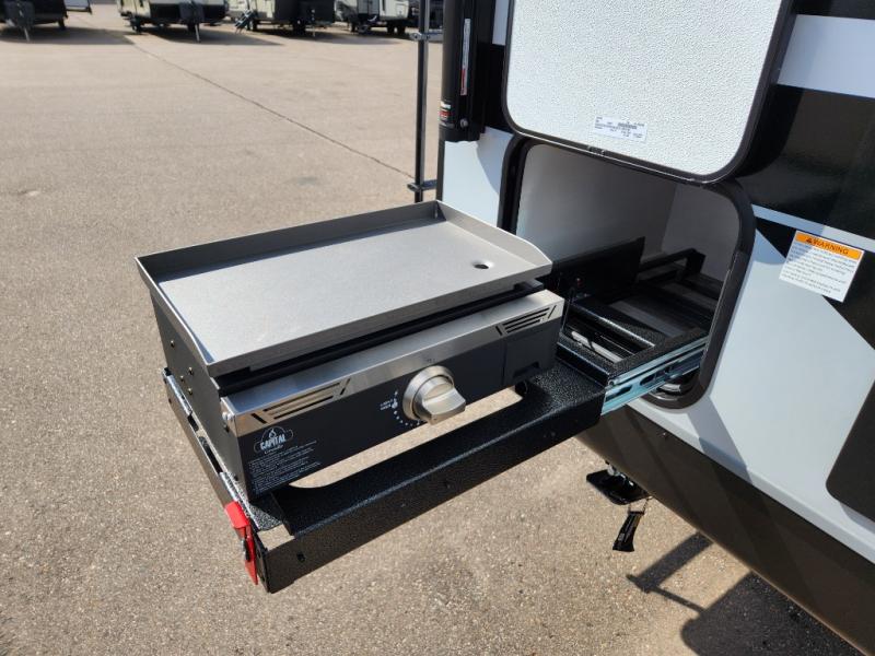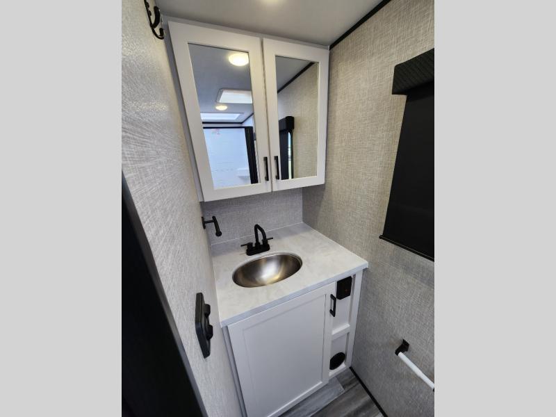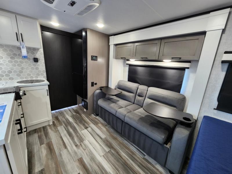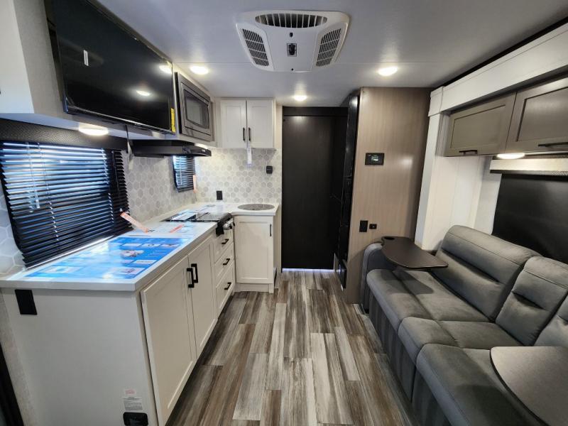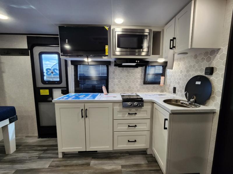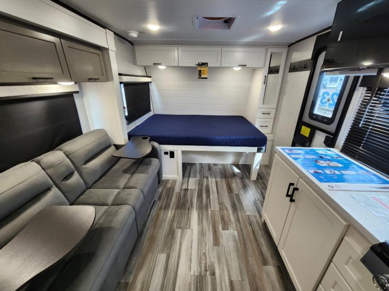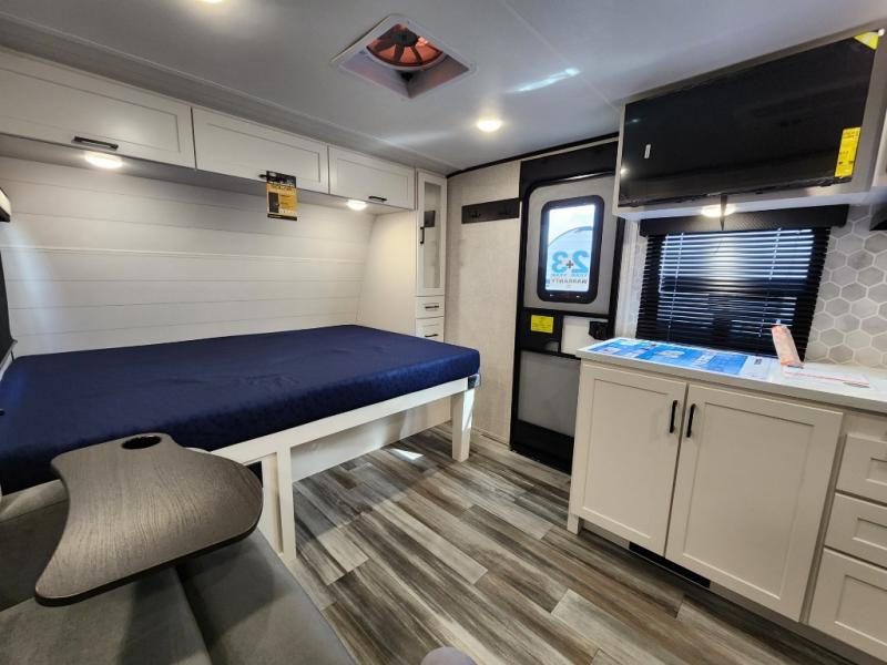 This travel trailer will feel just like home with its front queen bed, full rear bath, and fully-equipped kitchen! There is a jack-knife sofa slide out where you can relax each day, and there are swivel tables so you can enjoy meals here too. The LED Smart TV will let you stay in and watch movies if the weather isn't cooperating, or you can grab the fishing gear from the outside storage and weather the storm! You'll also find plenty of interior storage in the multiple overhead cabinets and the bath medicine cabinet!