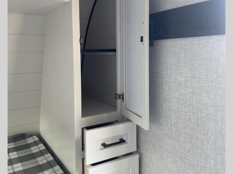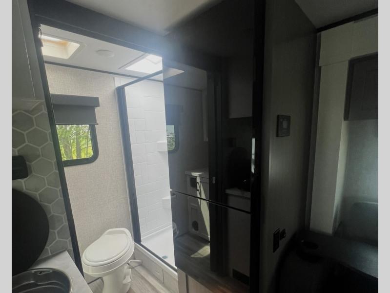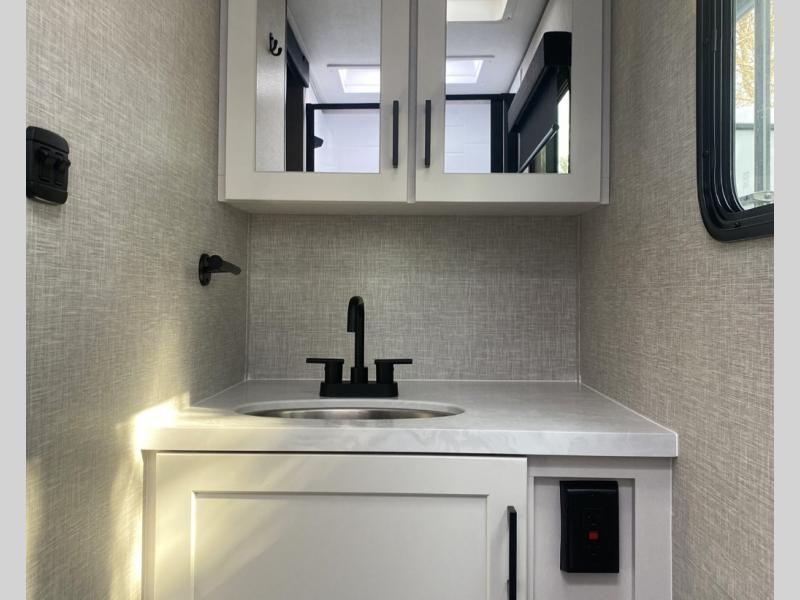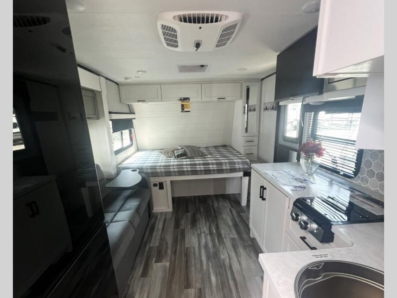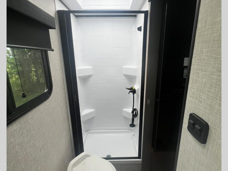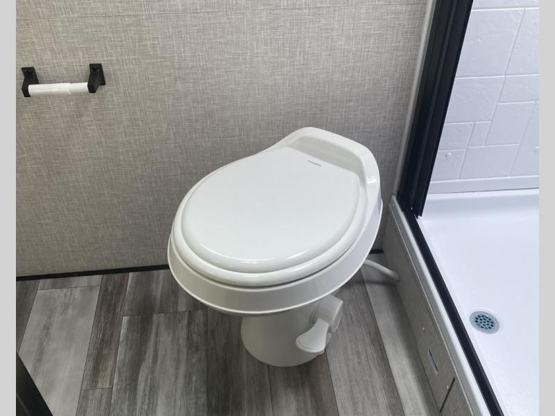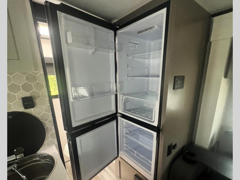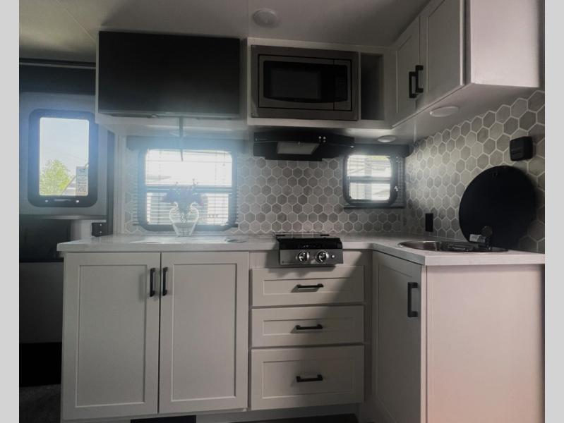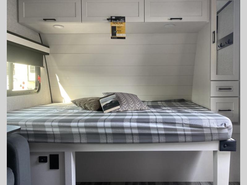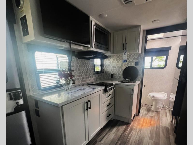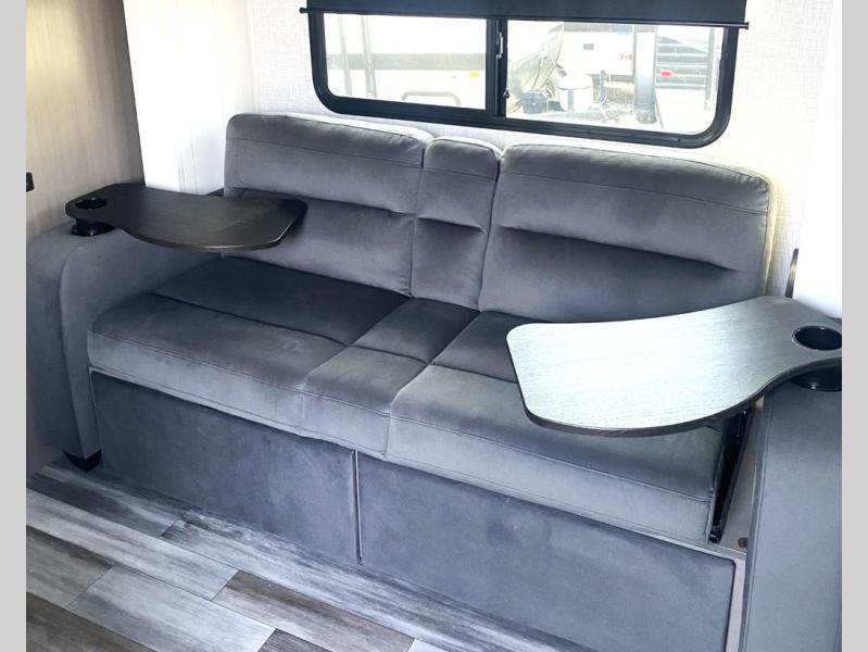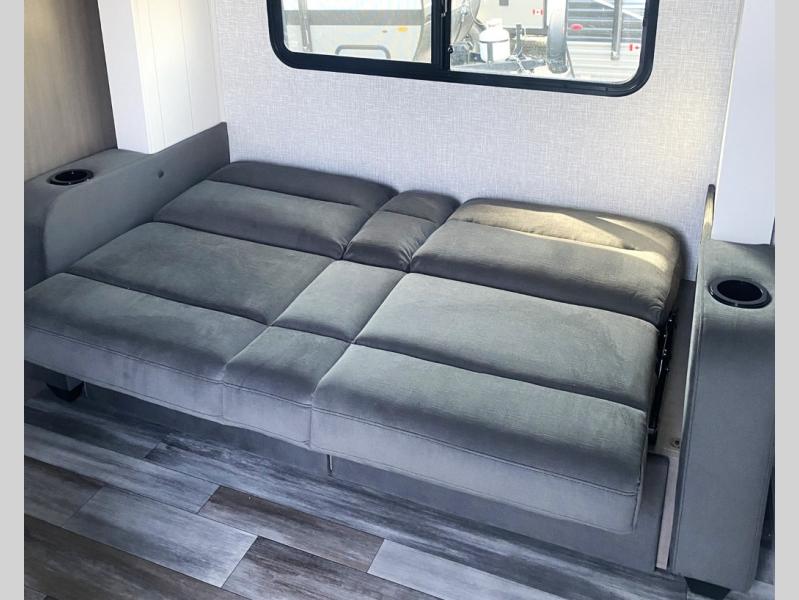 This travel trailer will feel just like home with its front queen bed, full rear bath, and fully-equipped kitchen! There is a jack-knife sofa slide out where you can relax each day, and there are swivel tables so you can enjoy meals here too. The LED Smart TV will let you stay in and watch movies if the weather isn't cooperating, or you can grab the fishing gear from the outside storage and weather the storm! You'll also find plenty of interior storage in the multiple overhead cabinets and the bath medicine cabinet!
