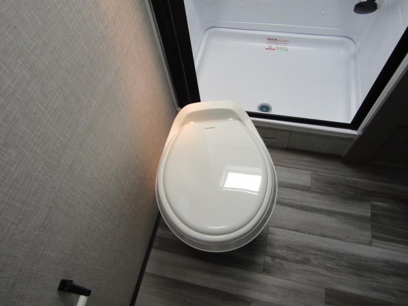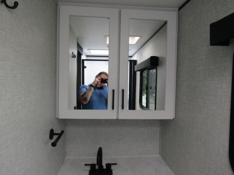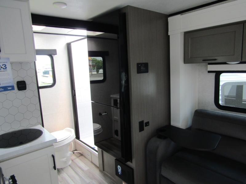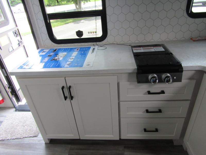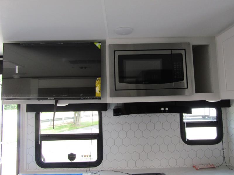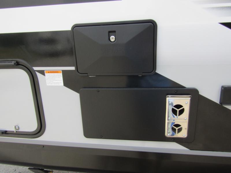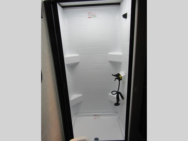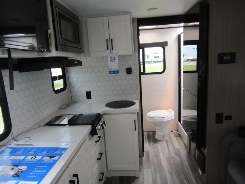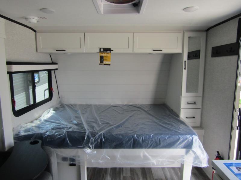 This travel trailer will feel just like home with its front queen bed, full rear bath, and fully-equipped kitchen! There is a jack-knife sofa slide out where you can relax each day, and there are swivel tables so you can enjoy meals here too. The LED Smart TV will let you stay in and watch movies if the weather isn't cooperating, or you can grab the fishing gear from the outside storage and weather the storm! You'll also find plenty of interior storage in the multiple overhead cabinets and the bath medicine cabinet!