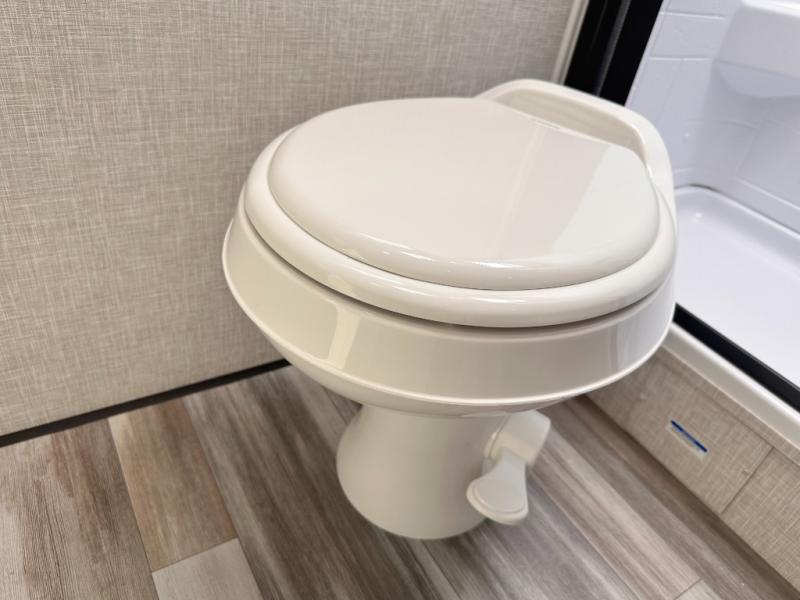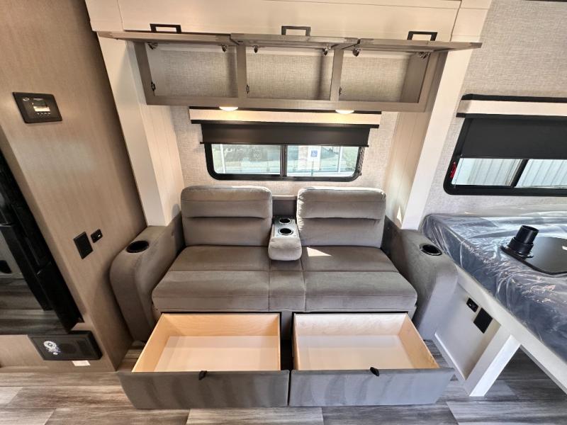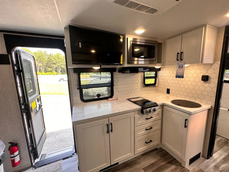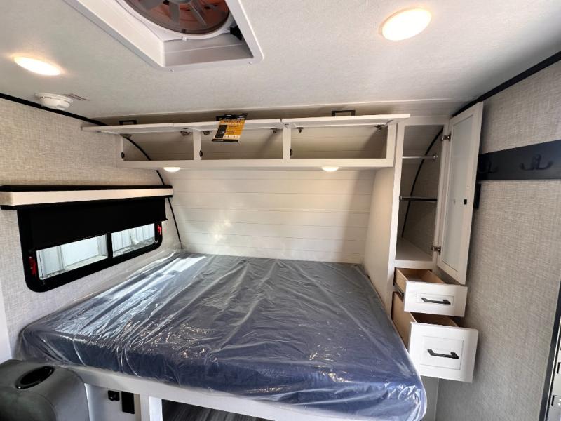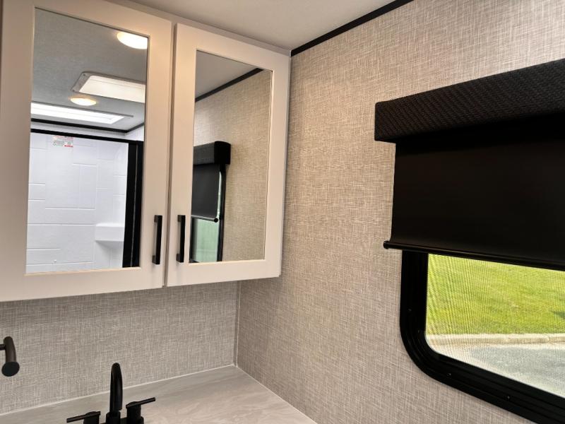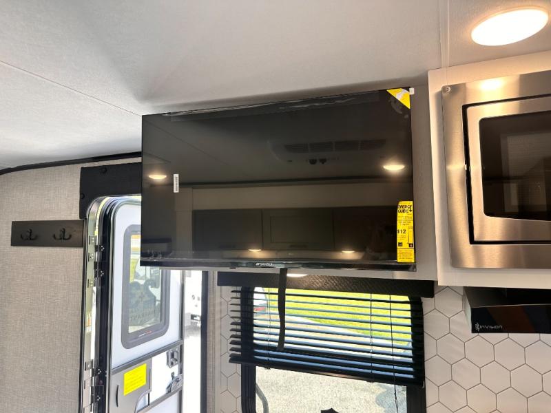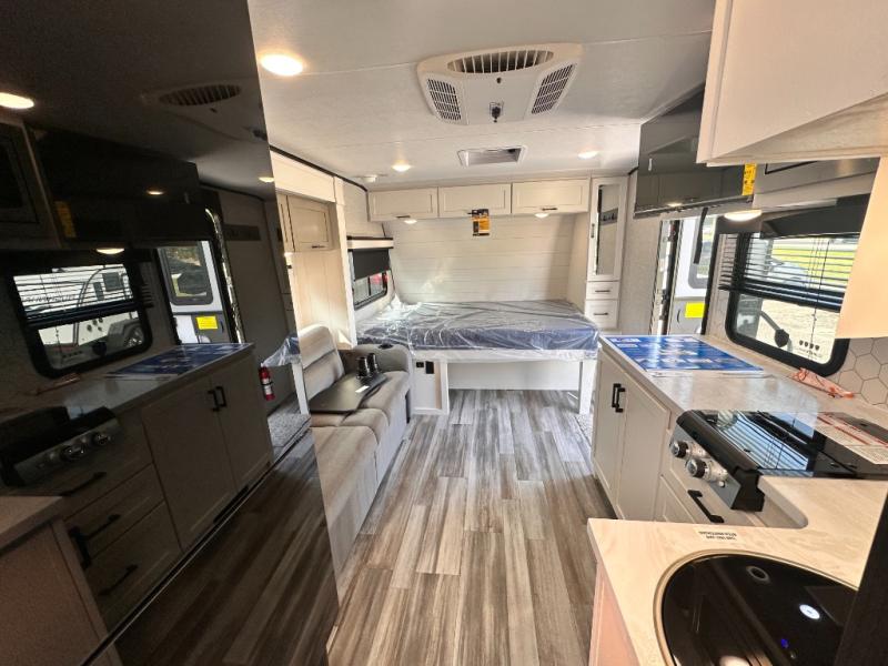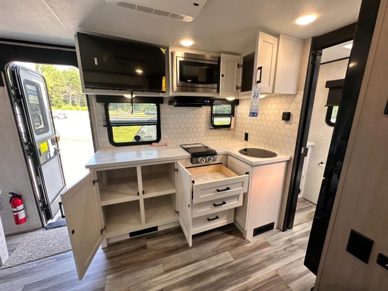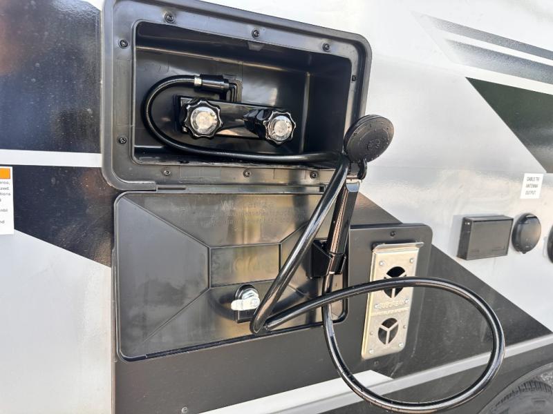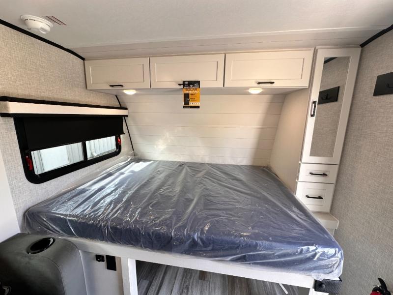 This travel trailer will feel just like home with its front queen bed, full rear bath, and fully-equipped kitchen! There is a jack-knife sofa slide out where you can relax each day, and there are swivel tables so you can enjoy meals here too. The LED Smart TV will let you stay in and watch movies if the weather isn't cooperating, or you can grab the fishing gear from the outside storage and weather the storm! You'll also find plenty of interior storage in the multiple overhead cabinets and the bath medicine cabinet!