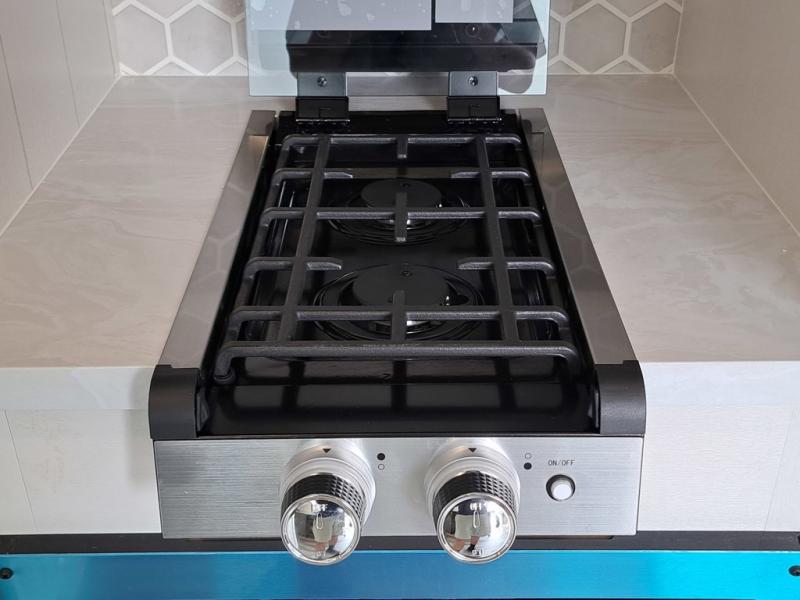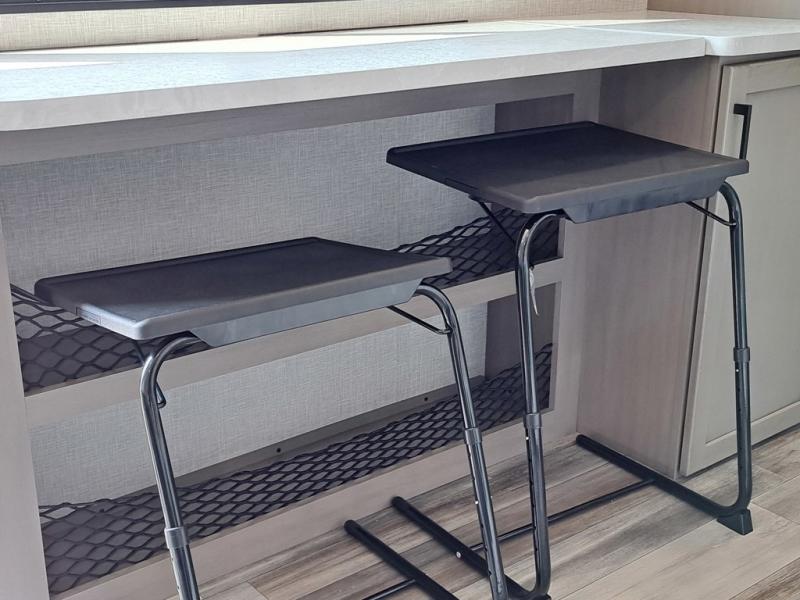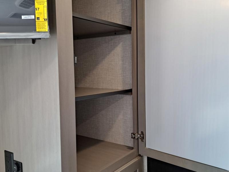 Light on weight doesn't mean light on features, and this Jay Feather Air proves that! You will appreciate the added space thanks to the kitchen slide out that houses the 11 cu. ft. 12V refrigerator and two burner cooktop. Your crew can enjoy meals together at the dining bar with a hinged top and two stools, or you can take your plate outdoors to sit under the 15' power awning with LED lights. The front Murphy bed can be folded away during the day so you can relax on the sofa, and your guests can make their bunk beds before heading out for the day. This model also includes ample storage space, including a pantry/wardrobe, overhead cabinets, dual bedside wardrobes, and outside storage!