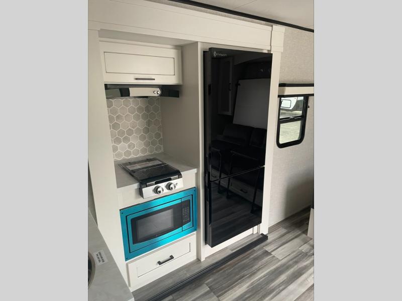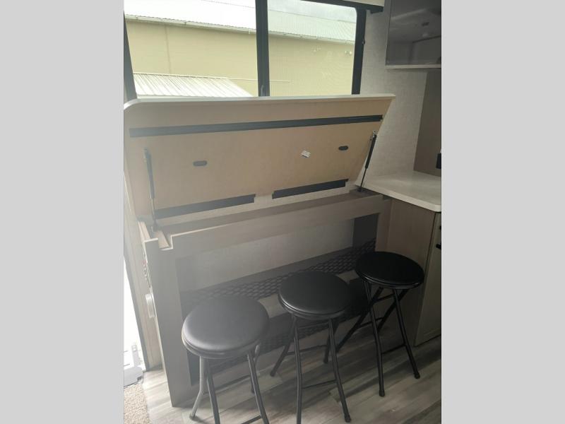 Light on weight doesn't mean light on features, and this Jay Feather Air proves that! You will appreciate the added space thanks to the kitchen slide out that houses the 11 cu. ft. 12V refrigerator and two burner cooktop. Your crew can enjoy meals together at the dining bar with a hinged top and two stools, or you can take your plate outdoors to sit under the 15' power awning with LED lights. The front Murphy bed can be folded away during the day so you can relax on the sofa, and your guests can make their bunk beds before heading out for the day. This model also includes ample storage space, including a pantry/wardrobe, overhead cabinets, dual bedside wardrobes, and outside storage!