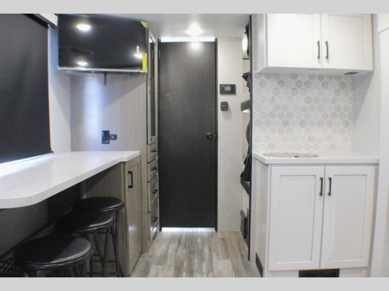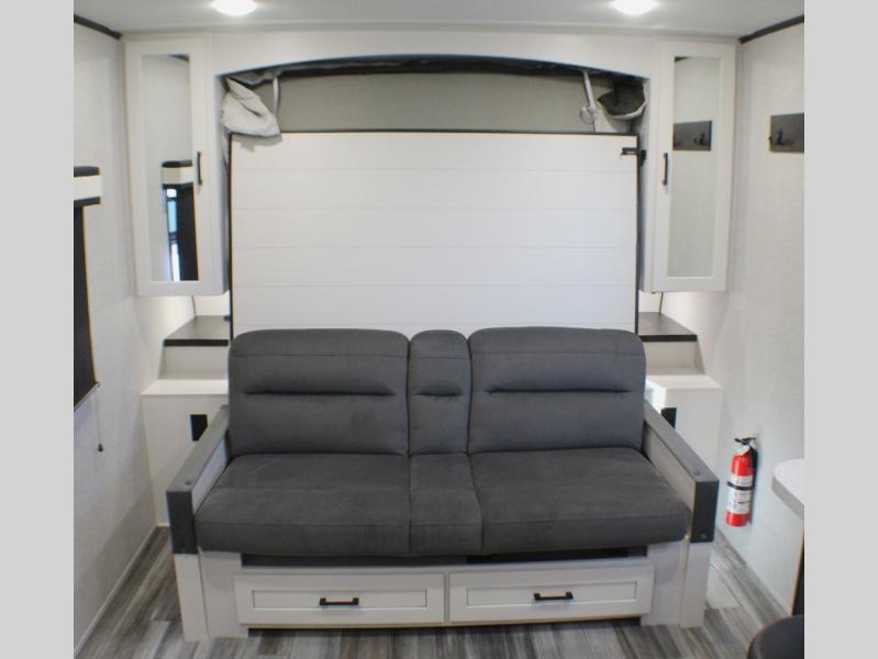 Light on weight doesn't mean light on features, and this Jay Feather Air proves that! You will appreciate the added space thanks to the kitchen slide out that houses the 11 cu. ft. 12V refrigerator and two burner cooktop. Your crew can enjoy meals together at the dining bar with a hinged top and two stools, or you can take your plate outdoors to sit under the 15' power awning with LED lights. The front Murphy bed can be folded away during the day so you can relax on the sofa, and your guests can make their bunk beds before heading out for the day. This model also includes ample storage space, including a pantry/wardrobe, overhead cabinets, dual bedside wardrobes, and outside storage!