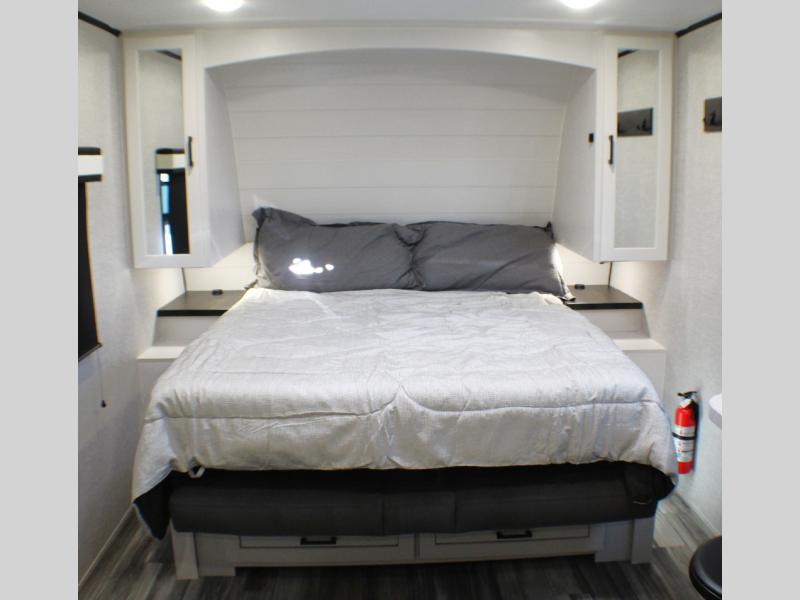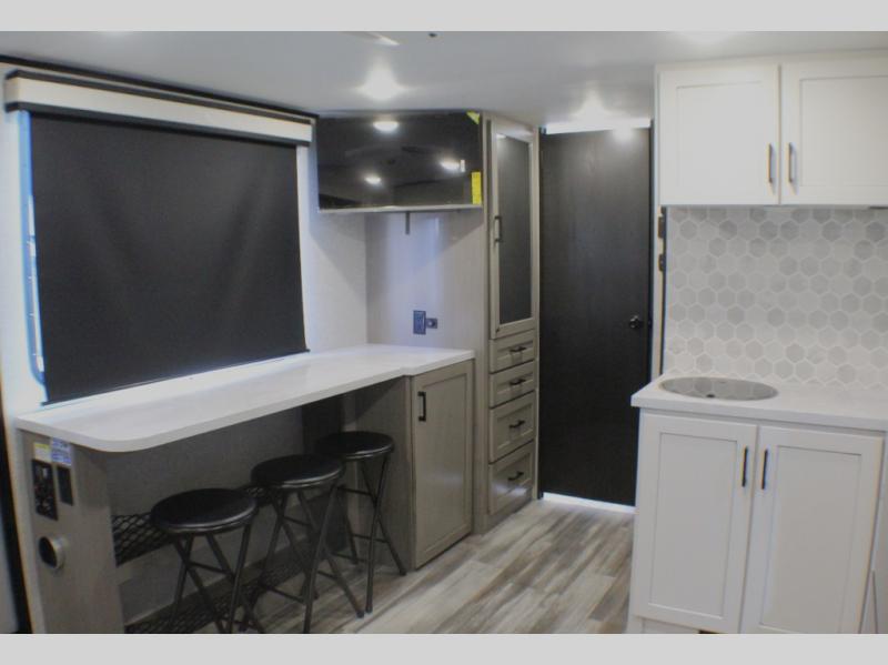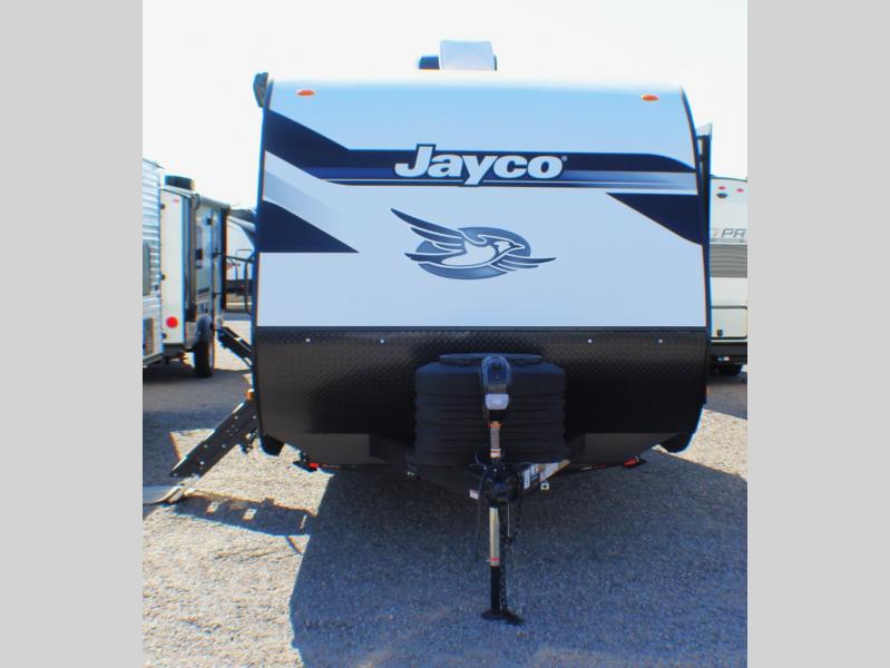 With any Jay Feather Air travel trailer by Jayco, you will enjoy lightweight towing and a variety of features to make each camping trip count! The Climate Shield insulation system helps extend your camping season by keeping you comfortable even in extreme weather conditions, and the Rock Solid stabilizer system means set up will be a breeze. An 18" rear roof ladder lets you easily clean the top of your Magnum Truss roof, and the 2" receiver will be perfect for your bike rack. The Overland 1 Solar Package with a 200W solar panel and 30-amp controller will provide off-grid capabilities, or you can can choose the optional Overland 2 Solar Package with two panels instead! Each Jay Feather Air includes residential-style seamless countertops inside, along with stainless steel sinks, decorative backsplash, and decorative roller shades with a reflective barrier to help keep the sun's rays out.