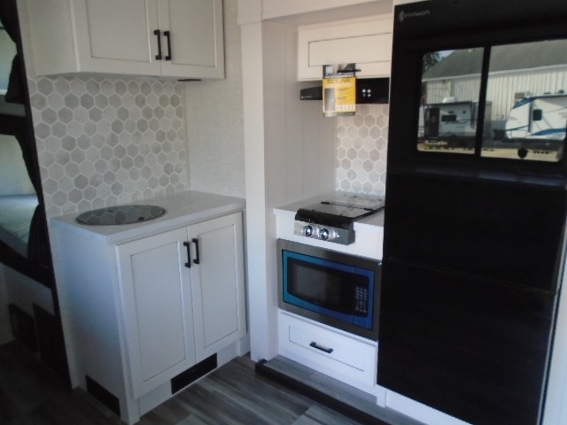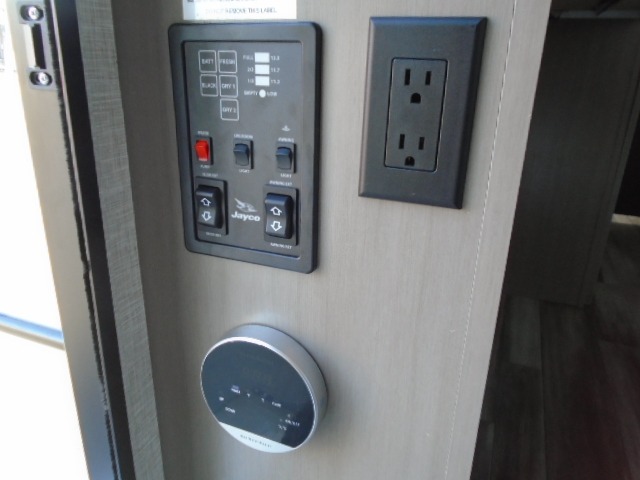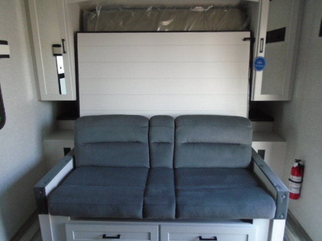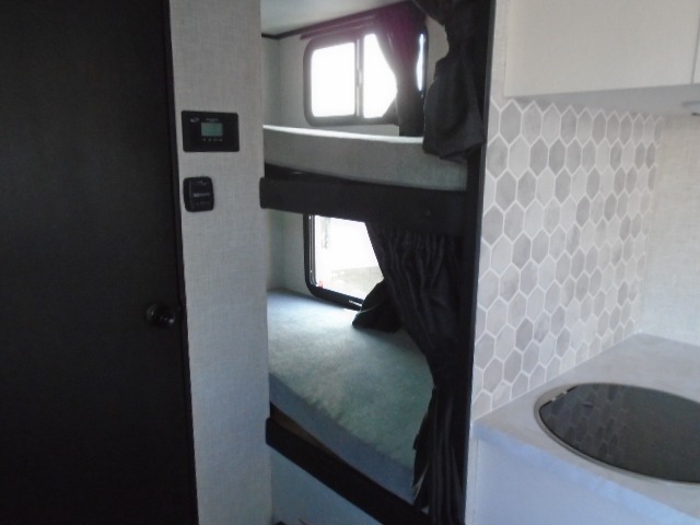 Light on weight doesn't mean light on features, and this Jay Feather Air proves that! You will appreciate the added space thanks to the kitchen slide out that houses the 11 cu. ft. 12V refrigerator and two burner cooktop. Your crew can enjoy meals together at the dining bar with a hinged top and three stools, or you can take your plate outdoors to sit under the 15' power awning with LED lights. The front Murphy bed can be folded away during the day so you can relax on the sofa, and your guests can make their bunk beds before heading out for the day. This model also includes ample storage space, including a pantry/wardrobe, overhead cabinets, dual bedside wardrobes, and outside storage!