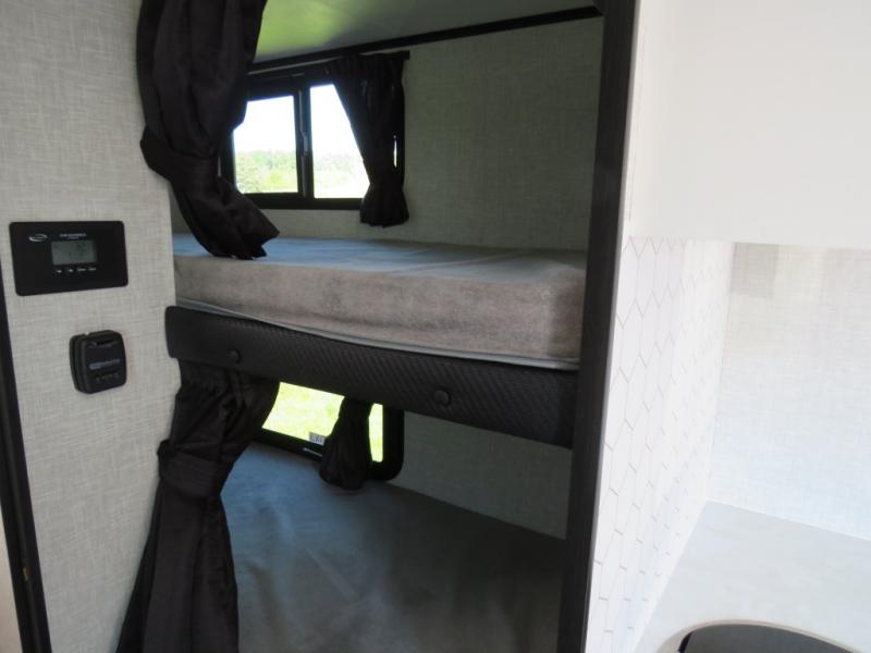 Light on weight doesn't mean light on features, and this Jay Feather Air proves that! You will appreciate the added space thanks to the kitchen slide out that houses the 11 cu. ft. 12V refrigerator and two burner cooktop. Your crew can enjoy meals together at the dining bar with a hinged top and two stools, or you can take your plate outdoors to sit under the 15' power awning with LED lights. The front Murphy bed can be folded away during the day so you can relax on the sofa, and your guests can make their bunk beds before heading out for the day. This model also includes ample storage space, including a pantry/wardrobe, overhead cabinets, dual bedside wardrobes, and outside storage!
