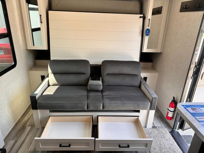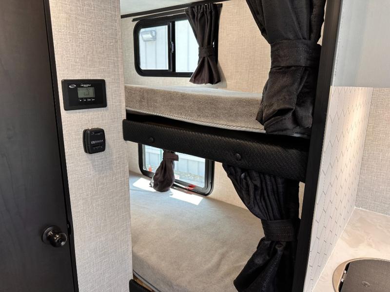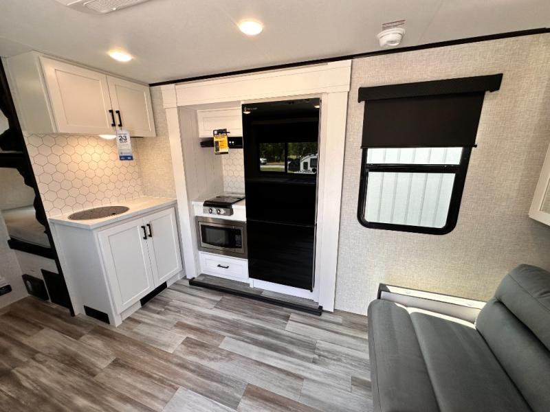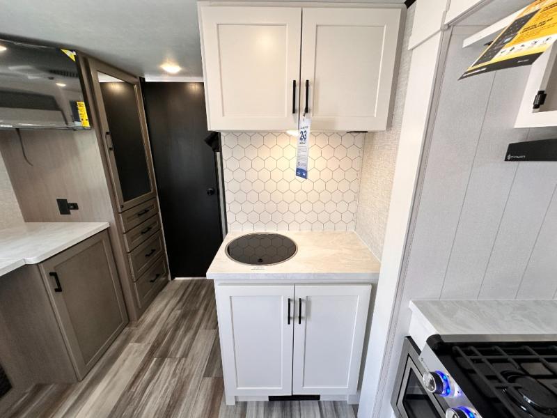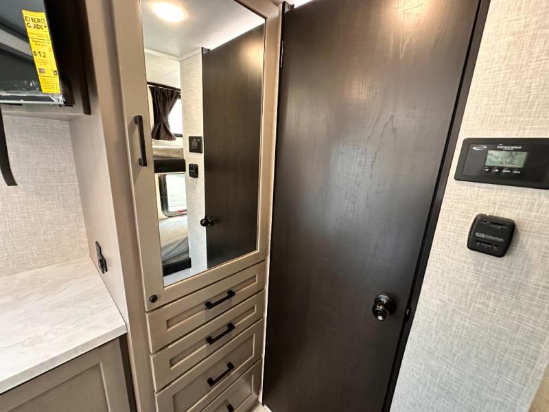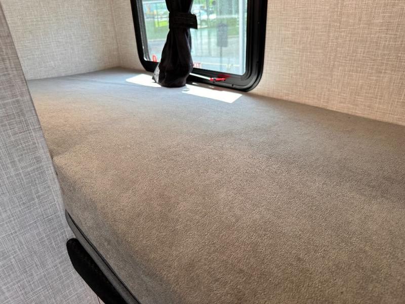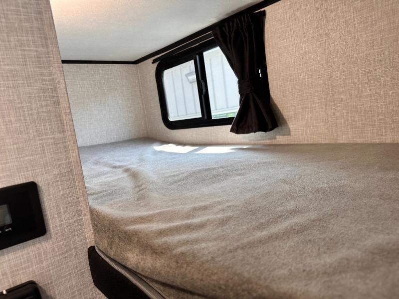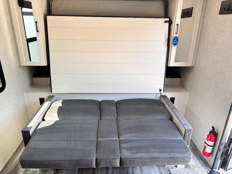 Light on weight doesn't mean light on features, and this Jay Feather Air proves that! You will appreciate the added space thanks to the kitchen slide out that houses the 11 cu. ft. 12V refrigerator and two burner cooktop. Your crew can enjoy meals together at the dining bar with a hinged top and two stools, or you can take your plate outdoors to sit under the 15' power awning with LED lights. The front Murphy bed can be folded away during the day so you can relax on the sofa, and your guests can make their bunk beds before heading out for the day. This model also includes ample storage space, including a pantry/wardrobe, overhead cabinets, dual bedside wardrobes, and outside storage!