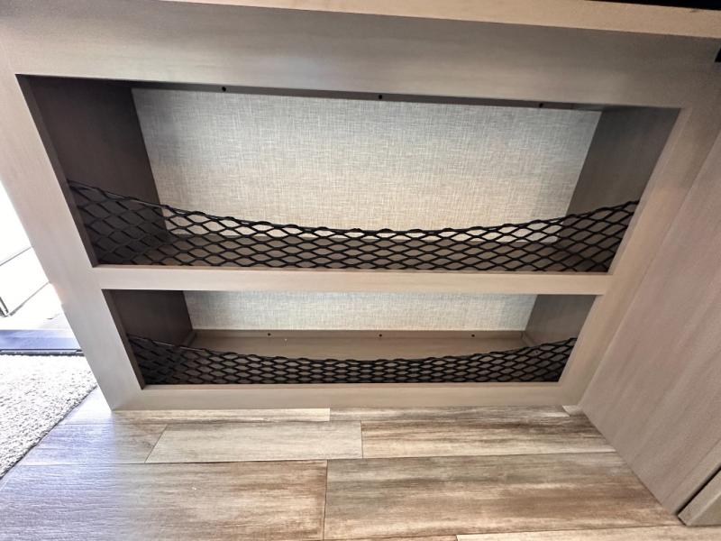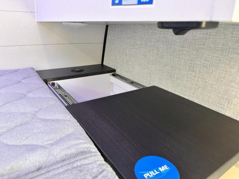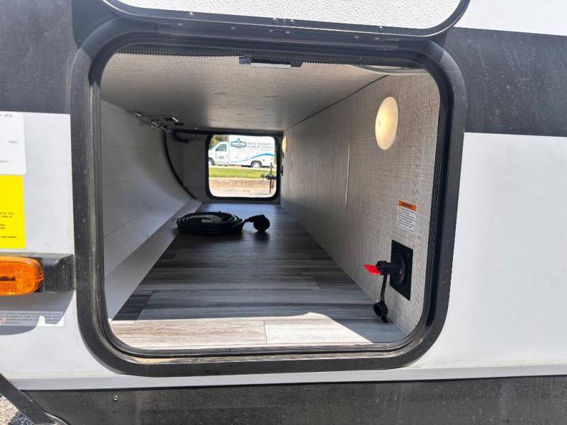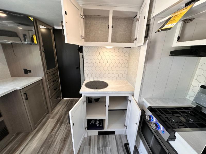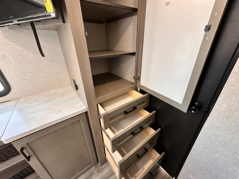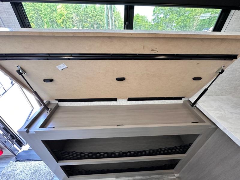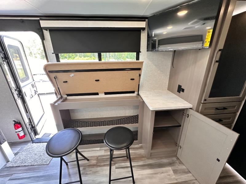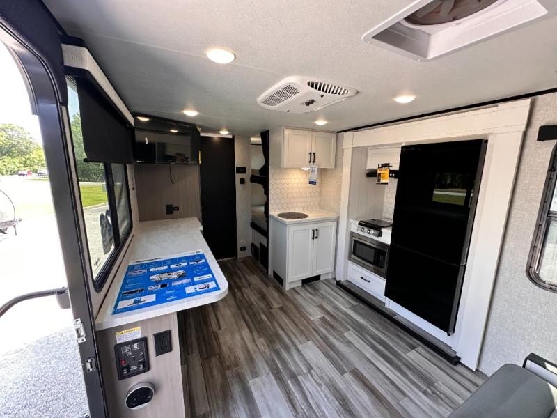 Light on weight doesn't mean light on features, and this Jay Feather Air proves that! You will appreciate the added space thanks to the kitchen slide out that houses the 11 cu. ft. 12V refrigerator and two burner cooktop. Your crew can enjoy meals together at the dining bar with a hinged top and two stools, or you can take your plate outdoors to sit under the 15' power awning with LED lights. The front Murphy bed can be folded away during the day so you can relax on the sofa, and your guests can make their bunk beds before heading out for the day. This model also includes ample storage space, including a pantry/wardrobe, overhead cabinets, dual bedside wardrobes, and outside storage!