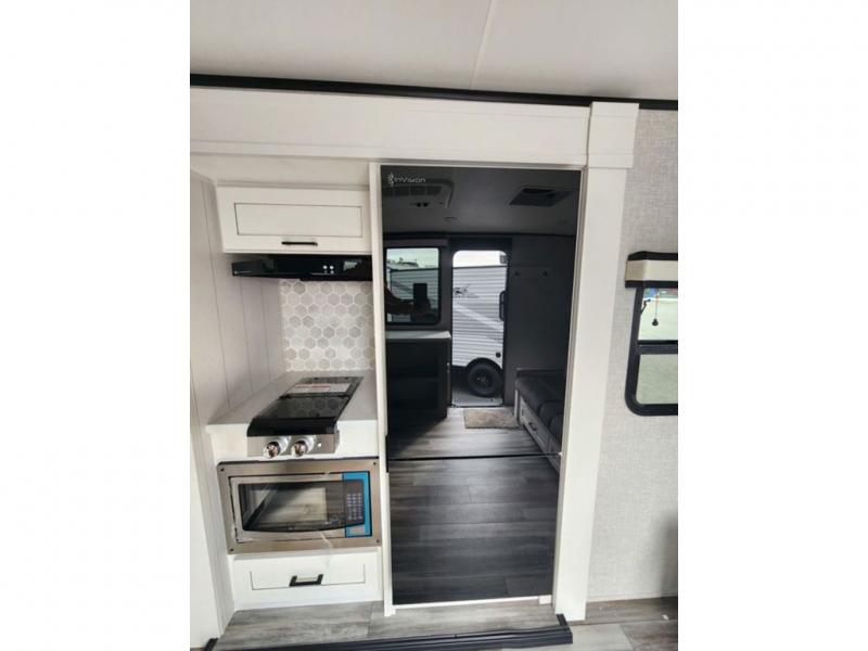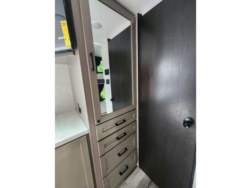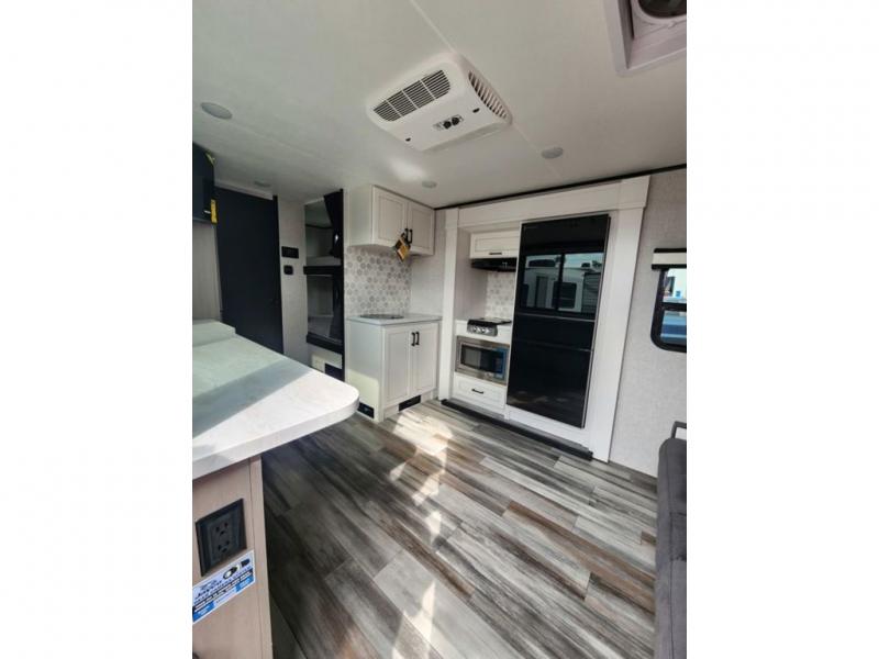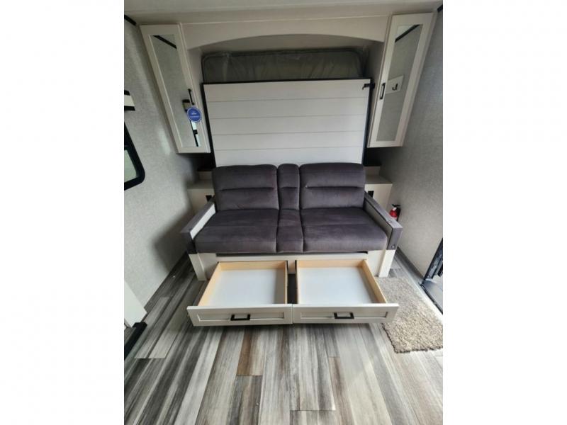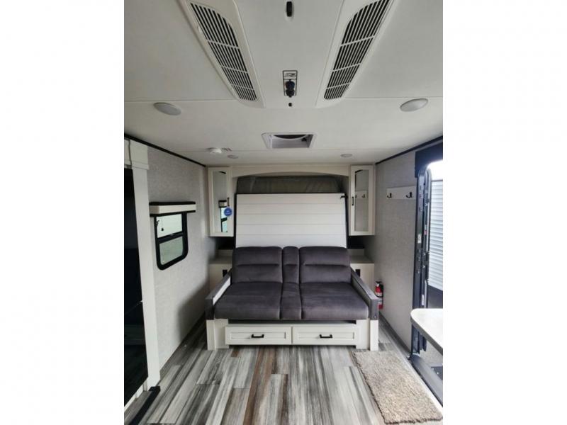 Light on weight doesn't mean light on features, and this Jay Feather Air proves that! You will appreciate the added space thanks to the kitchen slide out that houses the 11 cu. ft. 12V refrigerator and two burner cooktop. Your crew can enjoy meals together at the dining bar with a hinged top and two stools, or you can take your plate outdoors to sit under the 15' power awning with LED lights. The front Murphy bed can be folded away during the day so you can relax on the sofa, and your guests can make their bunk beds before heading out for the day. This model also includes ample storage space, including a pantry/wardrobe, overhead cabinets, dual bedside wardrobes, and outside storage!