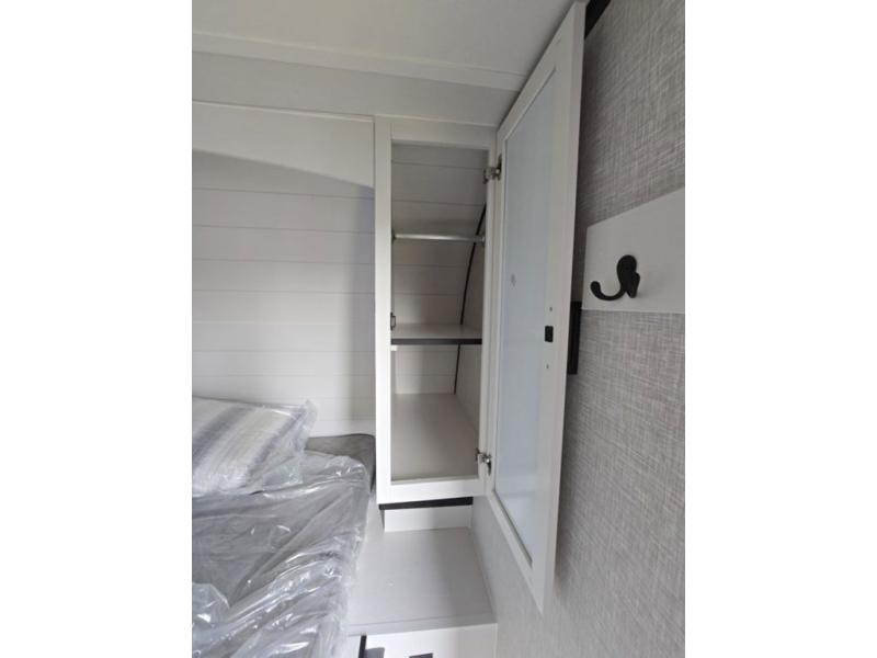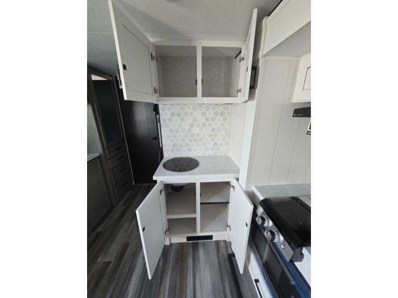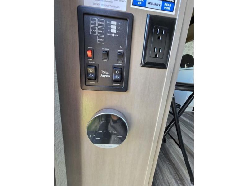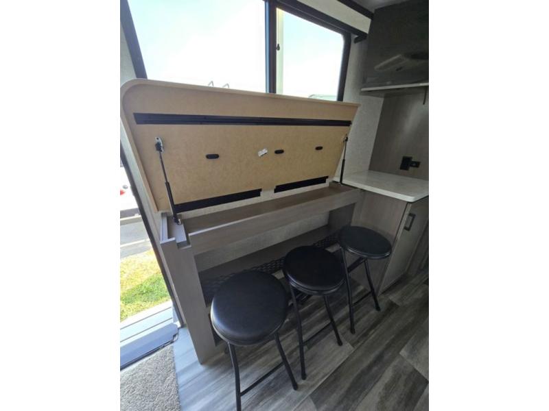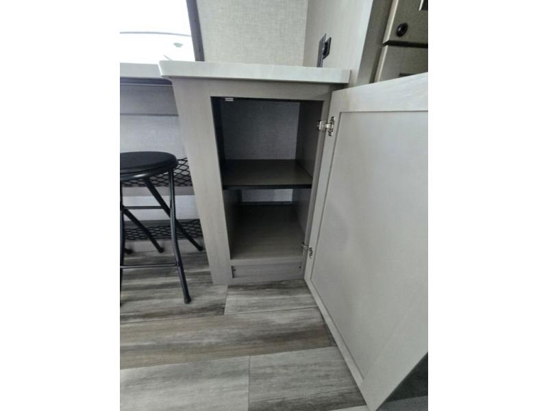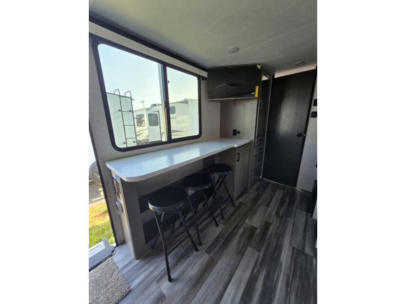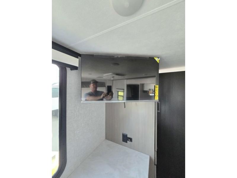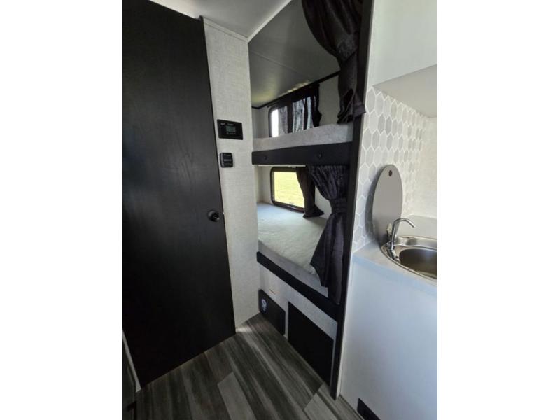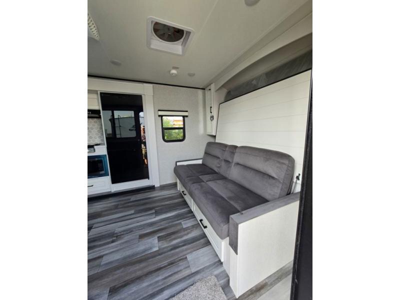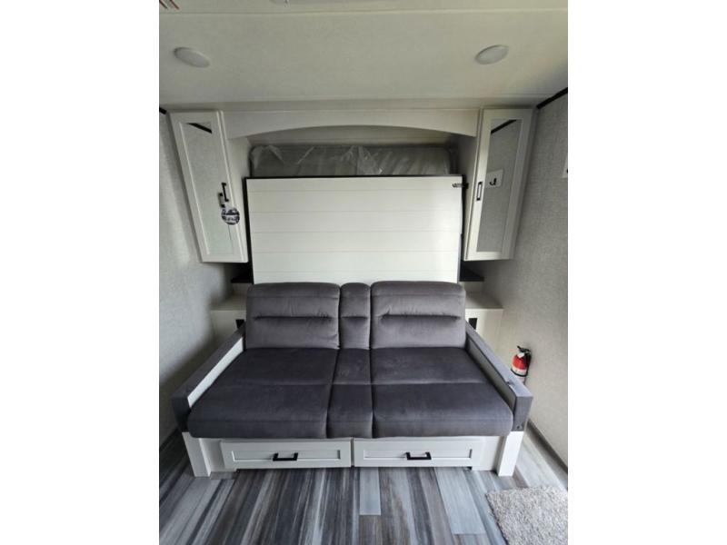 Light on weight doesn't mean light on features, and this Jay Feather Air proves that! You will appreciate the added space thanks to the kitchen slide out that houses the 11 cu. ft. 12V refrigerator and two burner cooktop. Your crew can enjoy meals together at the dining bar with a hinged top and two stools, or you can take your plate outdoors to sit under the 15' power awning with LED lights. The front Murphy bed can be folded away during the day so you can relax on the sofa, and your guests can make their bunk beds before heading out for the day. This model also includes ample storage space, including a pantry/wardrobe, overhead cabinets, dual bedside wardrobes, and outside storage!