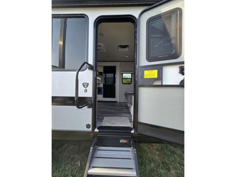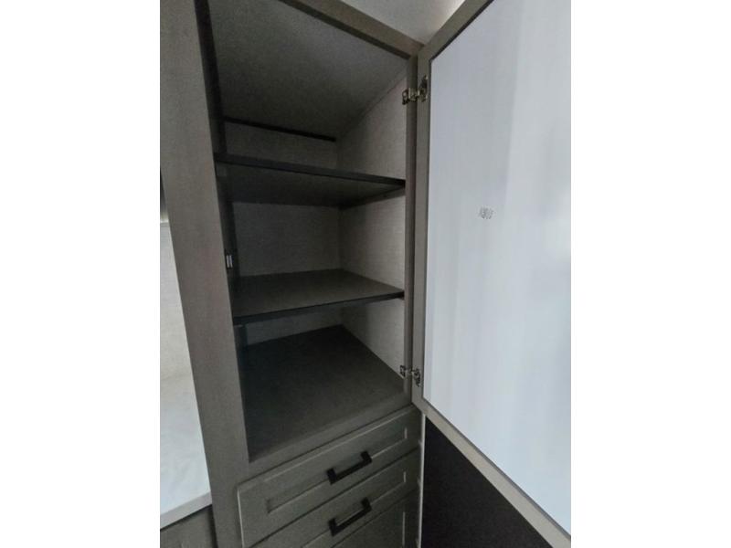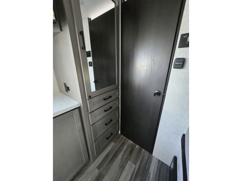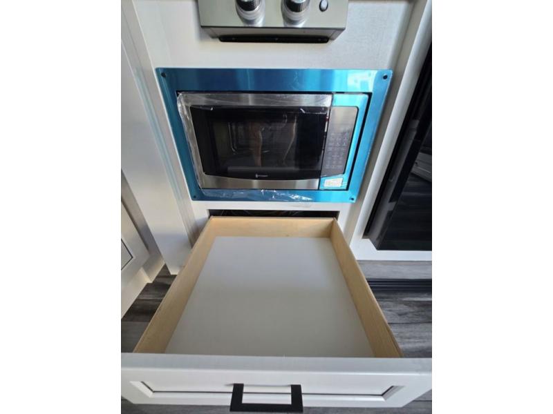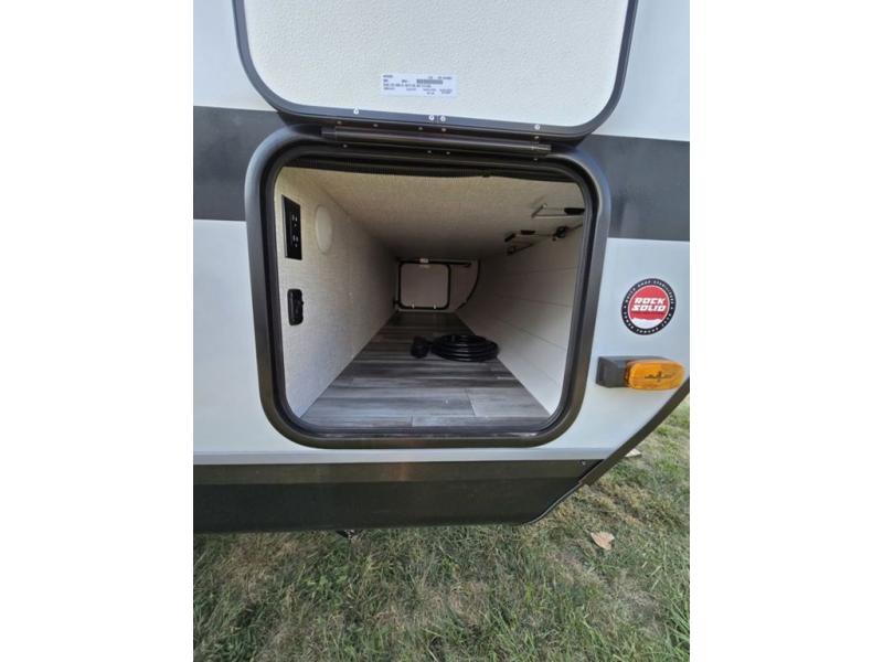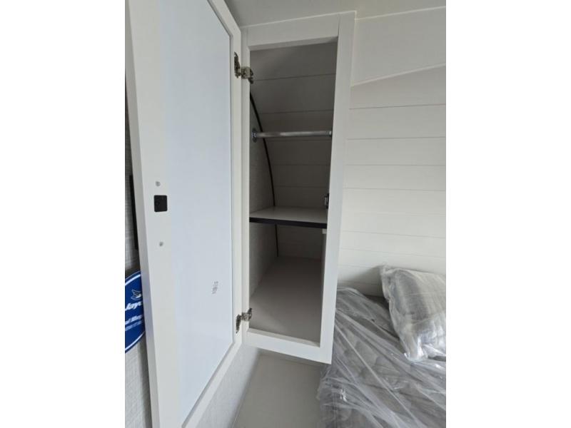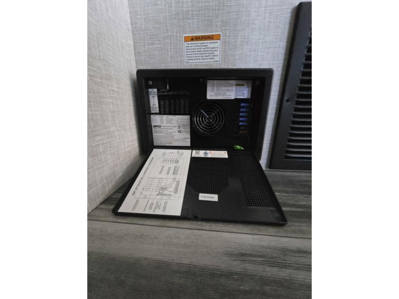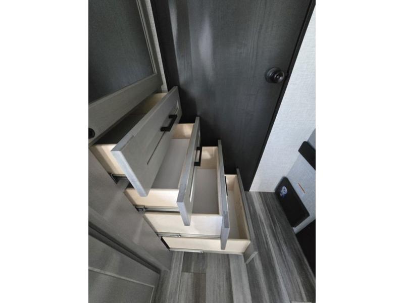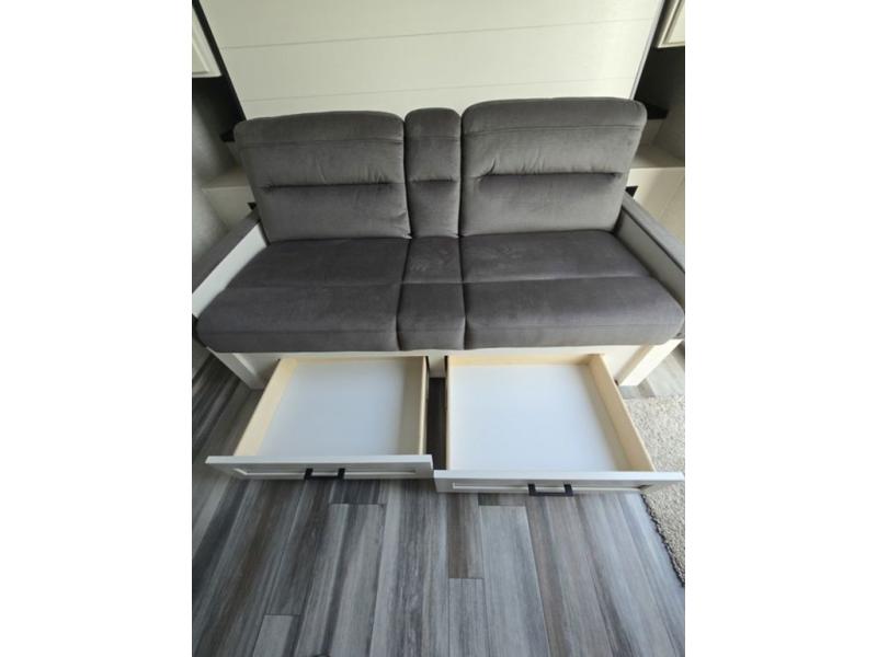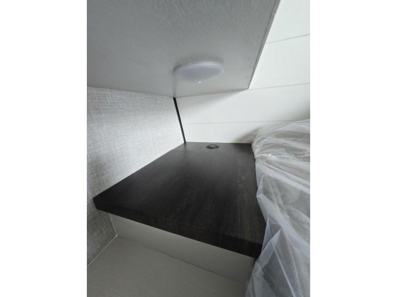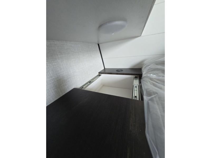 Light on weight doesn't mean light on features, and this Jay Feather Air proves that! You will appreciate the added space thanks to the kitchen slide out that houses the 11 cu. ft. 12V refrigerator and two burner cooktop. Your crew can enjoy meals together at the dining bar with a hinged top and two stools, or you can take your plate outdoors to sit under the 15' power awning with LED lights. The front Murphy bed can be folded away during the day so you can relax on the sofa, and your guests can make their bunk beds before heading out for the day. This model also includes ample storage space, including a pantry/wardrobe, overhead cabinets, dual bedside wardrobes, and outside storage!