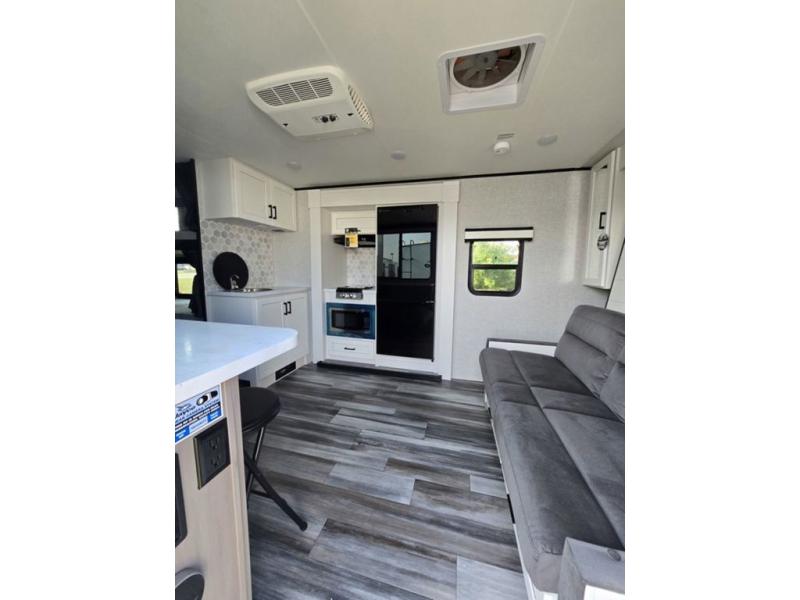 With any Jay Feather Air travel trailer by Jayco, you will enjoy lightweight towing and a variety of features to make each camping trip count! The Climate Shield insulation system helps extend your camping season by keeping you comfortable even in extreme weather conditions, and the Rock Solid stabilizer system means set up will be a breeze. An 18" rear roof ladder lets you easily clean the top of your Magnum Truss roof, and the 2" receiver will be perfect for your bike rack. The Overland 1 Solar Package with a 200W solar panel and 30-amp controller will provide off-grid capabilities, or you can can choose the optional Overland 2 Solar Package with two panels instead! Each Jay Feather Air includes residential-style seamless countertops inside, along with stainless steel sinks, decorative backsplash, and decorative roller shades with a reflective barrier to help keep the sun's rays out.