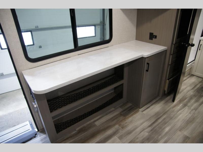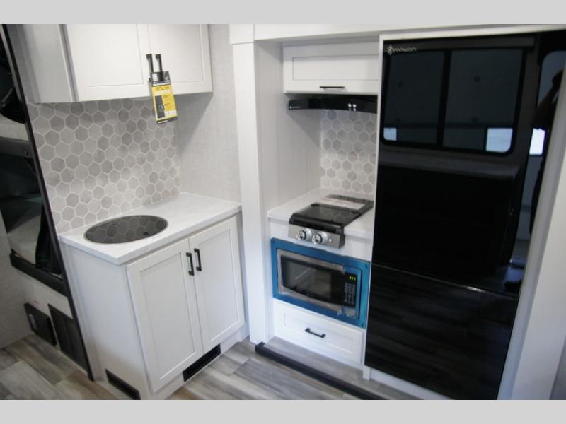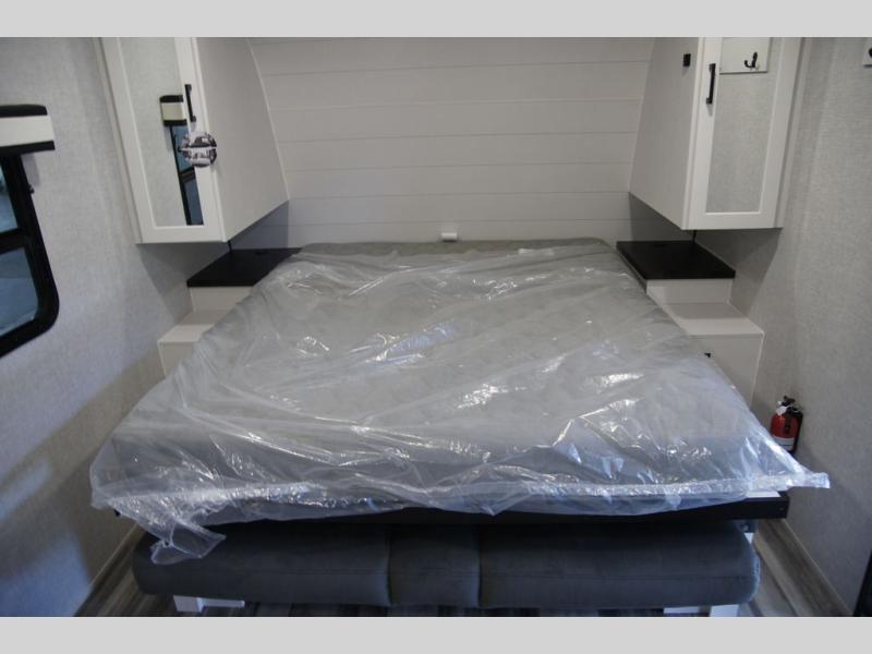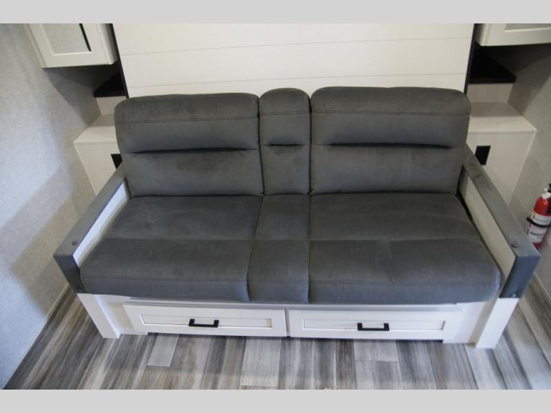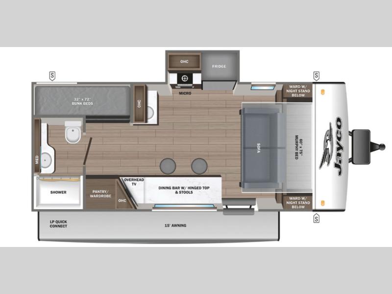 Light on weight doesn't mean light on features, and this Jay Feather Air proves that! You will appreciate the added space thanks to the kitchen slide out that houses the 11 cu. ft. 12V refrigerator and two burner cooktop. Your crew can enjoy meals together at the dining bar with a hinged top and two stools, or you can take your plate outdoors to sit under the 15' power awning with LED lights. The front Murphy bed can be folded away during the day so you can relax on the sofa, and your guests can make their bunk beds before heading out for the day. This model also includes ample storage space, including a pantry/wardrobe, overhead cabinets, dual bedside wardrobes, and outside storage!