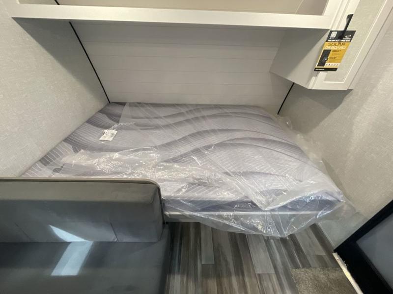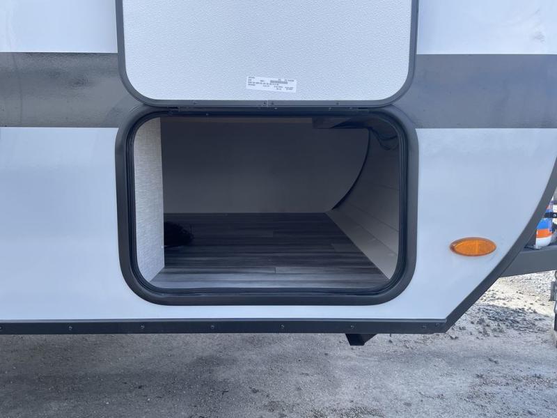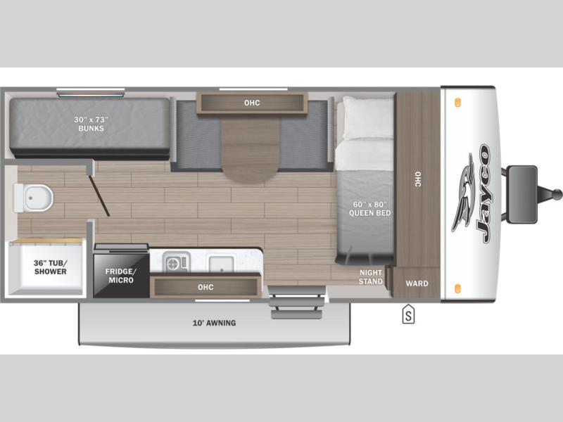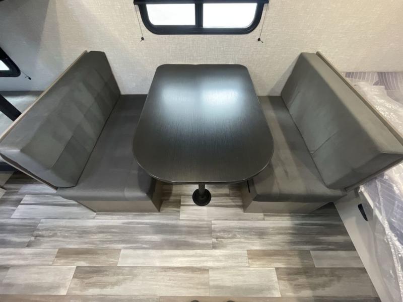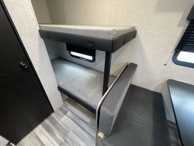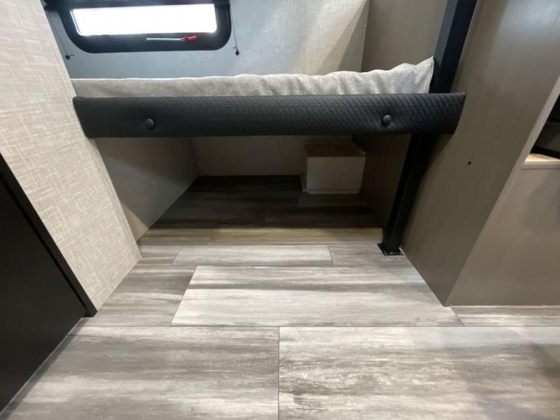 This compact travel trailer has everything you need for convenient camping trips! Once you arrive at the park, you can unload the exterior storage and put out the 10' power awning. The two burner cooktop and microwave oven will let you make lunch for your crew, and there is a 5 cu. ft. 12V refrigerator to keep your cold items fresh. A booth dinette will provide dining space when you don't want to eat outdoors, and this can convert to sleeping space for one guest or two little ones. You'll appreciate the private bath with a toilet and 36" tub/shower to freshen up in each day, and the bunk beds in the back provide compact sleeping space for more campers. The front queen bed will be reserved just for you, and there is a nightstand, wardrobe, and overhead cabinet here to keep your things tidy!