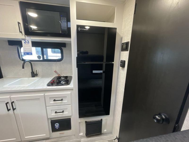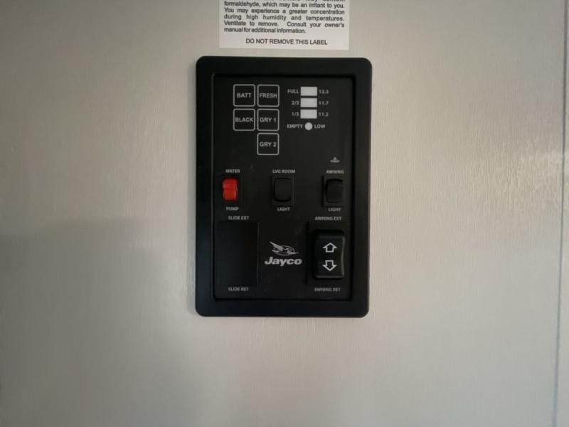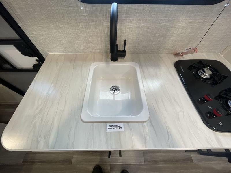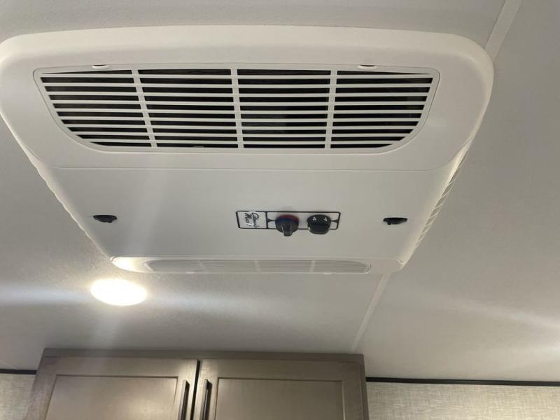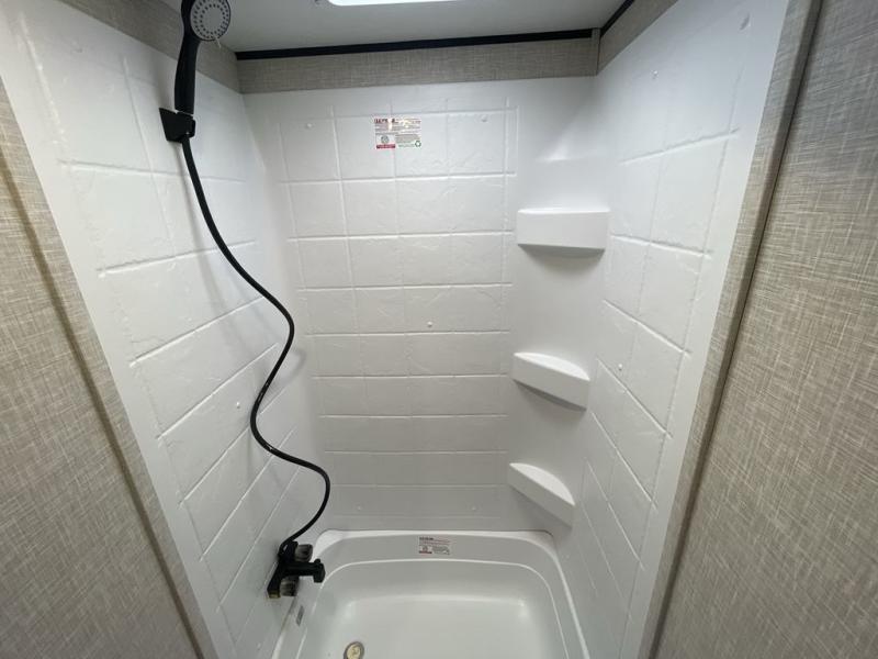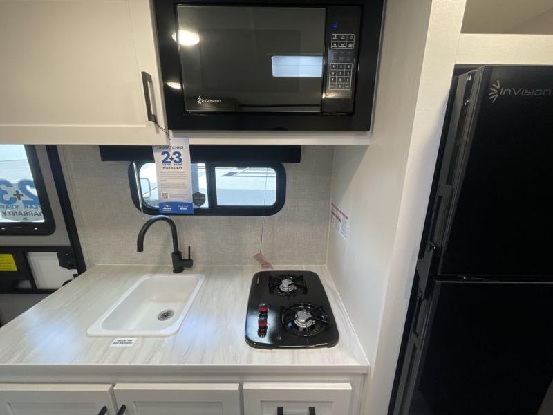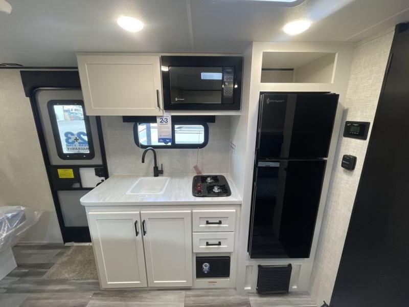 This compact travel trailer has everything you need for convenient camping trips! Once you arrive at the park, you can unload the exterior storage and put out the 10' power awning. The two burner cooktop and microwave oven will let you make lunch for your crew, and there is a 5 cu. ft. 12V refrigerator to keep your cold items fresh. A booth dinette will provide dining space when you don't want to eat outdoors, and this can convert to sleeping space for one guest or two little ones. You'll appreciate the private bath with a toilet and 36" tub/shower to freshen up in each day, and the bunk beds in the back provide compact sleeping space for more campers. The front queen bed will be reserved just for you, and there is a nightstand, wardrobe, and overhead cabinet here to keep your things tidy!