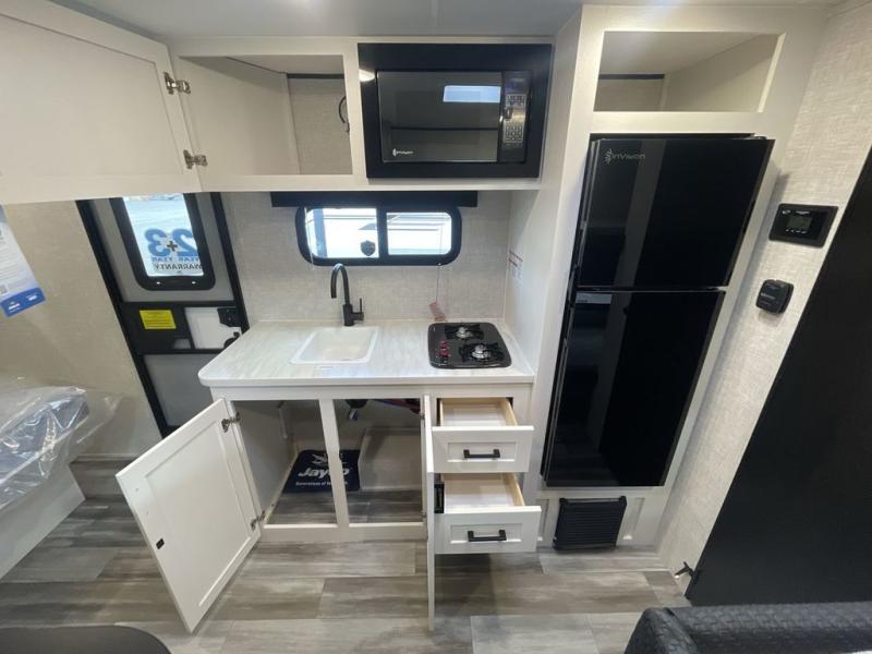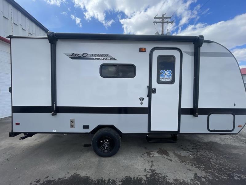 The Jay Feather Air SL travel trailer by Jayco is affordable, convenient, and lightweight for an easier tow! A Magnum Truss roof system and fully integrated A-frame provide a strong foundation to the trailer, plus there are galvanized-steel, impact resistant wheel wells for added protection. Some of the exterior conveniences you'll find include a front tongue jack and stabilizer jacks, roof mount solar prep, an exterior porch light, and G20 dark tinted privacy windows. Head inside to enjoy solid hardwood cabinet doors, residential-style kitchen countertops, a marine-grade toilet with foot flush, and vinyl flooring throughout that will be easy to keep clean. This super lite travel trailer is the perfect choice for rookie RVers and seasoned campers alike!