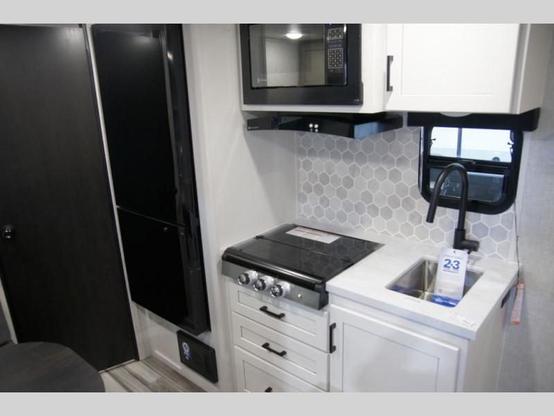 Jayco's Jay Feather Micro travel trailer is ready for adventure at the drop of a hat! The Climate Shield weather protection will let you camp well into the colder months and the Stronghold VBL with double-sized Azdel is ultra durable. The Jay Pro Package includes radial tires with self-adjusting brakes, a rear-mounted roof ladder, and the Overlander 1 Solar Package with a 200W solar panel. Additional exterior features include marine grade exterior speakers, a swing-out entry door assist handle, a power tongue jack, and more! Inside, you will love the 4-inch high-density dinette cushions with vinyl backing for easy cleaning, along with the handcrafted hardwood door/drawer fronts, residential style kitchen countertops, and decorative roller shades with a reflective barrier for better insulation.