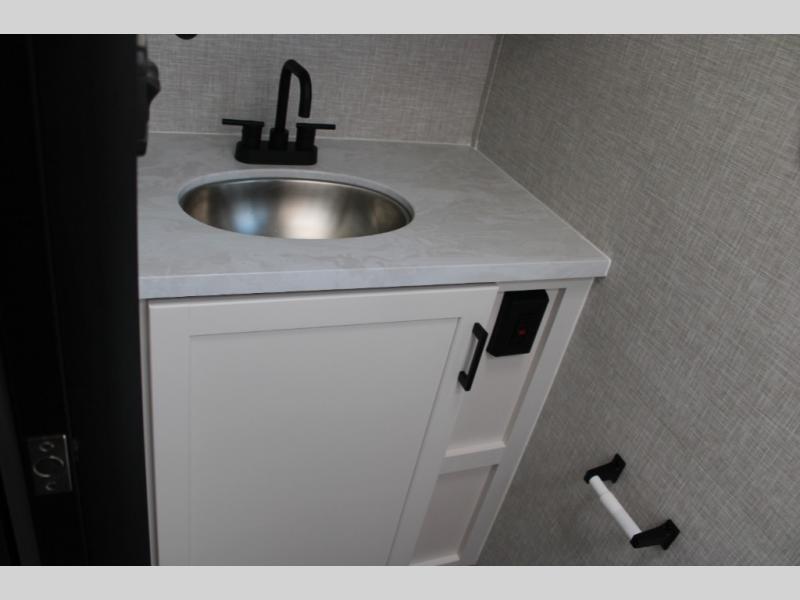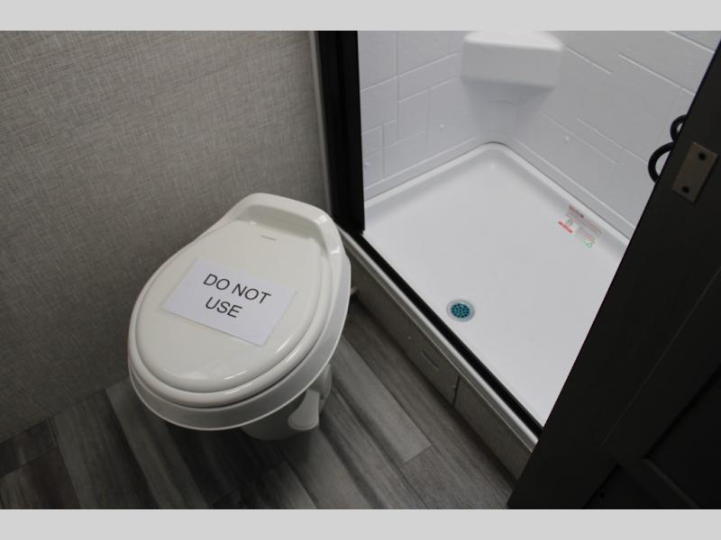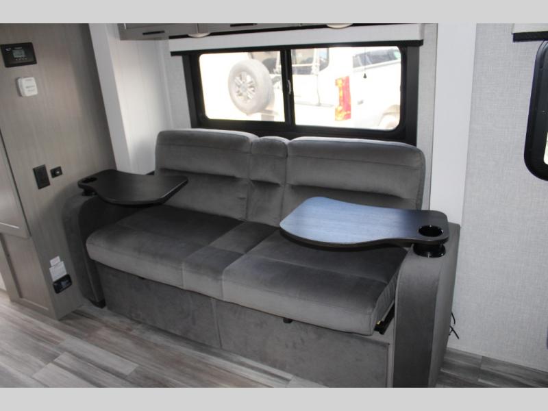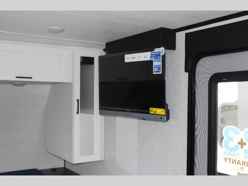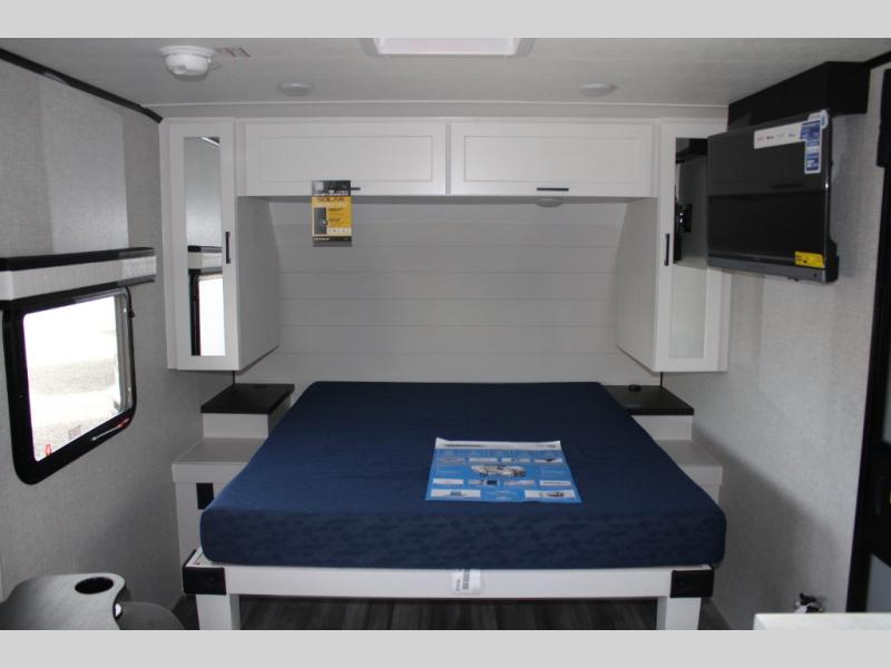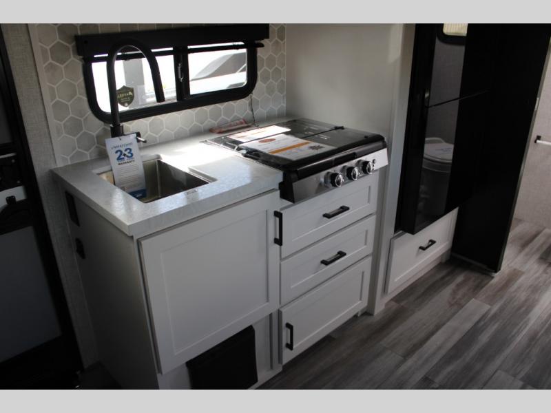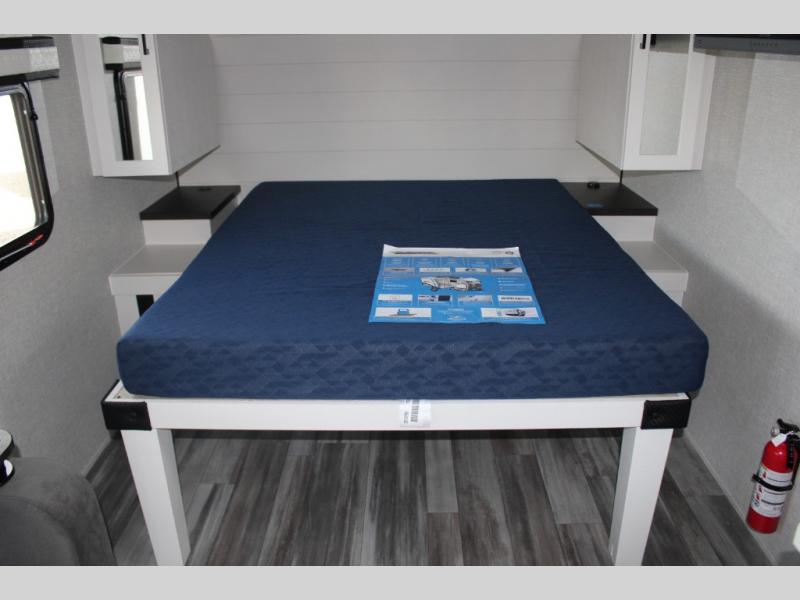 This cozy travel trailer is the perfect couple's trailer with space for an overnight guest on the jack-knife sofa with swivel tables. You'll sleep soundly each night on the front 60" x 75" queen bed, and there are dual wardrobes and nightstands to keep your space tidy. Whip up some eggs on the three burner cooktop, or use the microwave oven for instant oatmeal, plus there is an outside griddle for the JayPort system so you can make breakfast outside. You will also find plenty of storage space throughout, including a large kitchen pantry, overhead cabinets, and exterior storage!
