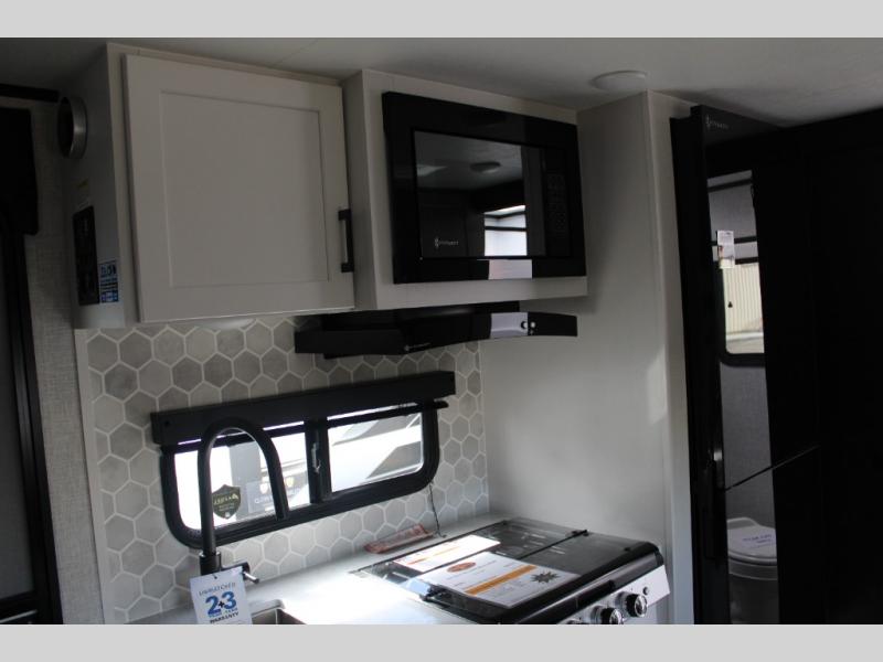 Jayco's Jay Feather Micro travel trailer is ready for adventure at the drop of a hat! The Climate Shield weather protection will let you camp well into the colder months and the Stronghold VBL with double-sized Azdel is ultra durable. The Jay Pro Package includes radial tires with self-adjusting brakes, a rear-mounted roof ladder, and the Overlander 1 Solar Package with a 200W solar panel. Additional exterior features include marine grade exterior speakers, a swing-out entry door assist handle, a power tongue jack, and more! Inside, you will love the 4-inch high-density dinette cushions with vinyl backing for easy cleaning, along with the handcrafted hardwood door/drawer fronts, residential style kitchen countertops, and decorative roller shades with a reflective barrier for better insulation.