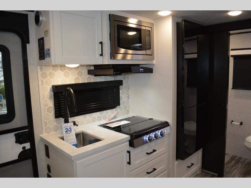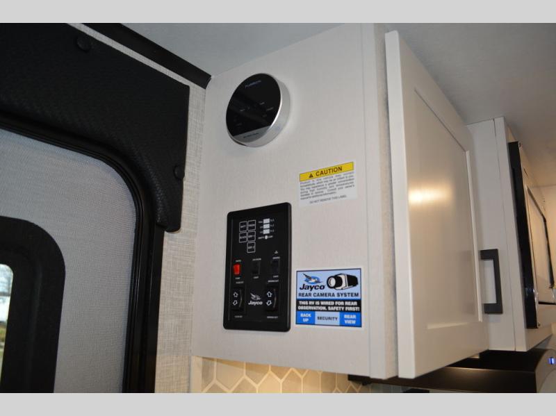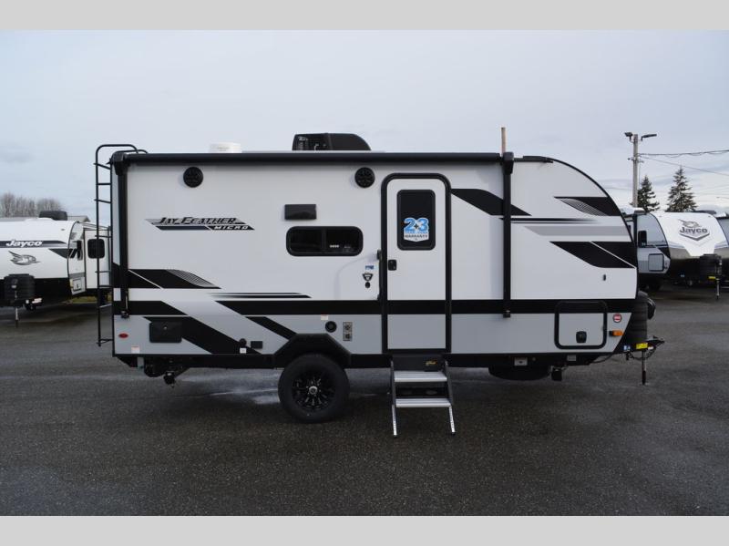Jayco's Jay Feather Micro travel trailer is ready for adventure at the drop of a hat! The Climate Shield weather protection will let you camp well into the colder months and the Stronghold VBL with double-sized Azdel is ultra durable. The Jay Pro Package includes radial tires with self-adjusting brakes, a rear-mounted roof ladder, and the Overlander 1 Solar Package with a 200W solar panel. Additional exterior features include marine grade exterior speakers, a swing-out entry door assist handle, a power tongue jack, and more! Inside, you will love the 4-inch high-density dinette cushions with vinyl backing for easy cleaning, along with the handcrafted hardwood door/drawer fronts, residential style kitchen countertops, and decorative roller shades with a reflective barrier for better insulation.