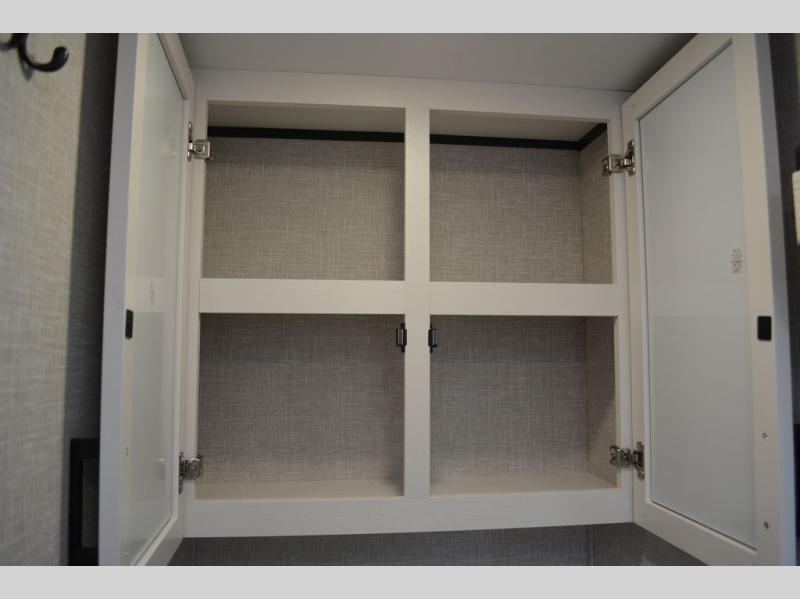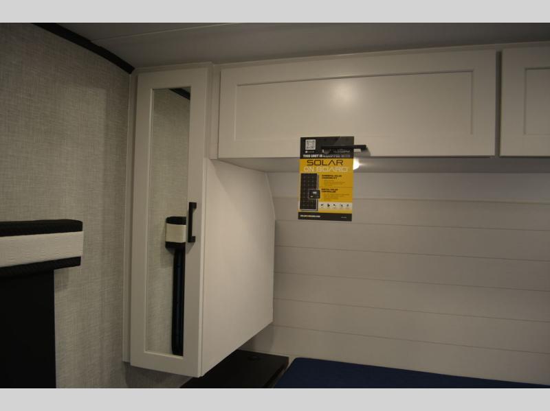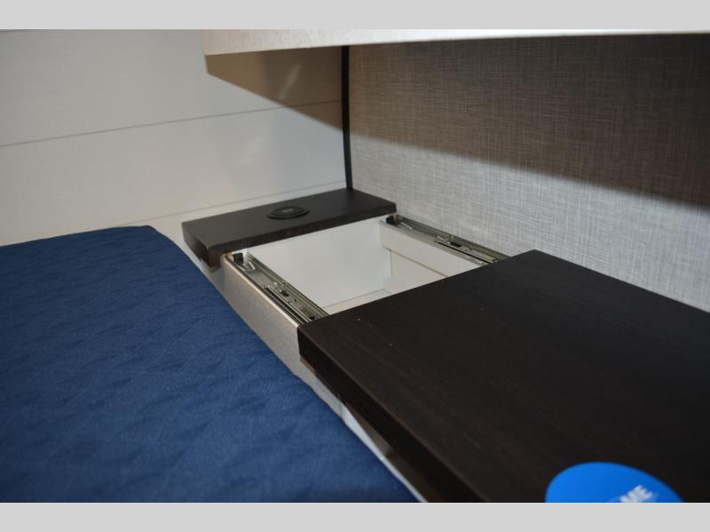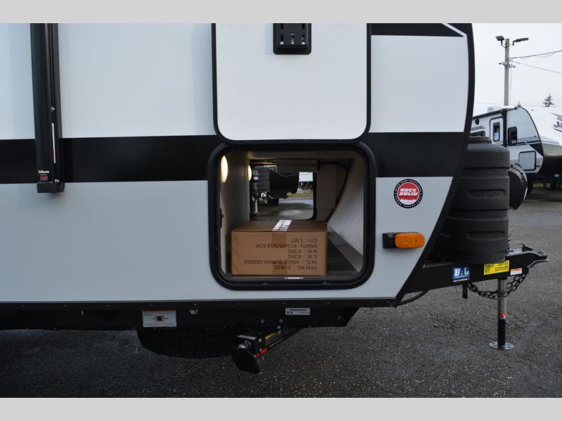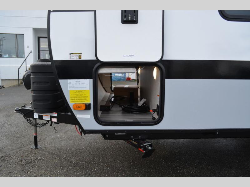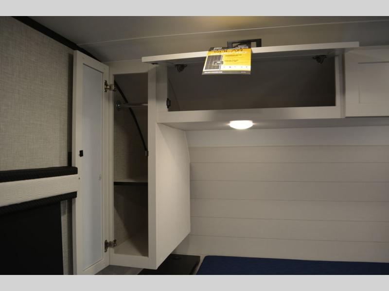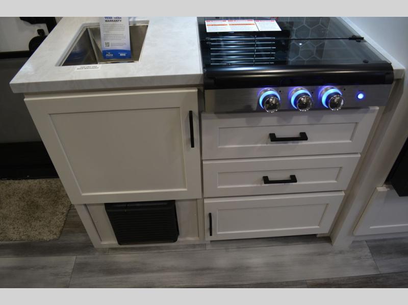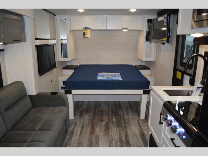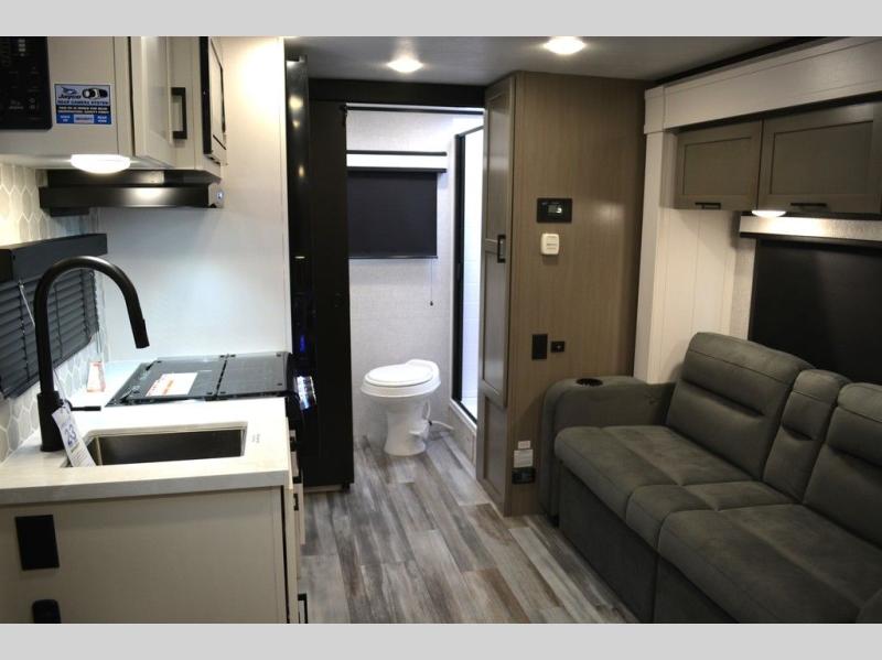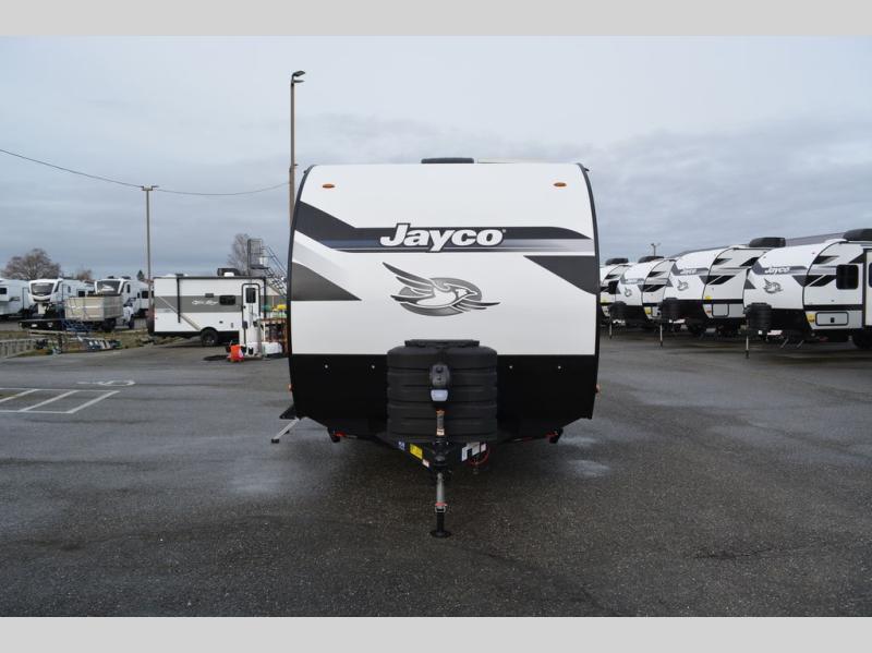 This cozy travel trailer is the perfect couple's trailer with space for an overnight guest on the jack-knife sofa with swivel tables. You'll sleep soundly each night on the front 60" x 75" queen bed, and there are dual wardrobes and nightstands to keep your space tidy. Whip up some eggs on the three burner cooktop, or use the microwave oven for instant oatmeal, plus there is an outside griddle for the JayPort system so you can make breakfast outside. You will also find plenty of storage space throughout, including a large kitchen pantry, overhead cabinets, and exterior storage!