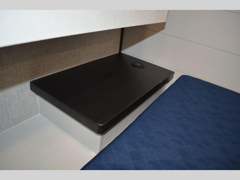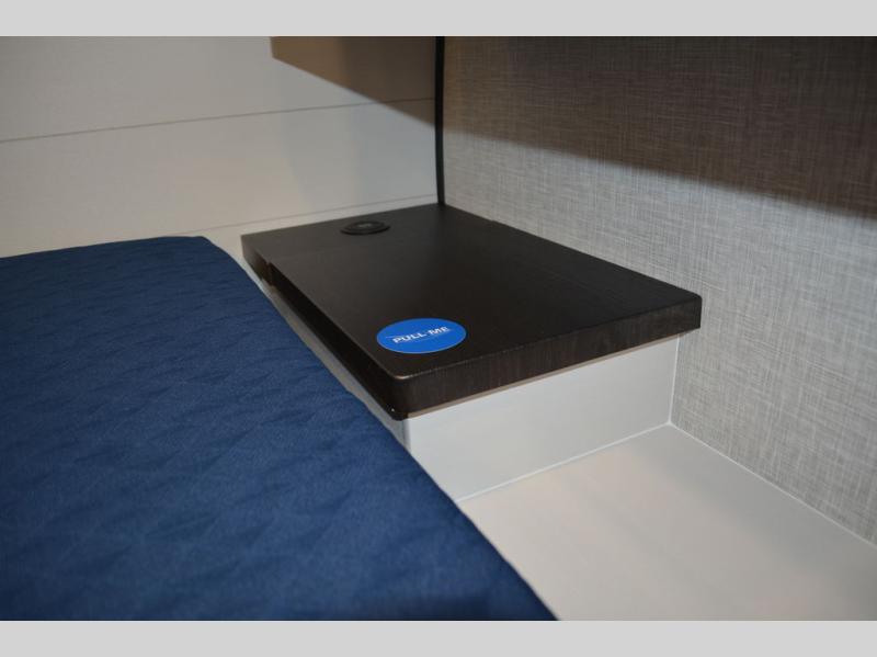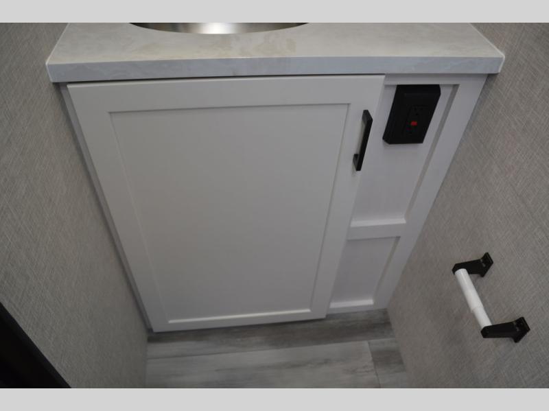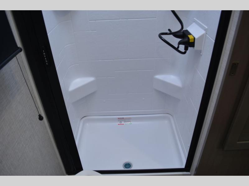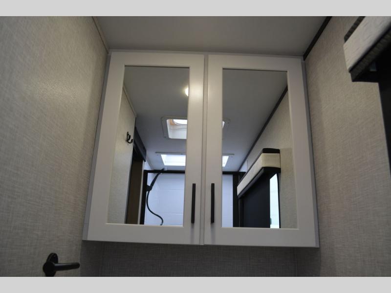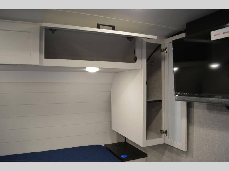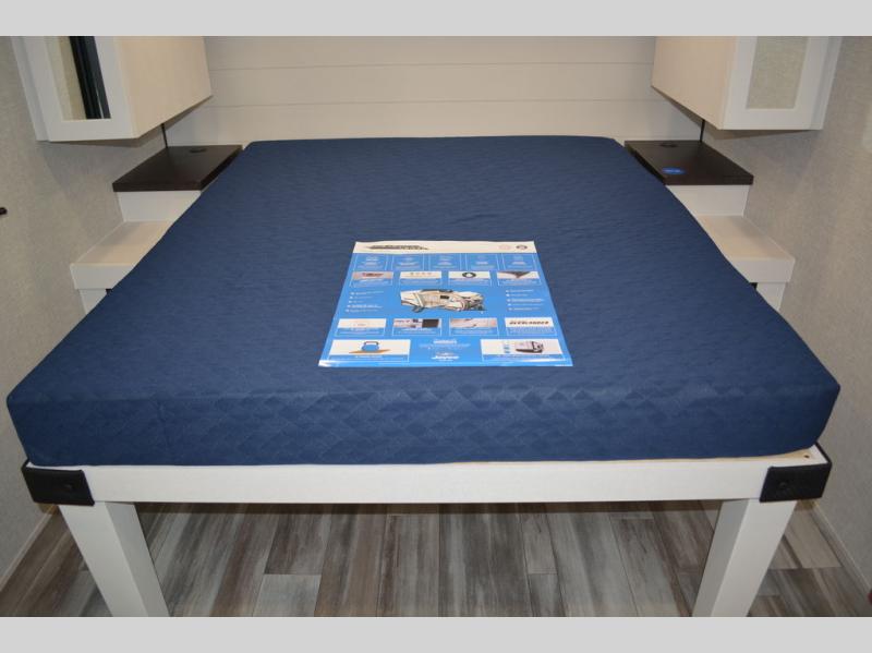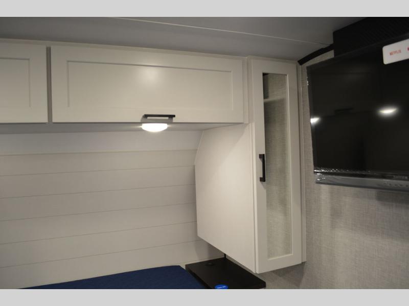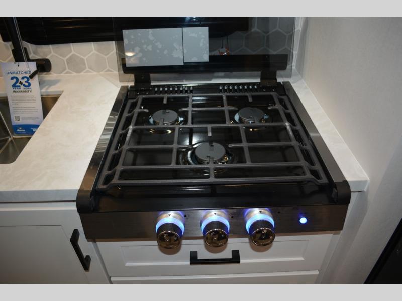 This cozy travel trailer is the perfect couple's trailer with space for an overnight guest on the jack-knife sofa with swivel tables. You'll sleep soundly each night on the front 60" x 75" queen bed, and there are dual wardrobes and nightstands to keep your space tidy. Whip up some eggs on the three burner cooktop, or use the microwave oven for instant oatmeal, plus there is an outside griddle for the JayPort system so you can make breakfast outside. You will also find plenty of storage space throughout, including a large kitchen pantry, overhead cabinets, and exterior storage!