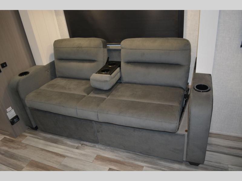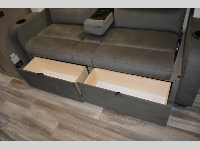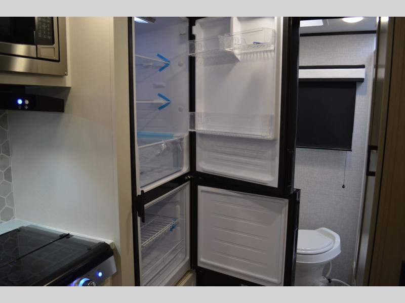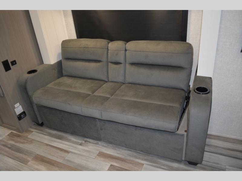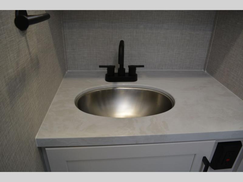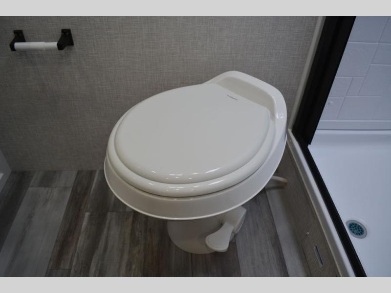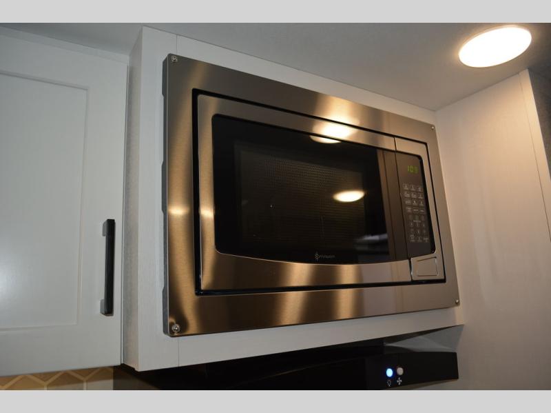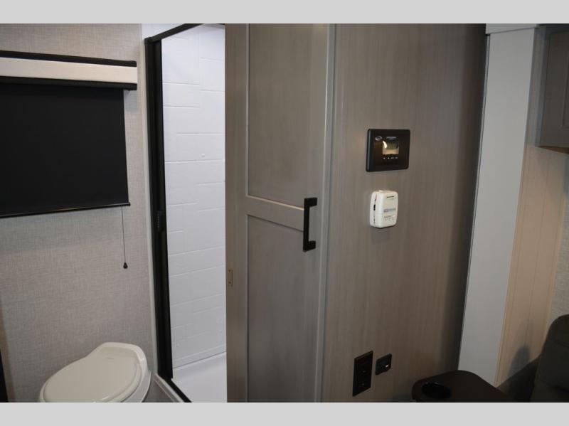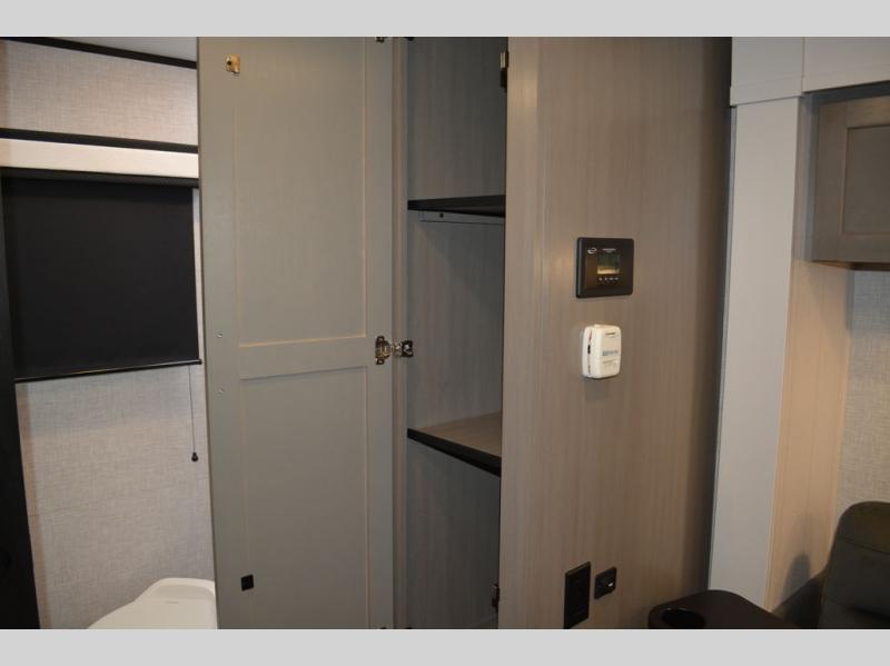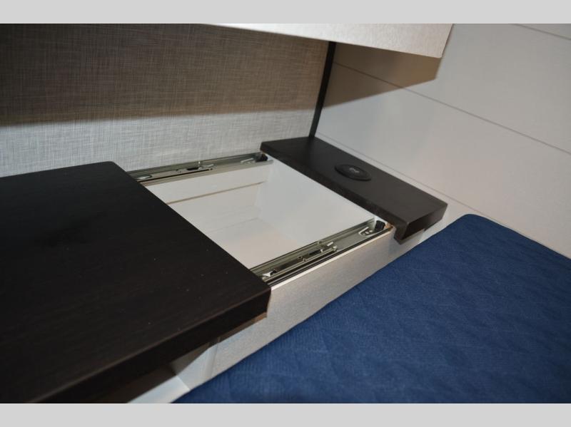 This cozy travel trailer is the perfect couple's trailer with space for an overnight guest on the jack-knife sofa with swivel tables. You'll sleep soundly each night on the front 60" x 75" queen bed, and there are dual wardrobes and nightstands to keep your space tidy. Whip up some eggs on the three burner cooktop, or use the microwave oven for instant oatmeal, plus there is an outside griddle for the JayPort system so you can make breakfast outside. You will also find plenty of storage space throughout, including a large kitchen pantry, overhead cabinets, and exterior storage!