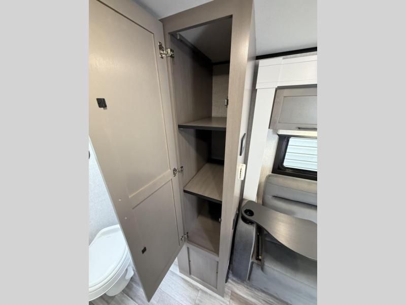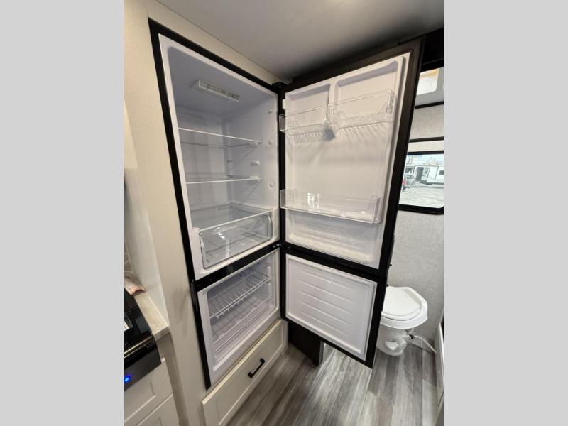 New this year, the 2025 Jay Feather Micro features classy seamless countertops throughout and stainless-steel kitchen and bath sinks. We've added a new roller-style shower enclosure that opens up the space in the bathroom (excludes 166FBS). And it only gets better with the all-new InVision Suite appliance package, which offers an 11 cubic foot 12V fridge standard - It has a shiny, black glass front with a two-door fridge over the freezer. Every Jay Feather Micro floorplan features oversized cabinet doors and drawers to maximize overall storage space. The cabinet doors are attached with hidden hinges for a sleek new look.