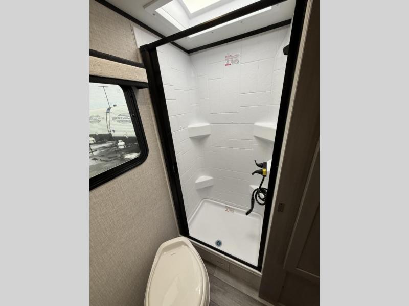 Aside from the decor options creating a fresh and modern space, the interior of this travel trailer offers a number of large windows, for plenty of fresh light and an ambiance worth admiring. The windows have tinting and roller shades with reflective barriers that make for both privacy and a cooler interior. In addition, this travel trailer has a 14-inch, four-speed MaxxAir power roof vent in the main living area and another 14-inch power roof vent in the bathroom, making for easier temperature control. The Jay Feather Micro is Climate Shield™ tested and approved. It has radiant-barrier insulation in the floor, front wall, and roof, and forced heat ducts that run into the underbelly area where the holding tanks are located. Jayco tests the Jay Feather Micro to ensure it can hold ambient temperatures between 0- and 100-degrees Fahrenheit. A 60,000 BTU on-demand tankless water heater and a 55-gallon freshwater tank ensure for warmer water temperatures, even when the ground water is only 55 degrees F.