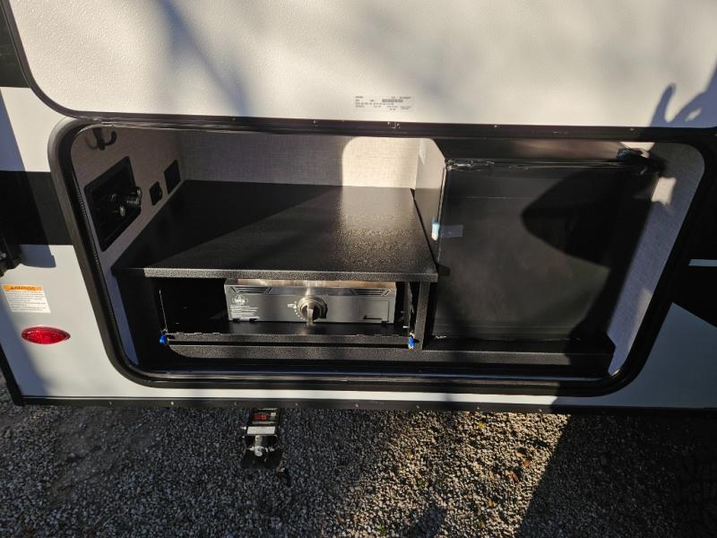 Pack up the family and head to your local state park in this cozy travel trailer for eight. The little ones will love the double-size bunks, and the full bath is close by for convenience. There is a Murphy bed up front that you can fold up each morning to relax on the sofa. If you have any other guests, they can sleep on the U-shaped dinette within the slide out. This model includes a three burner cooktop and a microwave oven, plus an outside kitchen to give the chef a choice where to cook. The 15' power awning will provide shade while the meal is being made, and there is exterior storage for your camp chairs.